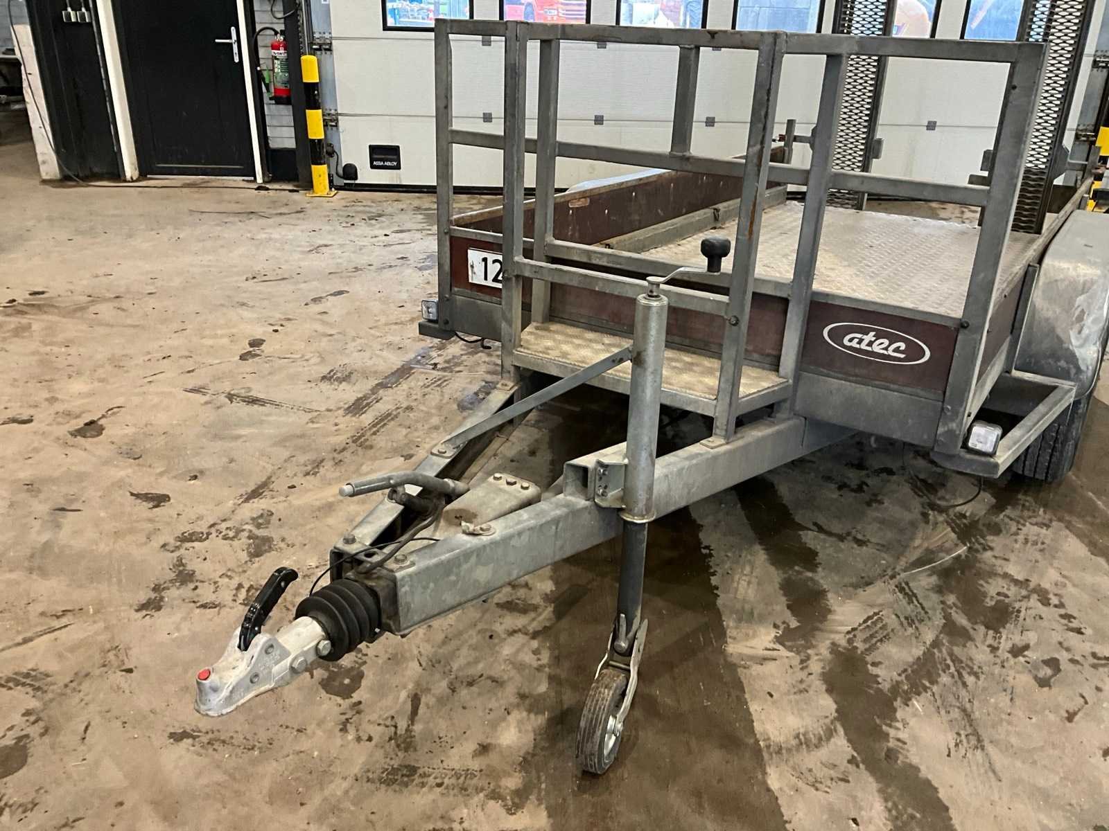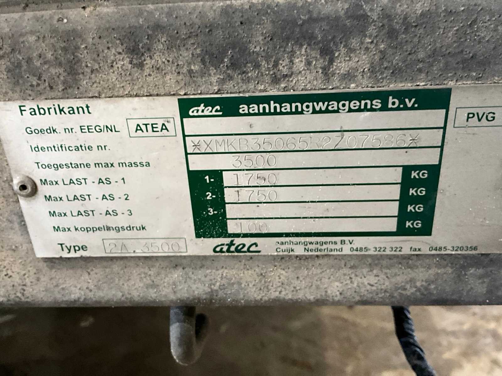 Voorzien van oprijplaten Merk: Atec Type: 2A 3500 Bouwjaar: 2001 Chassisnummer: XMKB35065R2707586 Aantal assen: 2 Laadbak afmeting l: 300cm Laadbak afmeting b: 140cm Ledig gewicht: 760kg Laadvermogen: 2740kg Datum eerste toelating: 2001-05-09 Datum eerste toelating (NL): 2001-05-09 Kenteken: WB-GP-08 Hoogte: 210cm Lengte: 465cm Breedte: 200cm