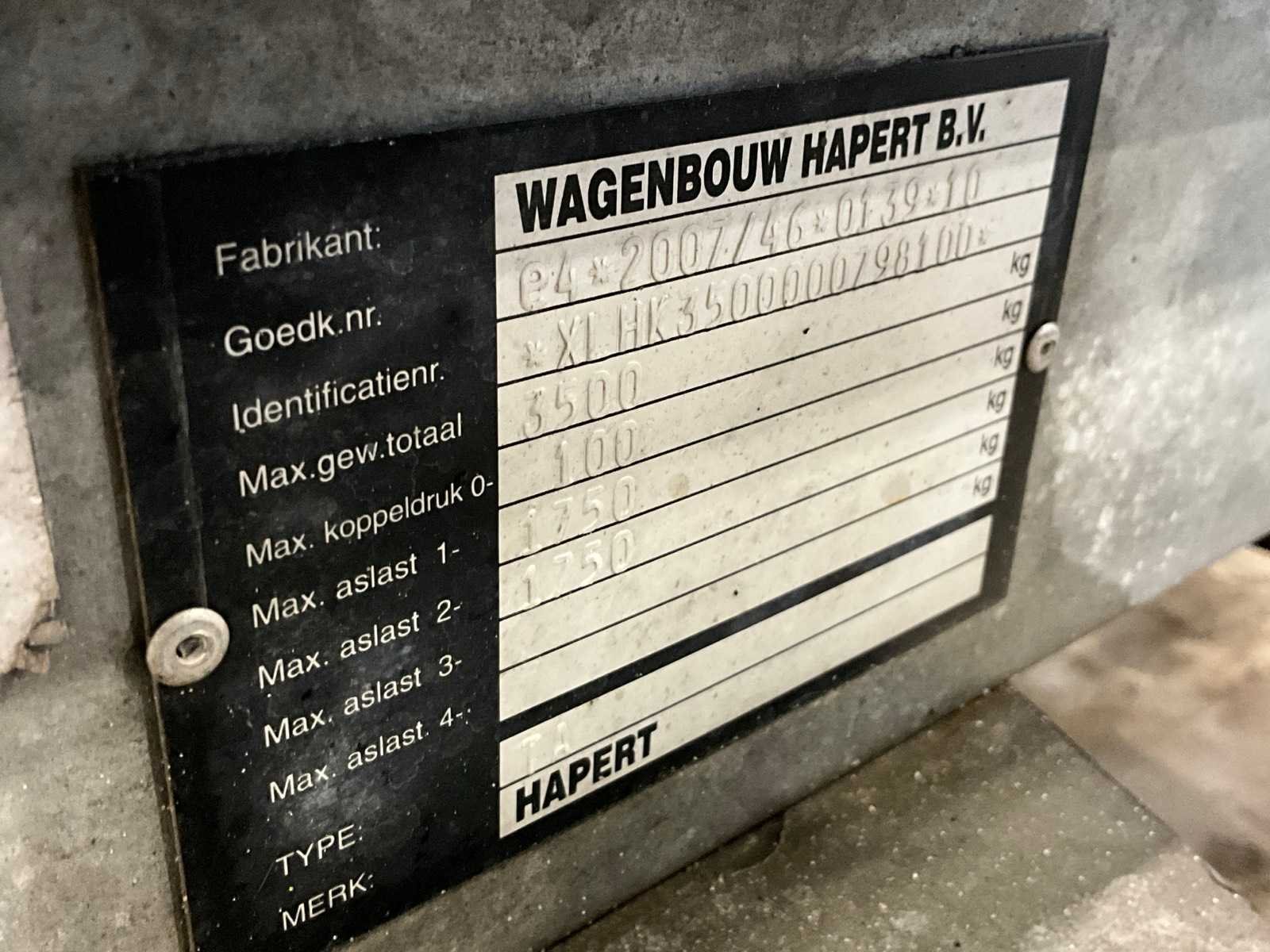 Merk: Hapert Type: TA Bouwjaar: 2017 Chassisnummer: XLHK3500000798100 Aantal assen: 2 Laadbak afmeting l: 305cm Laadbak afmeting b: 150cm Ledig gewicht: 506kg Laadvermogen: 2994kg Datum eerste toelating: 2017-02-03 Datum eerste toelating (NL): 2017-02-03 Kenteken: 25-WP-VD Hoogte: 90cm Lengte: 430cm Breedte: 205cm
