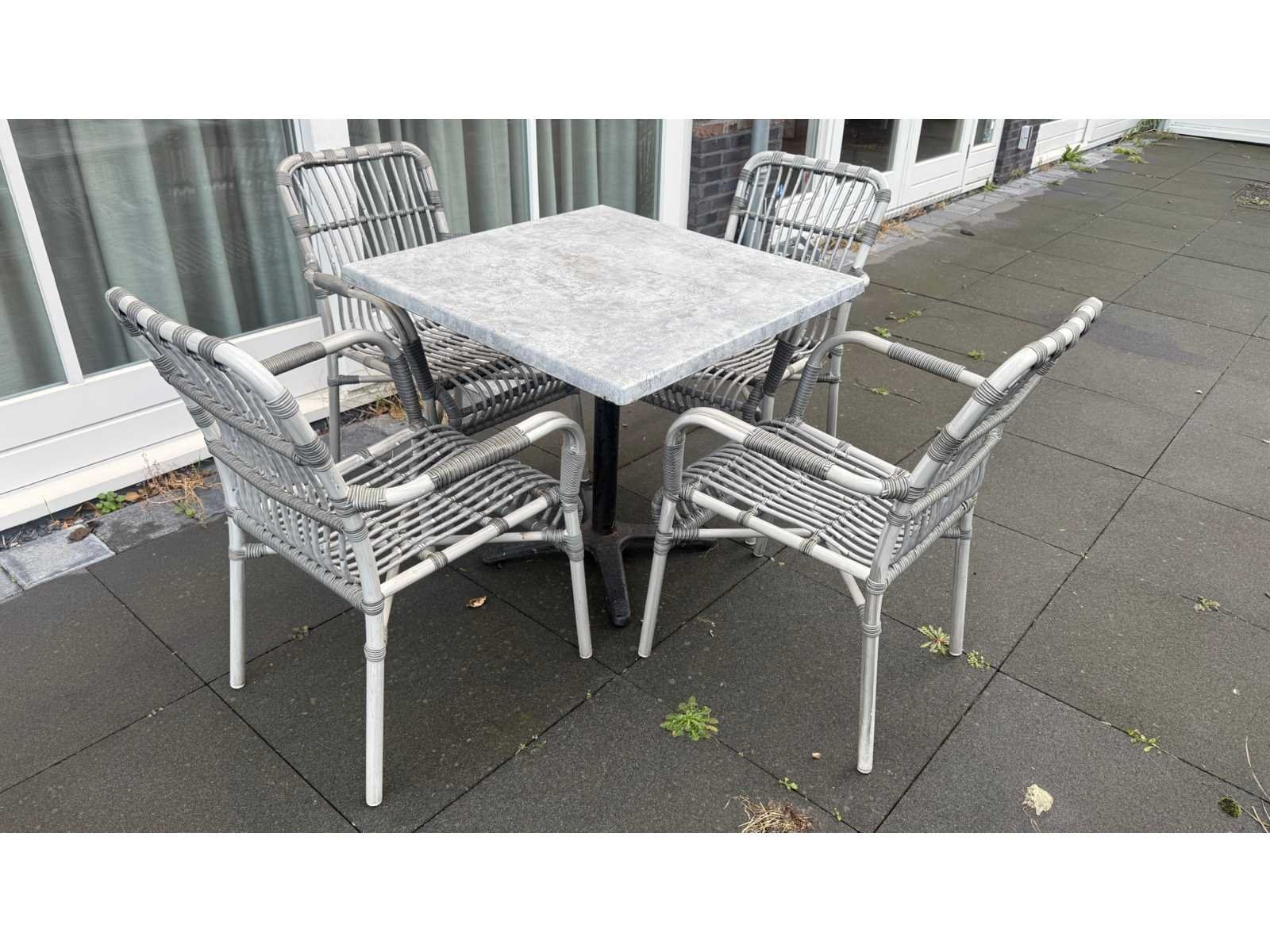 Afmetingen ca. 8 x tafel 80 x 80 x 75 cm, 7 x tafel ca. 70 x 70 x 75 cm en 46 stoelen. Merk: Werzalit