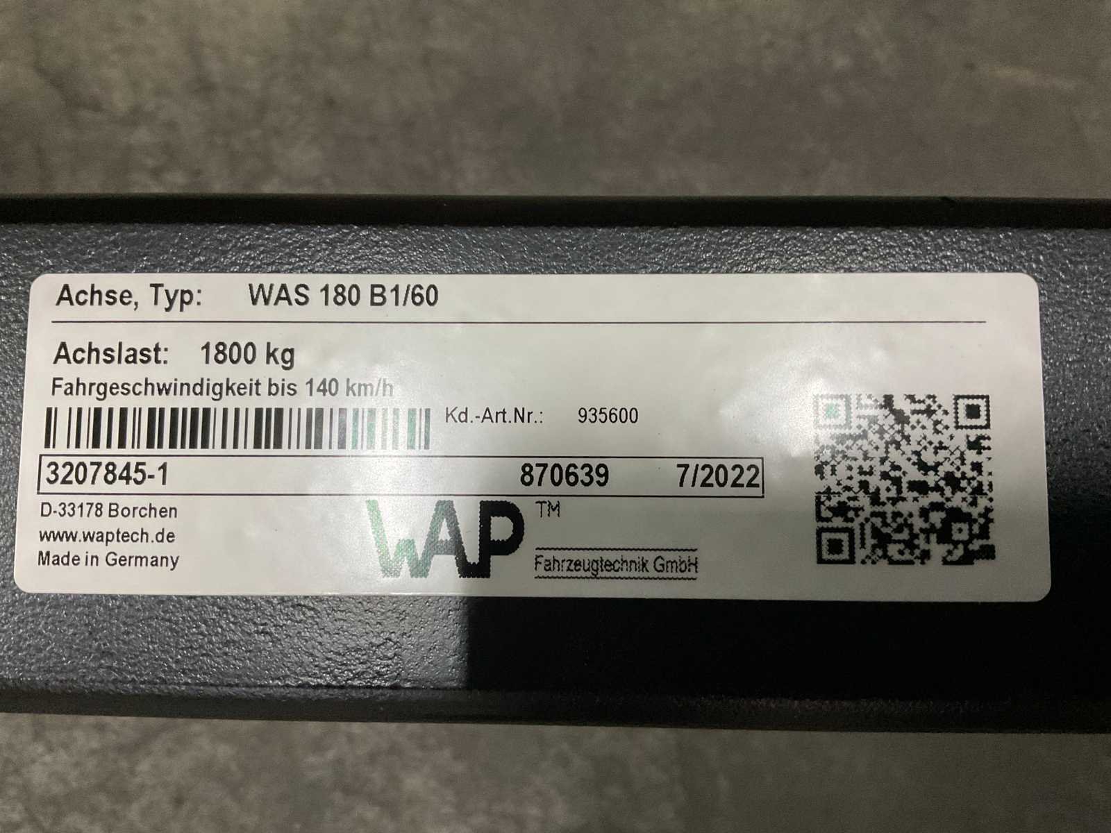 Bestaande uit: 10x oplooprem 35/35.4 ton, maximum massa 1750-3500 kg, maximum kogelgewicht 150 kg, bouwjaar 2023; 20x as 1800 kg Star Pad 1084 bouwjaar 2022; 20x remkabel 800/990; 20x remkabel 1200/1390. Merk: WAP