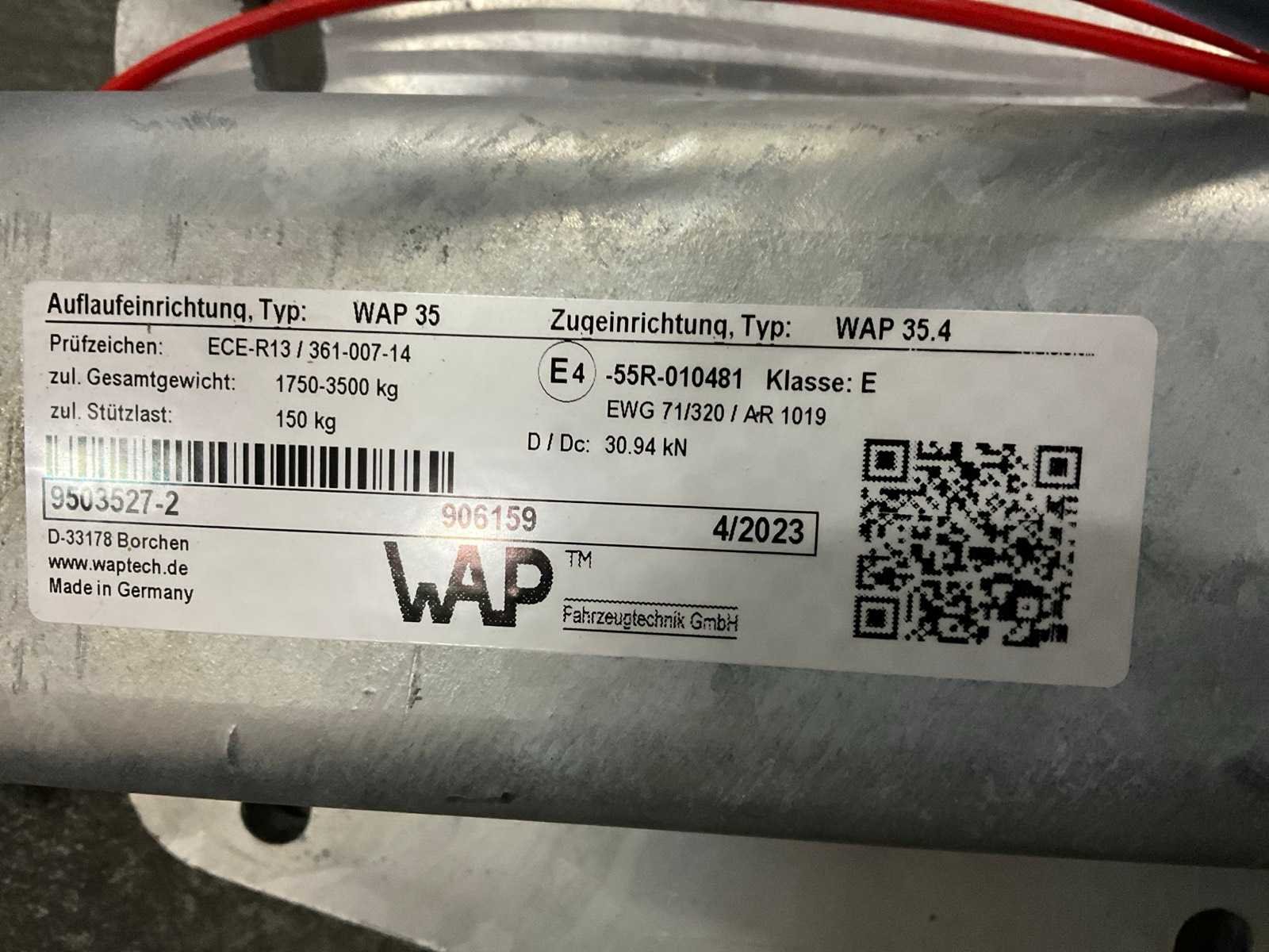Bestaande uit: 10x oplooprem 35/35.4 ton, maximum massa 1750-3500 kg, maximum kogelgewicht 150 kg, bouwjaar 2023; 30x as 1800 kg Star Pad 1084 bouwjaar 2022; 30x remkabel 800/990; 30x remkabel 900/1090; 30x remkabel 1300/1490. Merk: WAP
