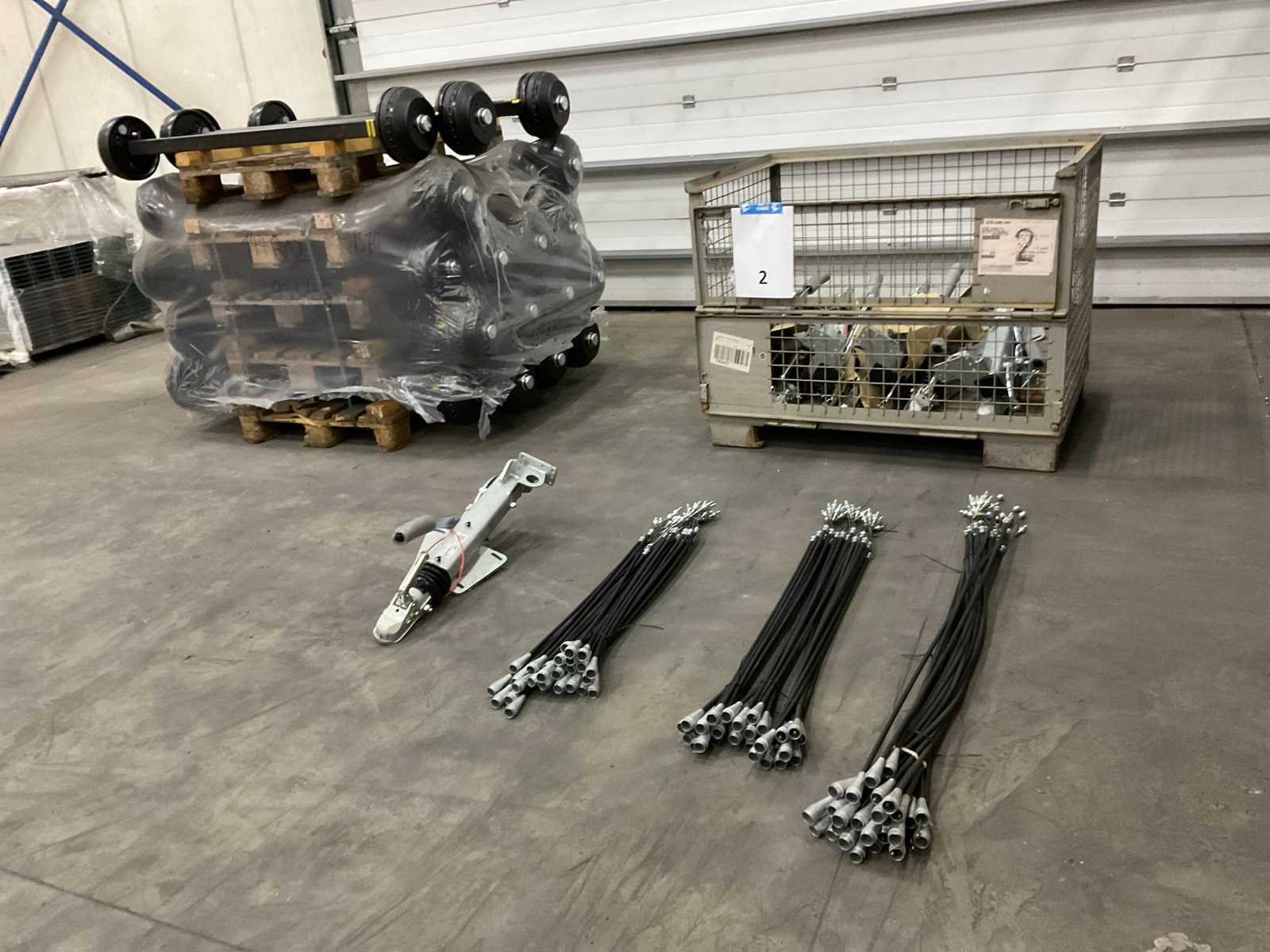 Bestaande uit: 10x oplooprem 35/35.4 ton, maximum massa 1750-3500 kg, maximum kogelgewicht 150 kg, bouwjaar 2023; 30x as 1800 kg Star Pad 1084 bouwjaar 2022; 30x remkabel 800/990; 30x remkabel 900/1090; 30x remkabel 1300/1490. Merk: WAP