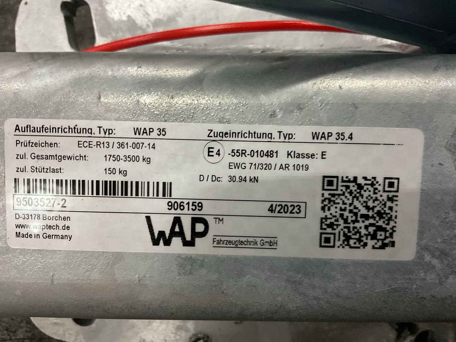 Bestaande uit: 10x oplooprem 35/35.4 ton, maximum massa 1750-3500 kg, maximum kogelgewicht 150 kg, bouwjaar 2023; 30x as 1800 kg Star Pad 1284 bouwjaar 2022; 19x remkabel 800/990; 6x remkabel 900/1090, 3x remkabel 1000/1190, 2x remkabel 1100/1290, 30x remkabel 1400/1590. Merk: WAP