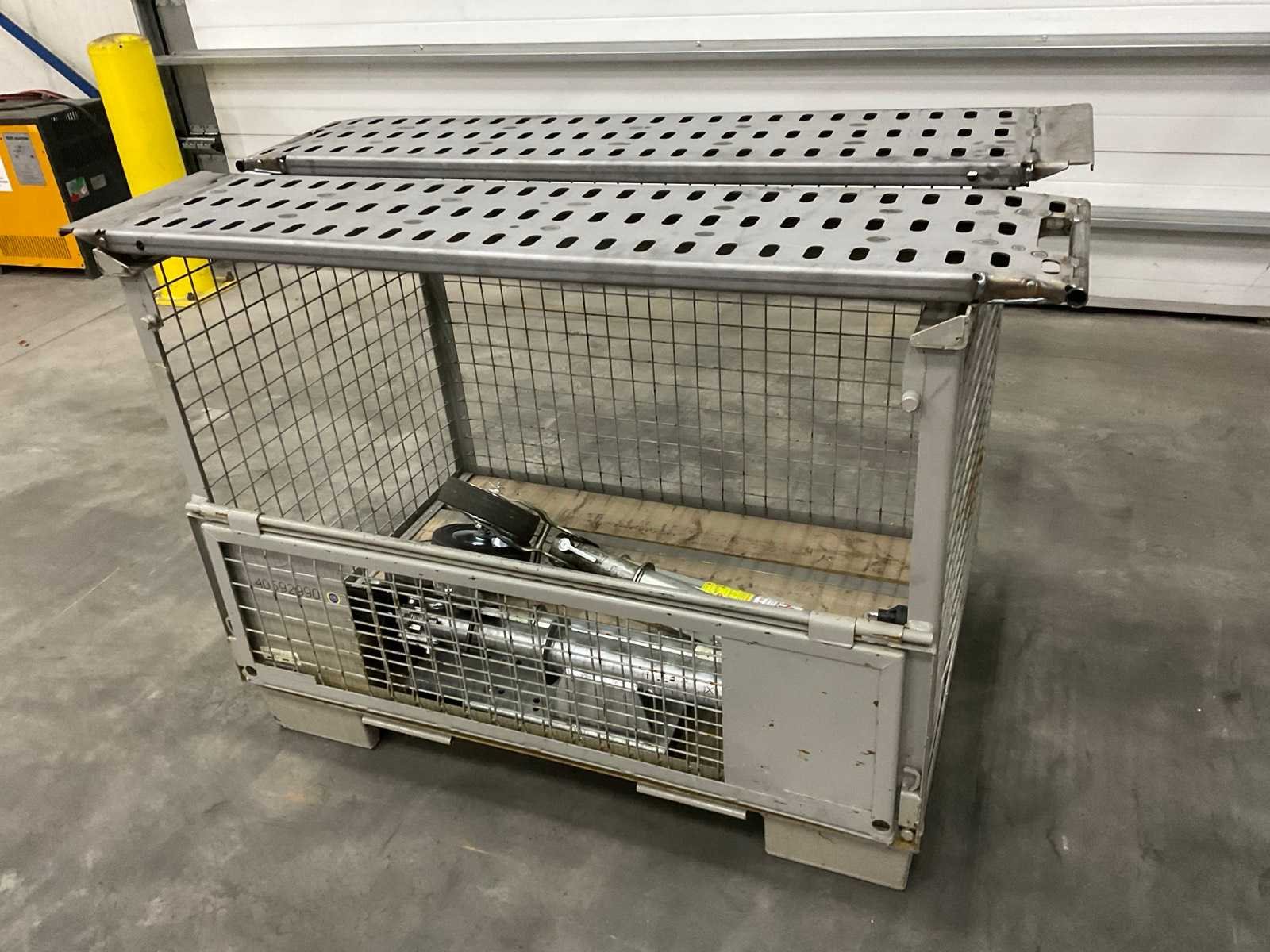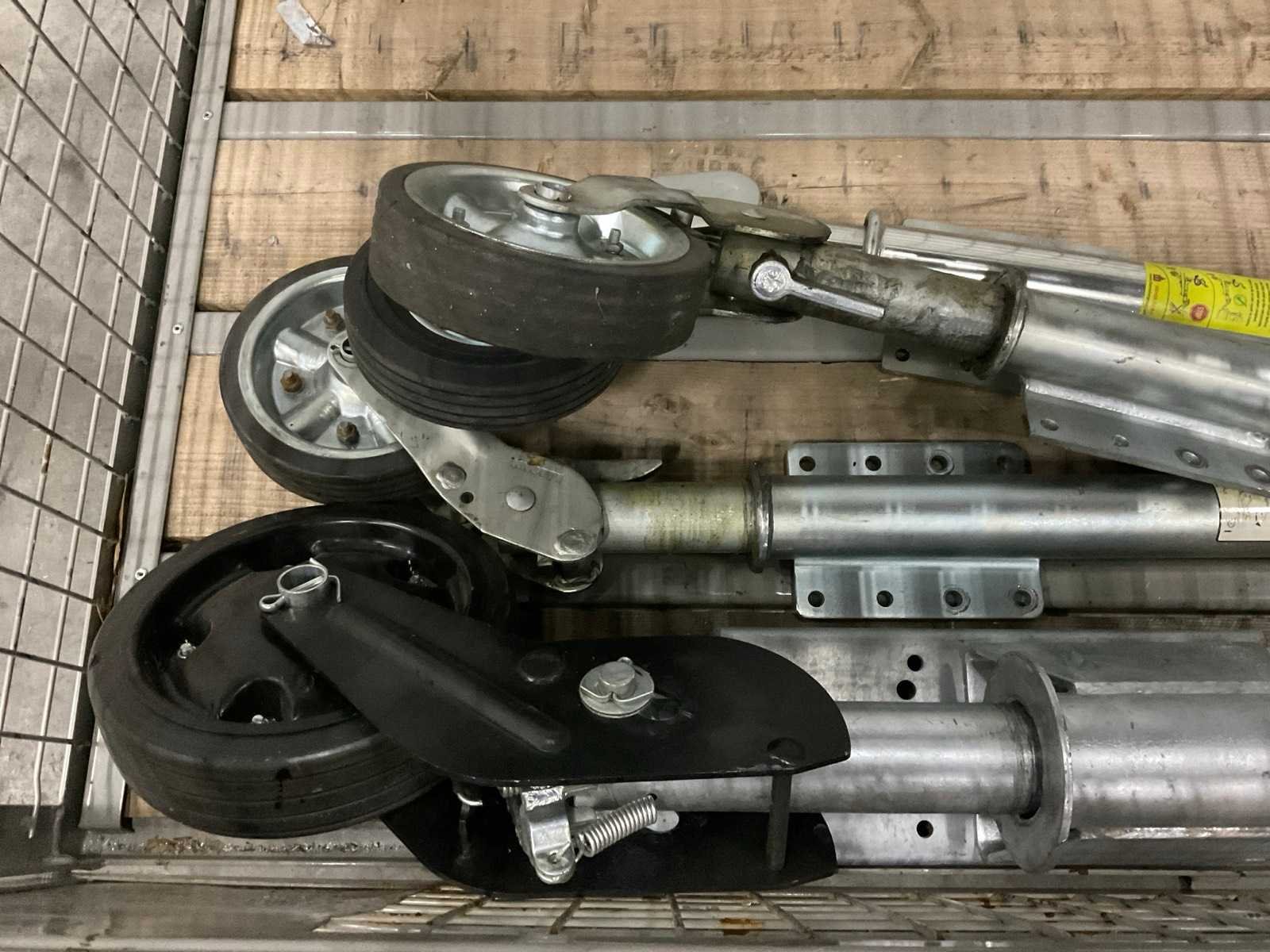 Bestaande uit: 4 neuswielen, verschillende merken, lengtes en capaciteiten; 2x niet gegalvaniseerde oprijplaten, afmetingen 1400x300 mm, oog diameter circa 20 mm.