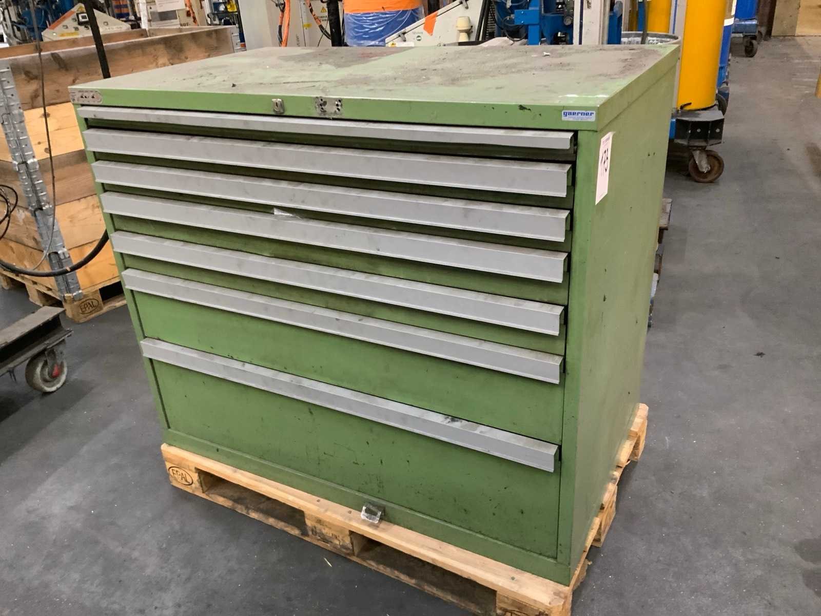Voorzien van 6 laden, met inhoud (bevat reserveonderdelen voor Reinhardt kitmachines) Merk: Gaerner Kleur: groen Lengte: 120 Breedte: 72cm Hoogte: 100cm
