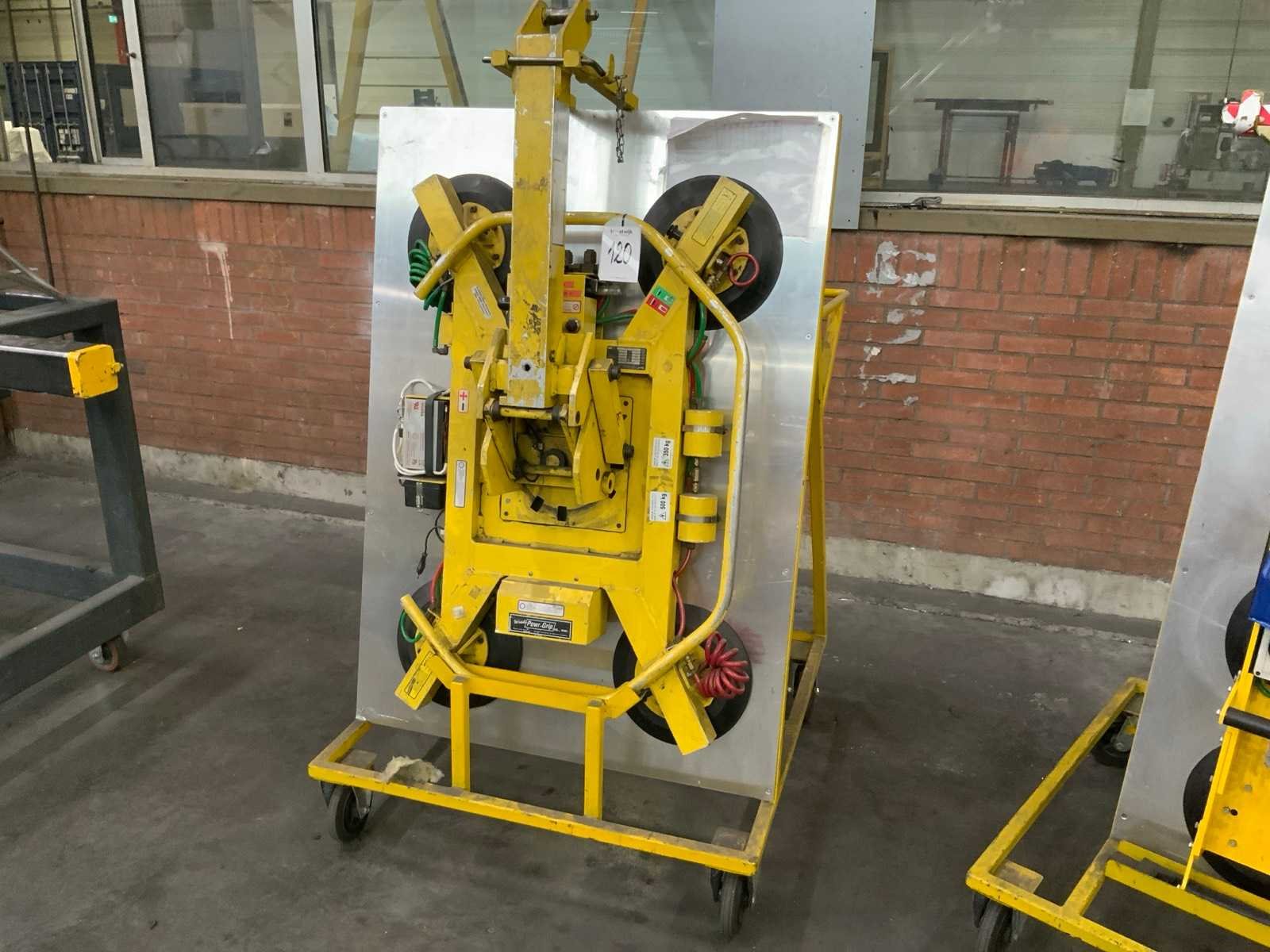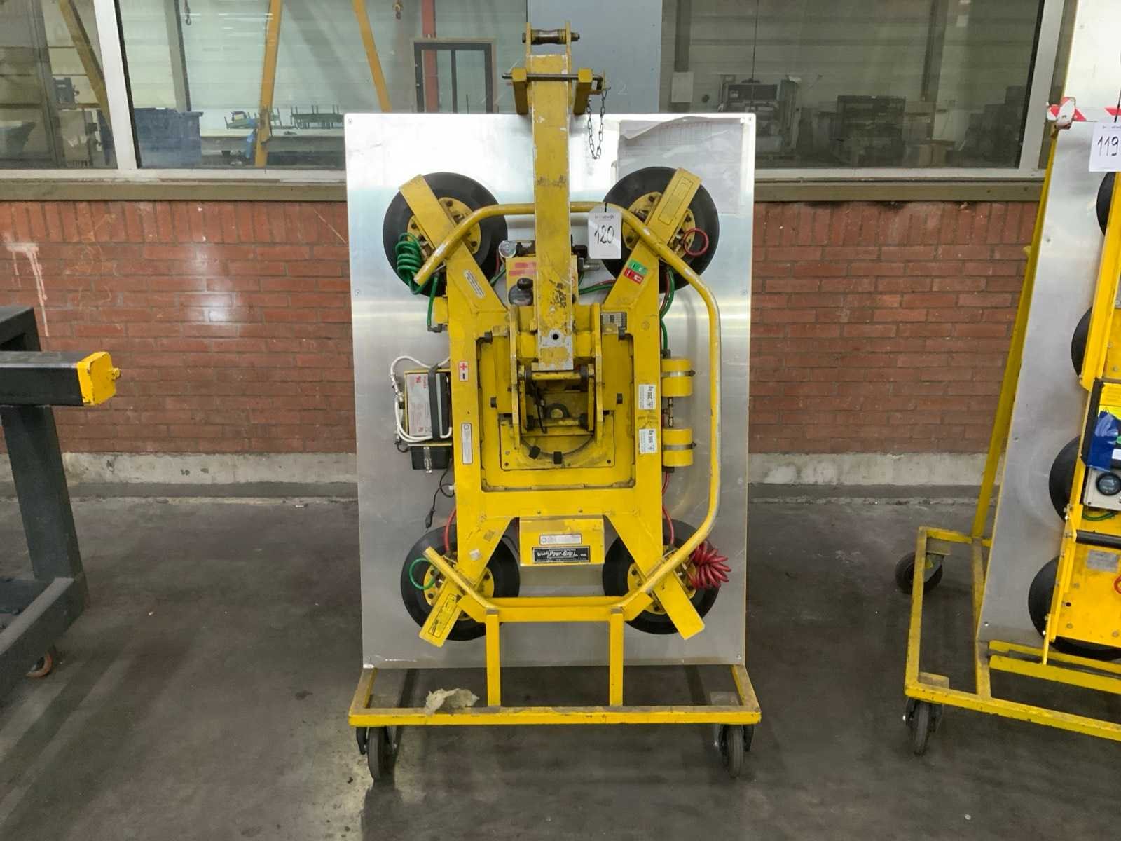 Accu 12 volt, inclusief lader, 2 extra zuignappen en verrijdbare transportbok Merk: Power-Grip Bouwjaar: 2004 Serienummer: 20040673 Hijsvermogen: 500kg Afmeting l: 1430mm Afmeting b: 800mm Afmeting h: 350mm Eigen gewicht: 86kg Totale afmeting L: 1000mm Totale afmeting Breedte: 1000mm Totale afmeting Hoogte: 1800mm