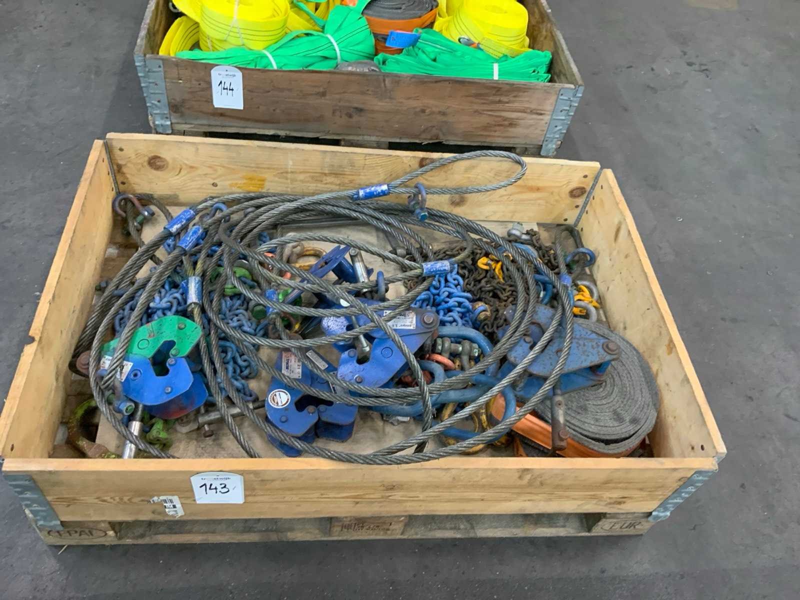 Waaronder: balkklemmen, stalen stroppen en hijskettingen, inclusief pallet