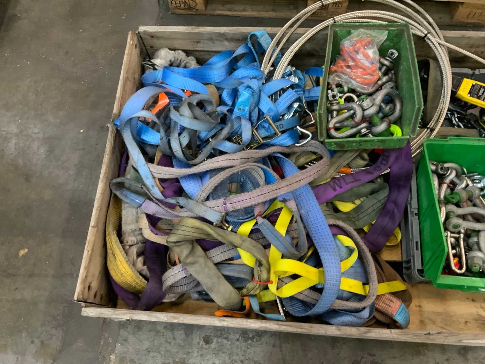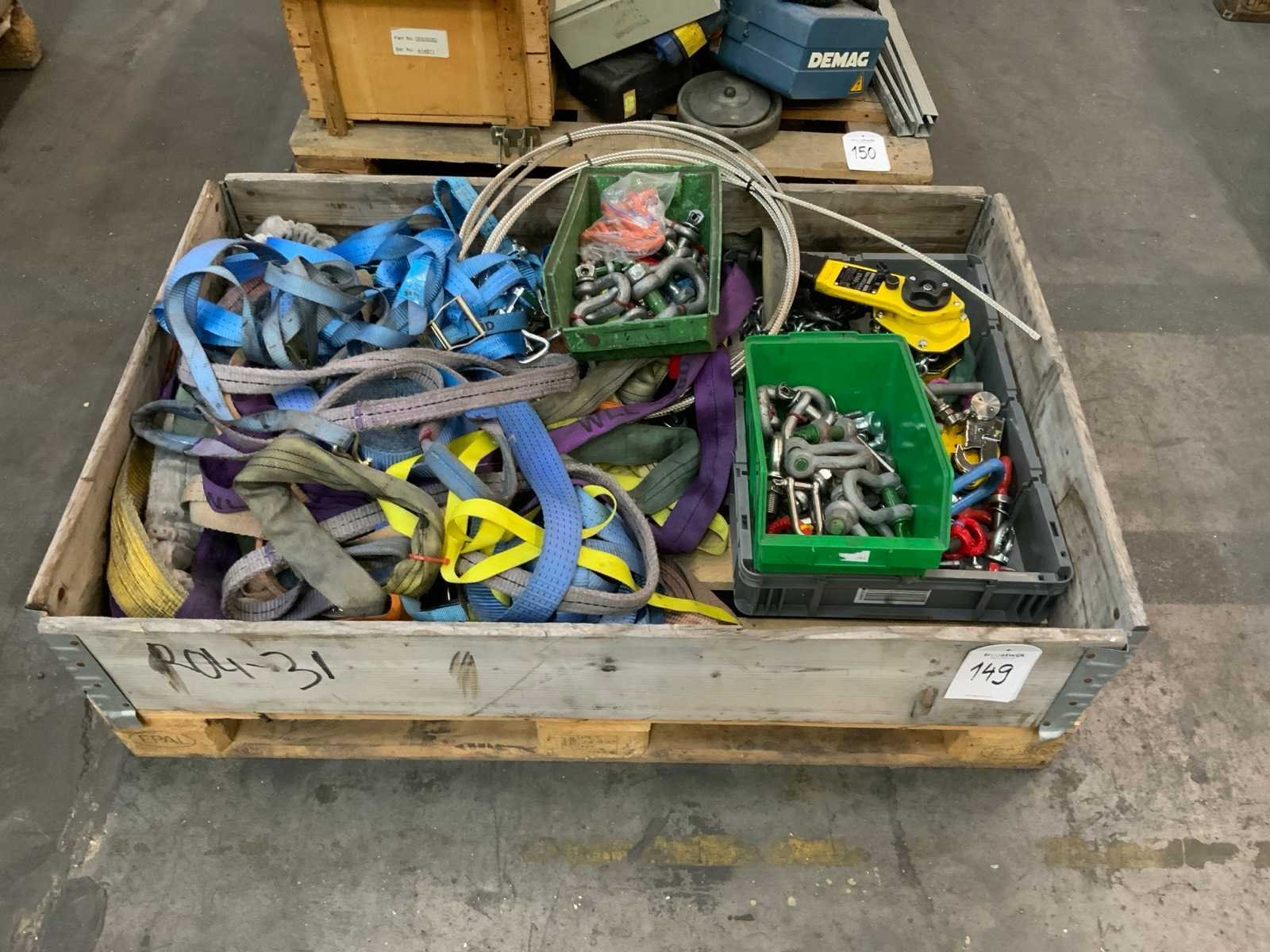 Waaronder: polyester hijsbanden, harpsluitingen 1 rateltakel, hijsogen, 1 platenhijsklem, inclusief pallet