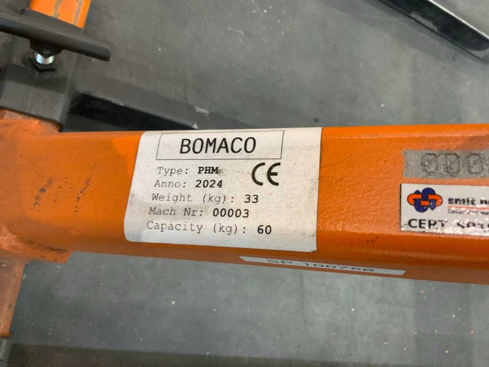 Voorzien van verstelbare vorken Merk: Bomaco Hijsvermogen: 60kg Afmeting l: 1000mm Afmeting b: 570mm Afmeting h: 500mm Eigen gewicht: 33kg