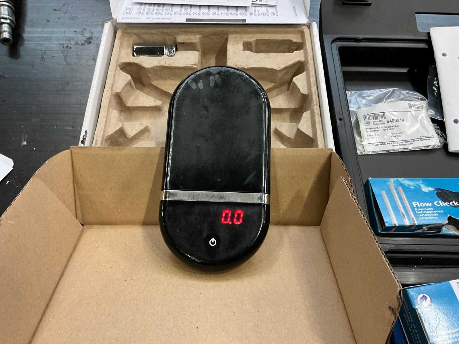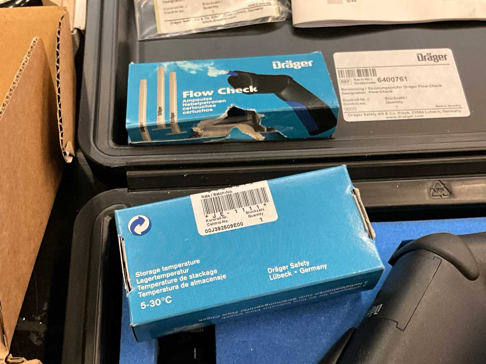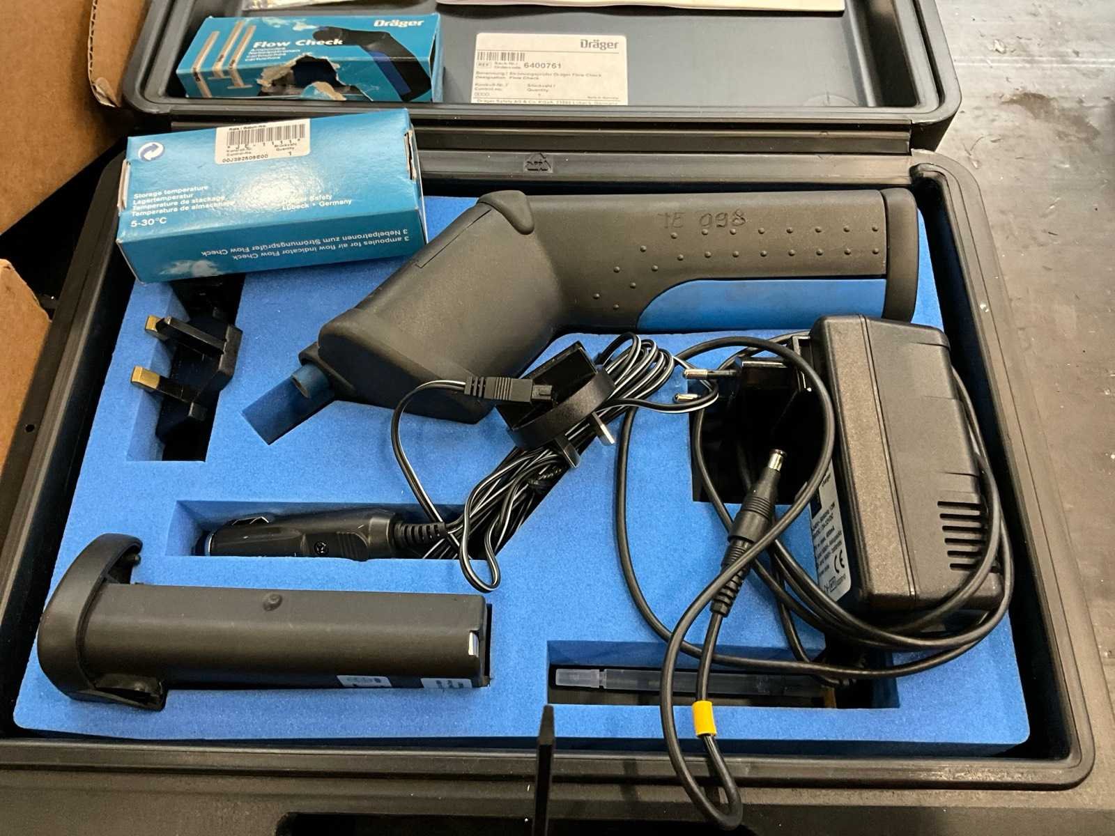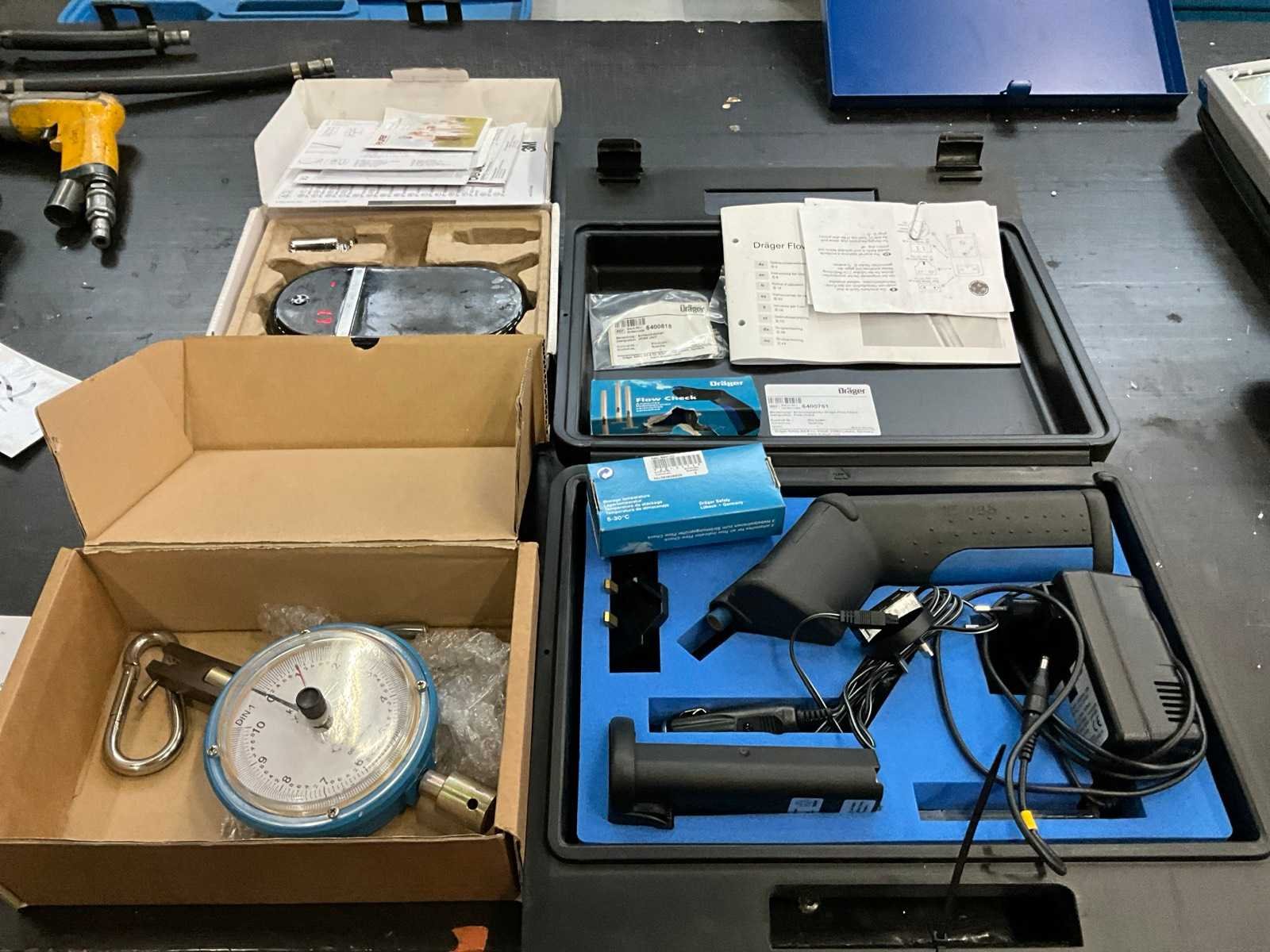 Waaronder 1x Dräger Flow Check luchtstroomindicator in kunststof koffer; 1x analoge hangweegschaal dynamometer kg; 1x precisieweegschaal;