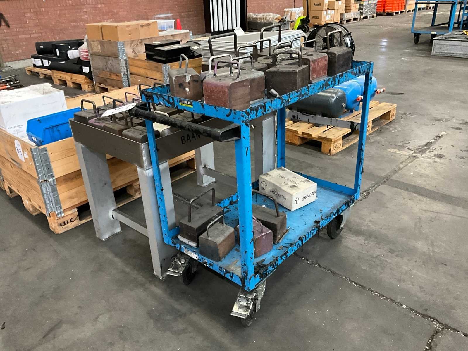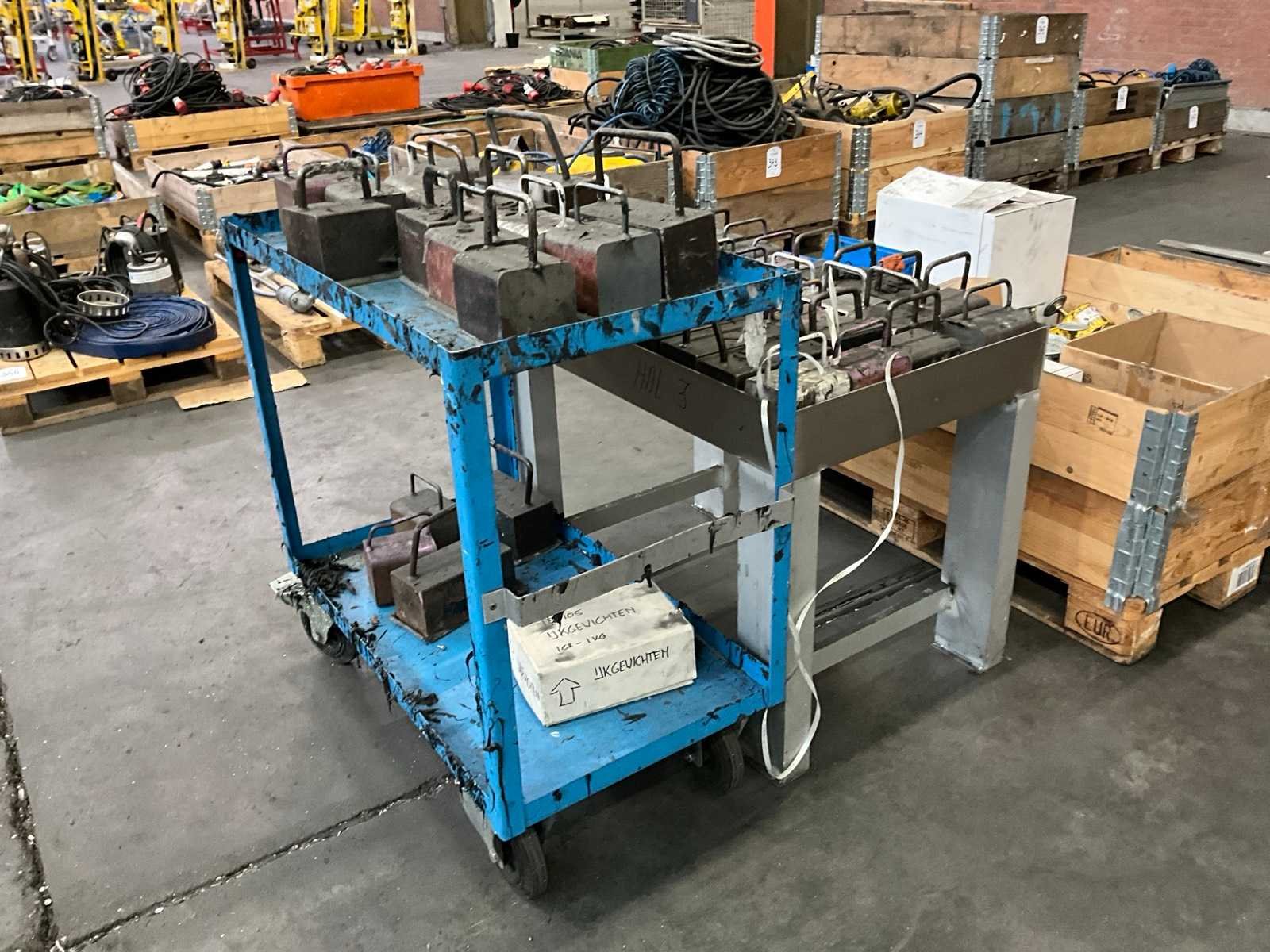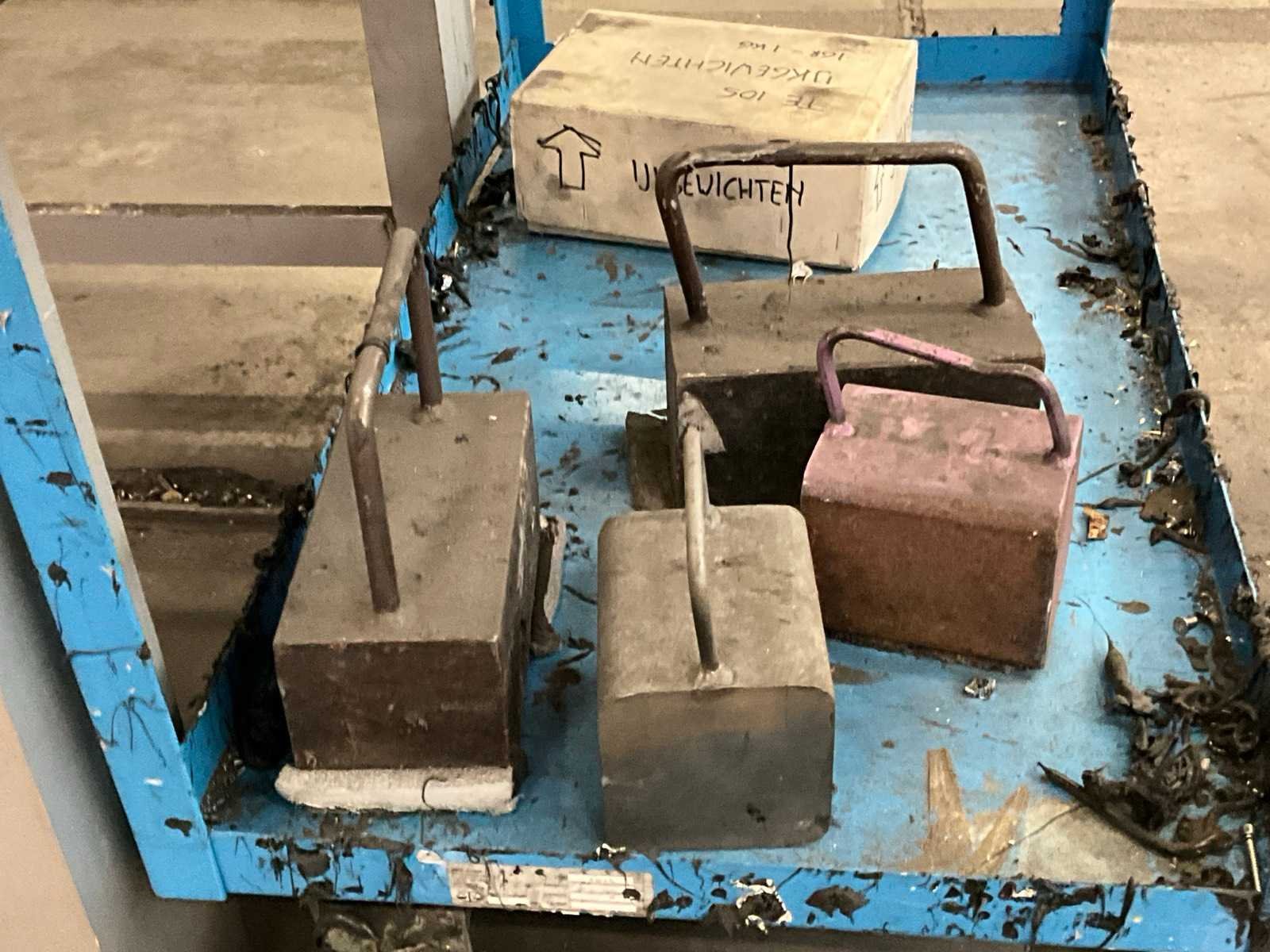 Waaronder 1x set ijkgewichten 1 - 1000 gram in doos; 48 diverse staal gewicht blokken voorzien van draagbeugel; inclusief 1x staal magazijnwagen; 1x profielstaal rek;