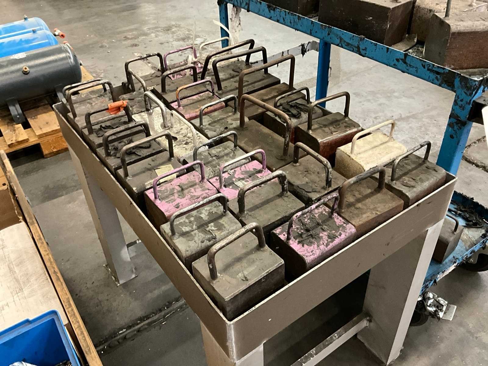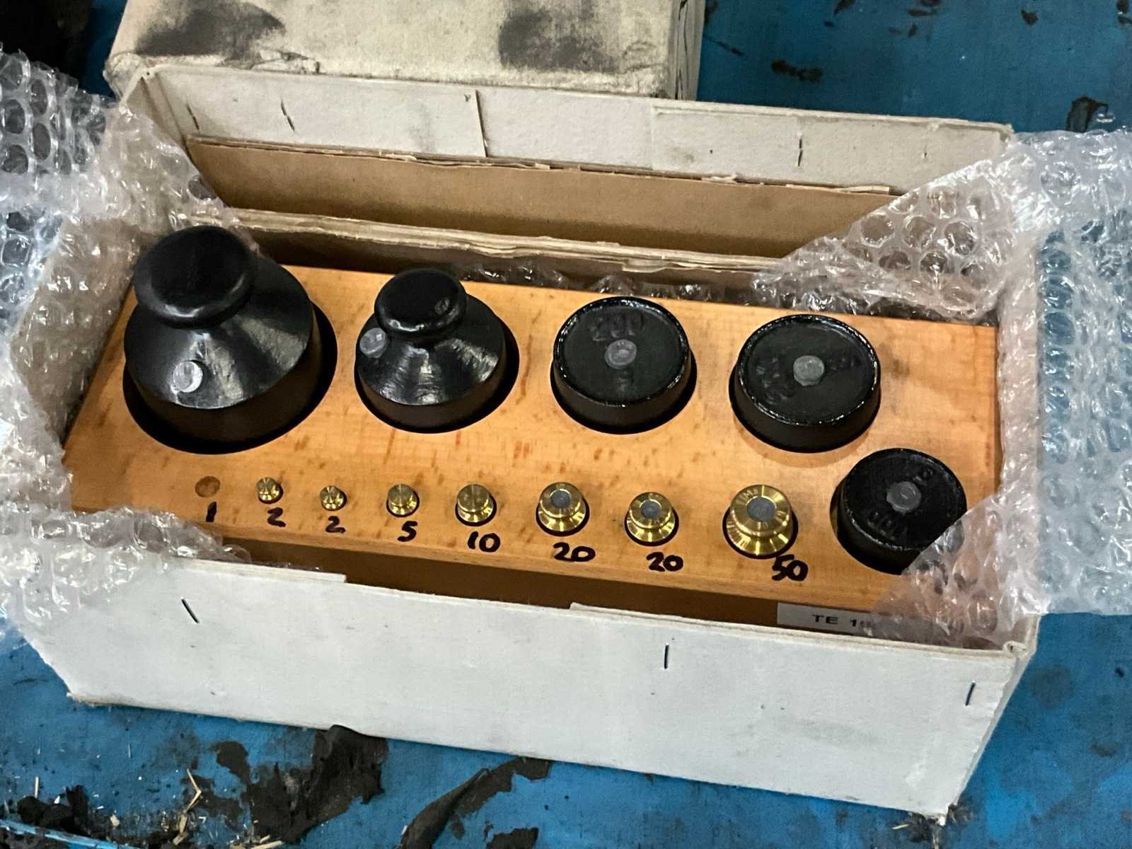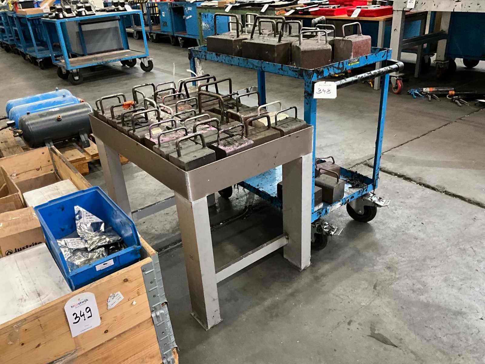 Waaronder 1x set ijkgewichten 1 - 1000 gram in doos; 48 diverse staal gewicht blokken voorzien van draagbeugel; inclusief 1x staal magazijnwagen; 1x profielstaal rek;
