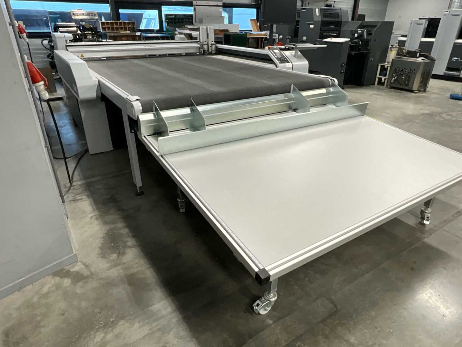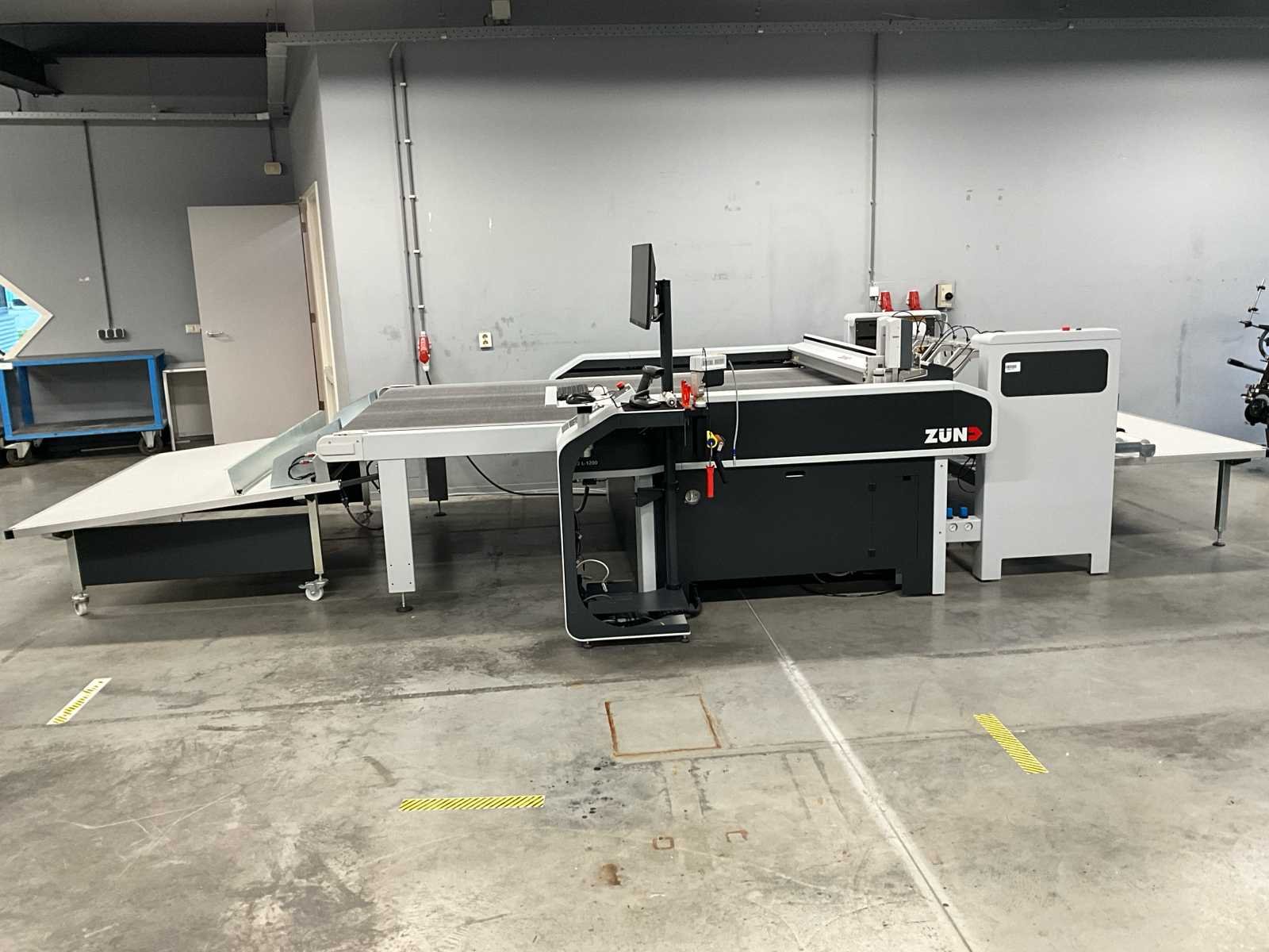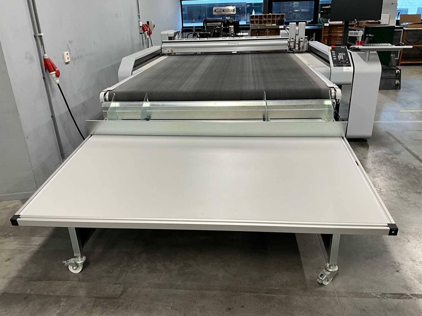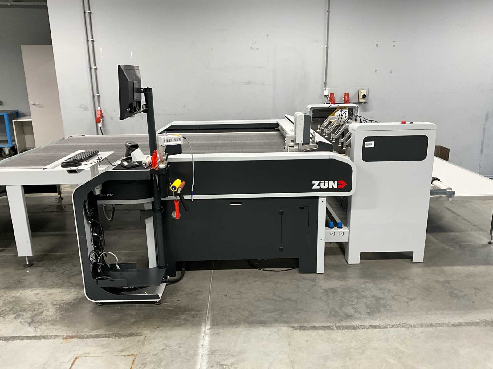 Inclusief de latenvoerer en de losstafel. Inclusief 4 gereedschappen: 1x EOT-250 snijgereedschap, 1x KCT kus-snijgereedschap, 1x UCT snijgereedschap, 1x CTT2 vouwgereedschap Totale afmetingen (LxWxH): 6000x3100x1770mm Max. Centrische belasting: 260 kg; Max. Excentrische belasting: 130 kg; Max. Schoorsteenhoogte: 200 mm; Max. Bladgrootte (lengte x breedte): 1230 x 1800 mm; Min. Bladgrootte (lengte x breedte): 210 x 297 mm; Maximale plaatdikte: 5 mm; Min. Plaatdikte: 0,15 mm; Merk: Zund Type: S3 L-1200 Bouwjaar: 2020 Serienummer: S300L120464