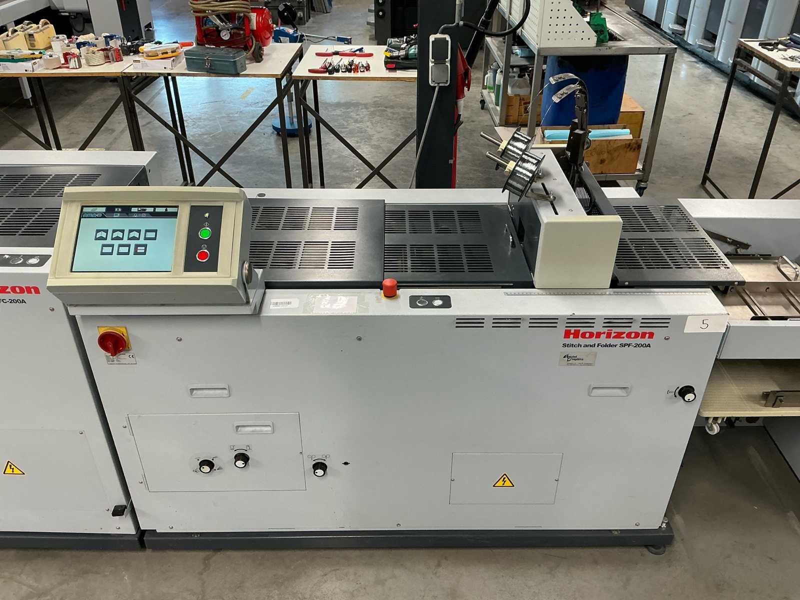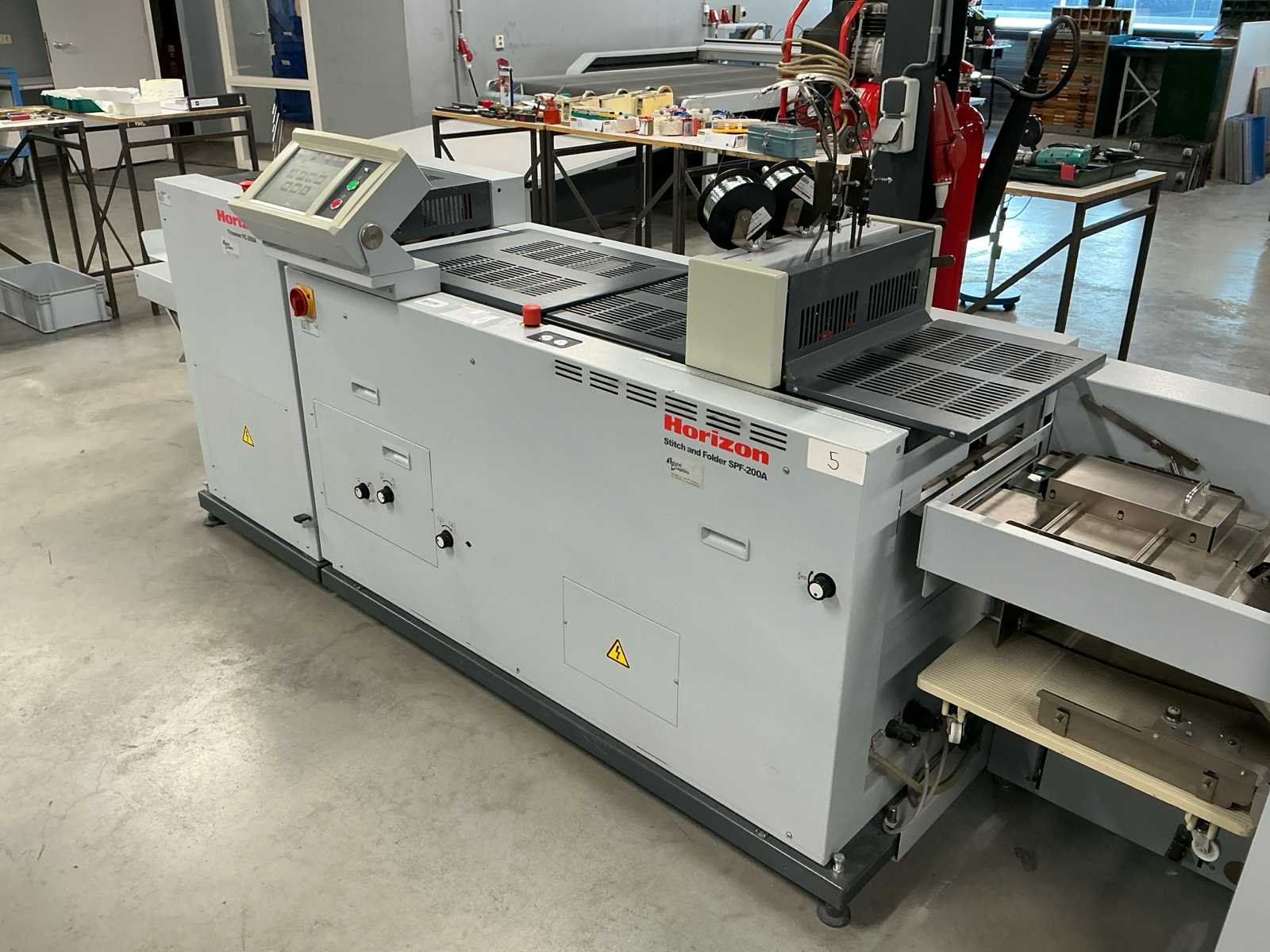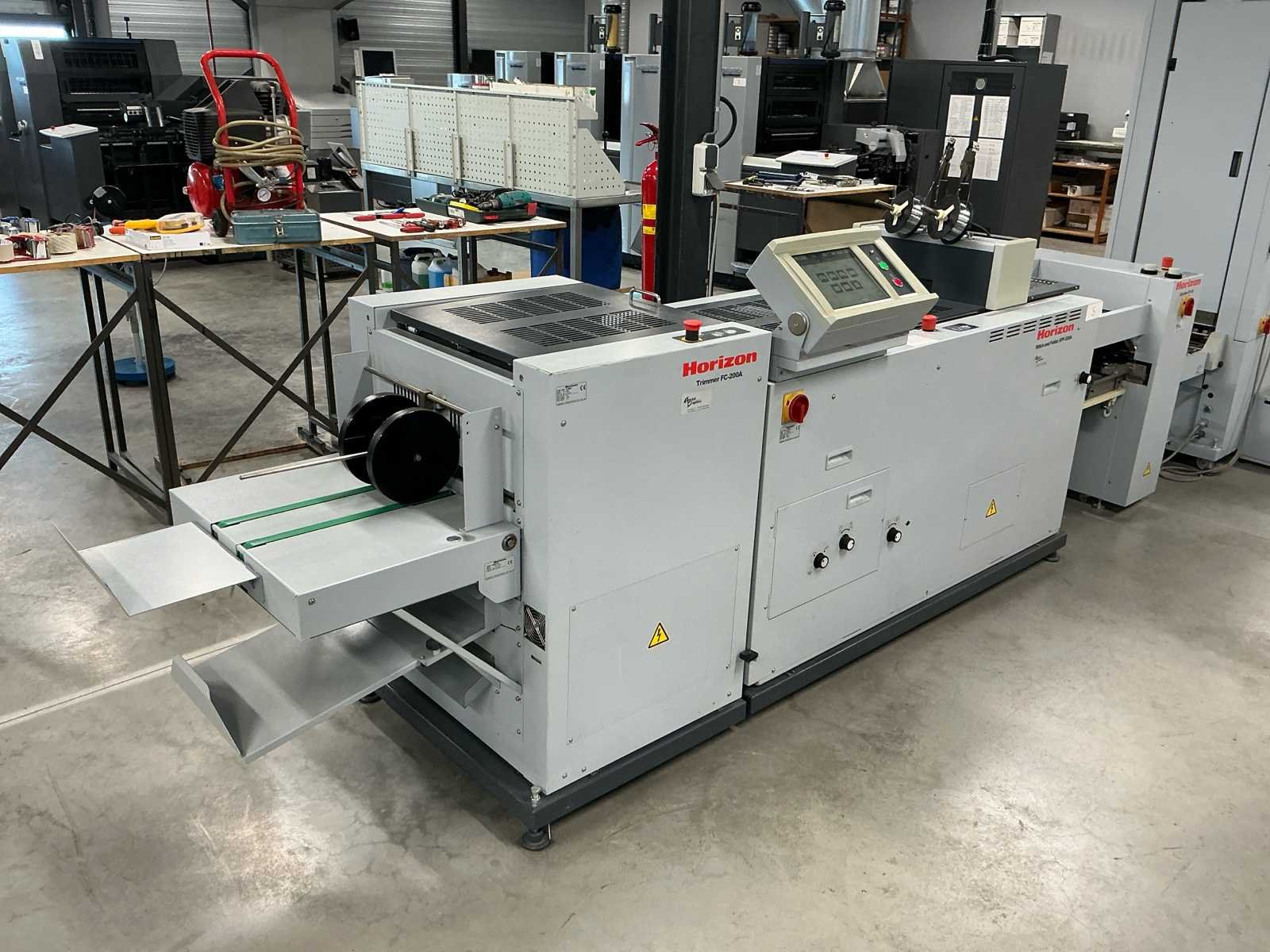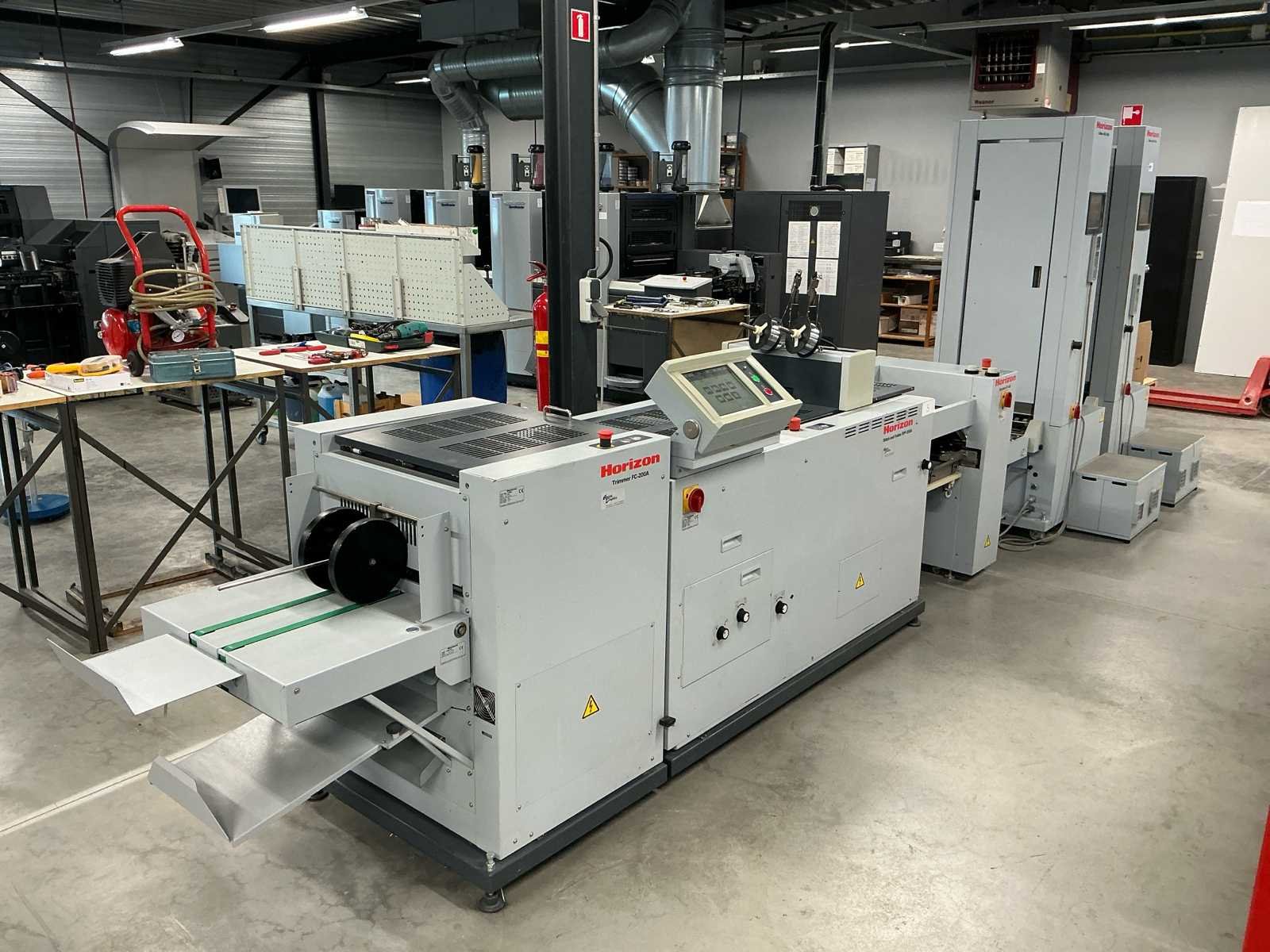 De lijn bestaat uit: 2x Horizon Collator VAC-100a 1x Horizon Stacker ST-40 1x Horizon Stitch en map SPF-200A 1x Horizon Trimmer FC-200A 1x Horizon Conveyor SC-200 Technische beschrijving: Max. Bladgrootte: 356x508 mm; Min. Bladformaat: 120x180 mm; Productiesnelheid (a4): 4000 boekjes per uur; Productiesnelheid (a5): 4500 boekjes per uur; Totaal aantal boekbanden: 4.114.983; Afmetingen (LxWxH): 5600x900x2000mm; Merk: Horizon Type: SPF-200A Serienummer: 317013