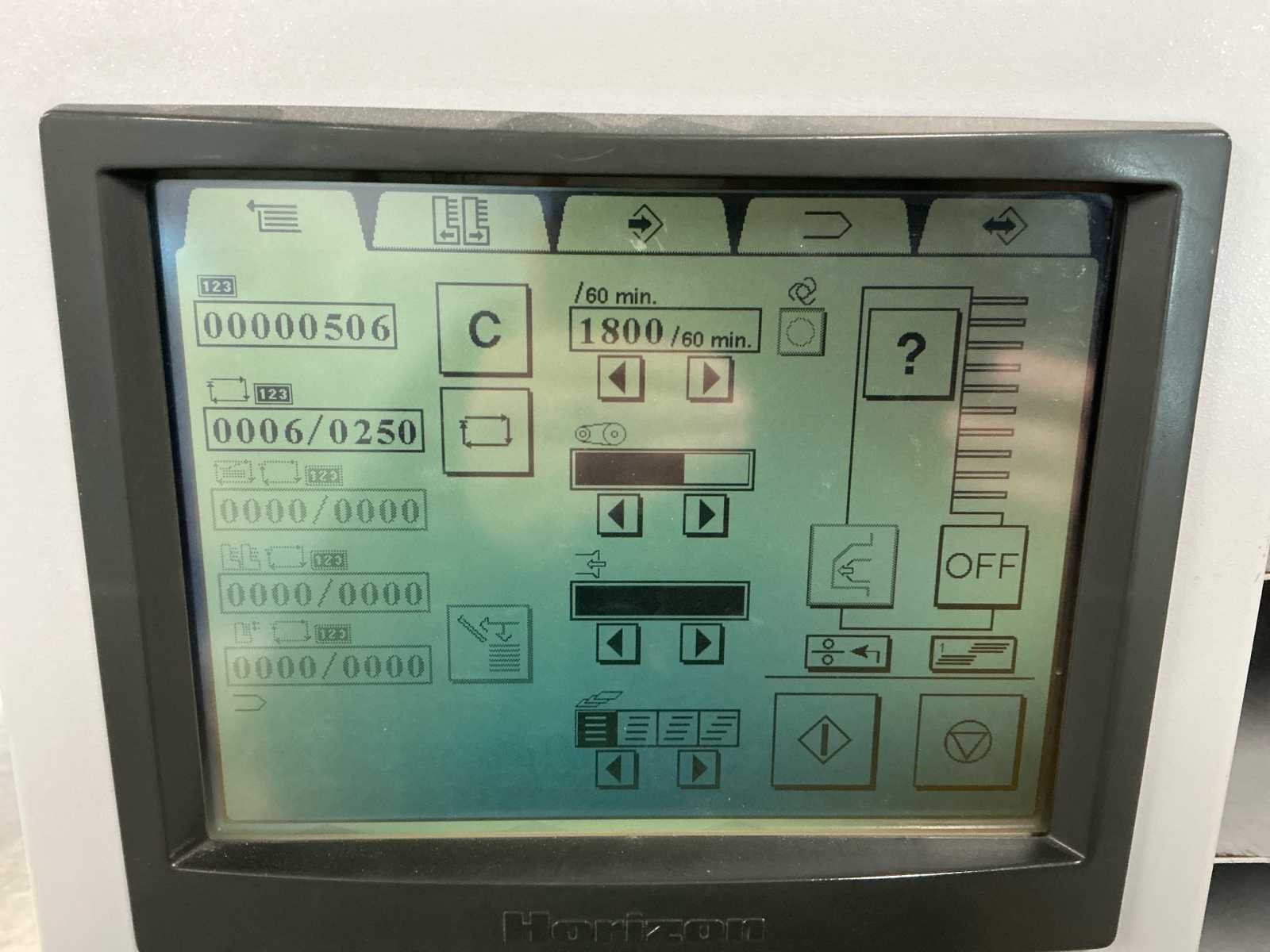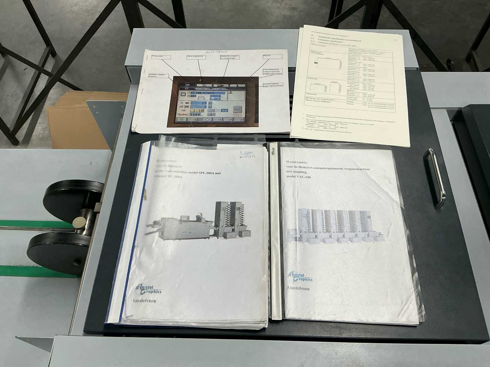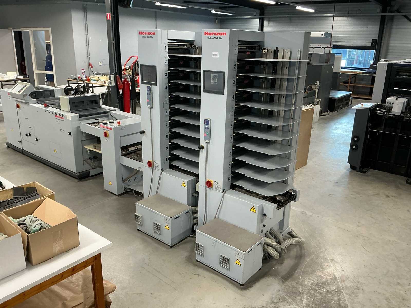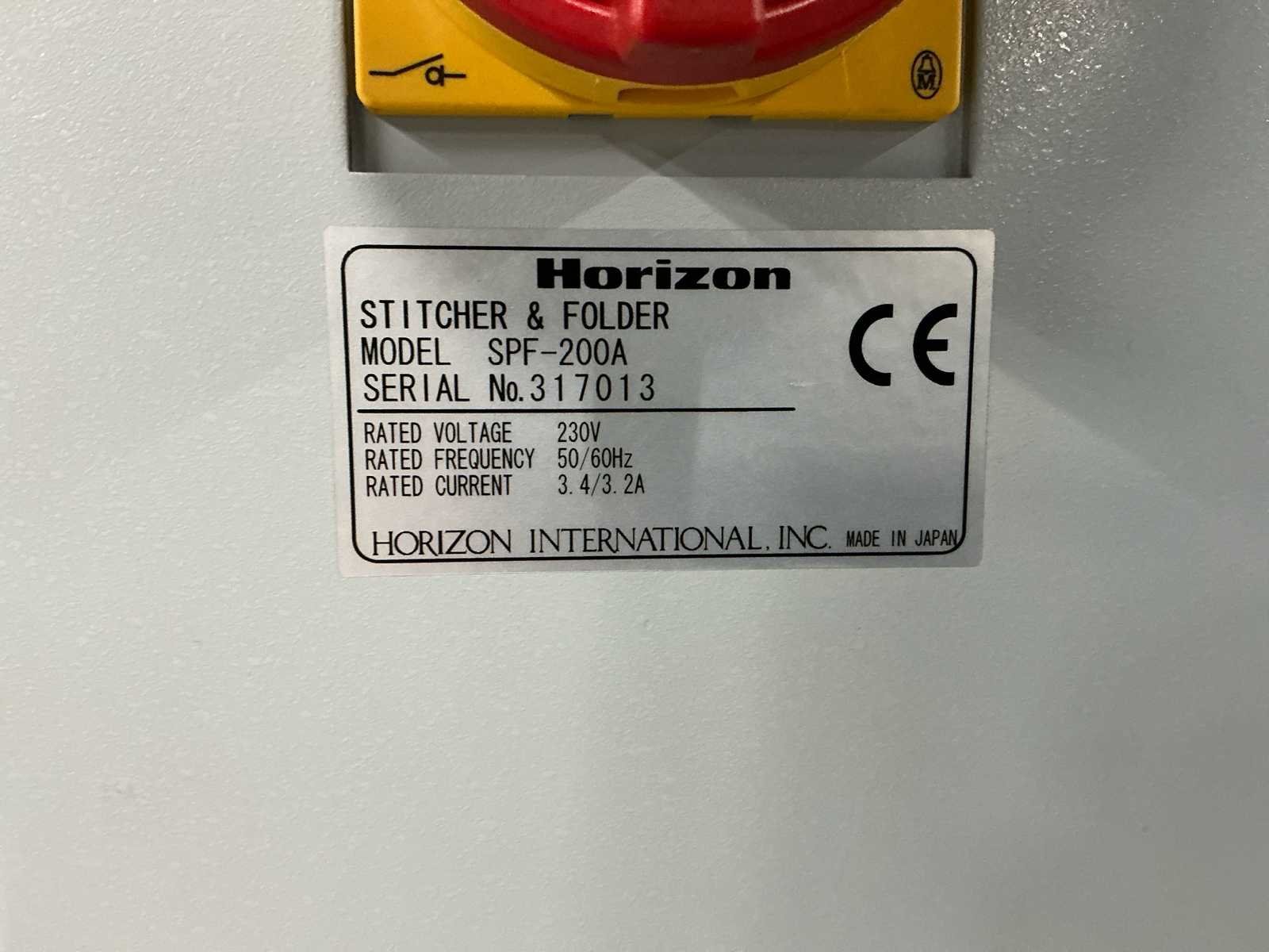 De lijn bestaat uit: 2x Horizon Collator VAC-100a 1x Horizon Stacker ST-40 1x Horizon Stitch en map SPF-200A 1x Horizon Trimmer FC-200A 1x Horizon Conveyor SC-200 Technische beschrijving: Max. Bladgrootte: 356x508 mm; Min. Bladformaat: 120x180 mm; Productiesnelheid (a4): 4000 boekjes per uur; Productiesnelheid (a5): 4500 boekjes per uur; Totaal aantal boekbanden: 4.114.983; Afmetingen (LxWxH): 5600x900x2000mm; Merk: Horizon Type: SPF-200A Serienummer: 317013