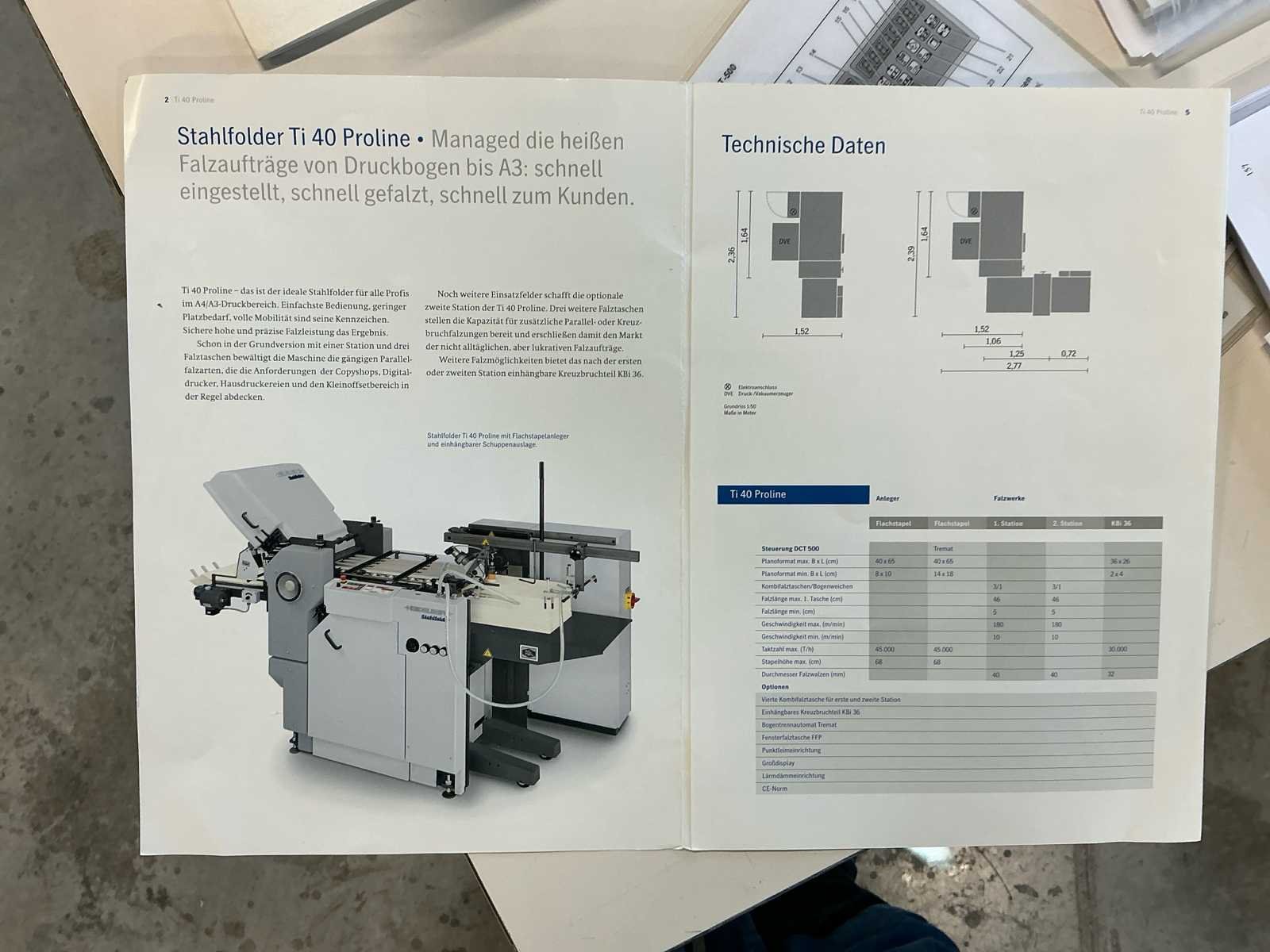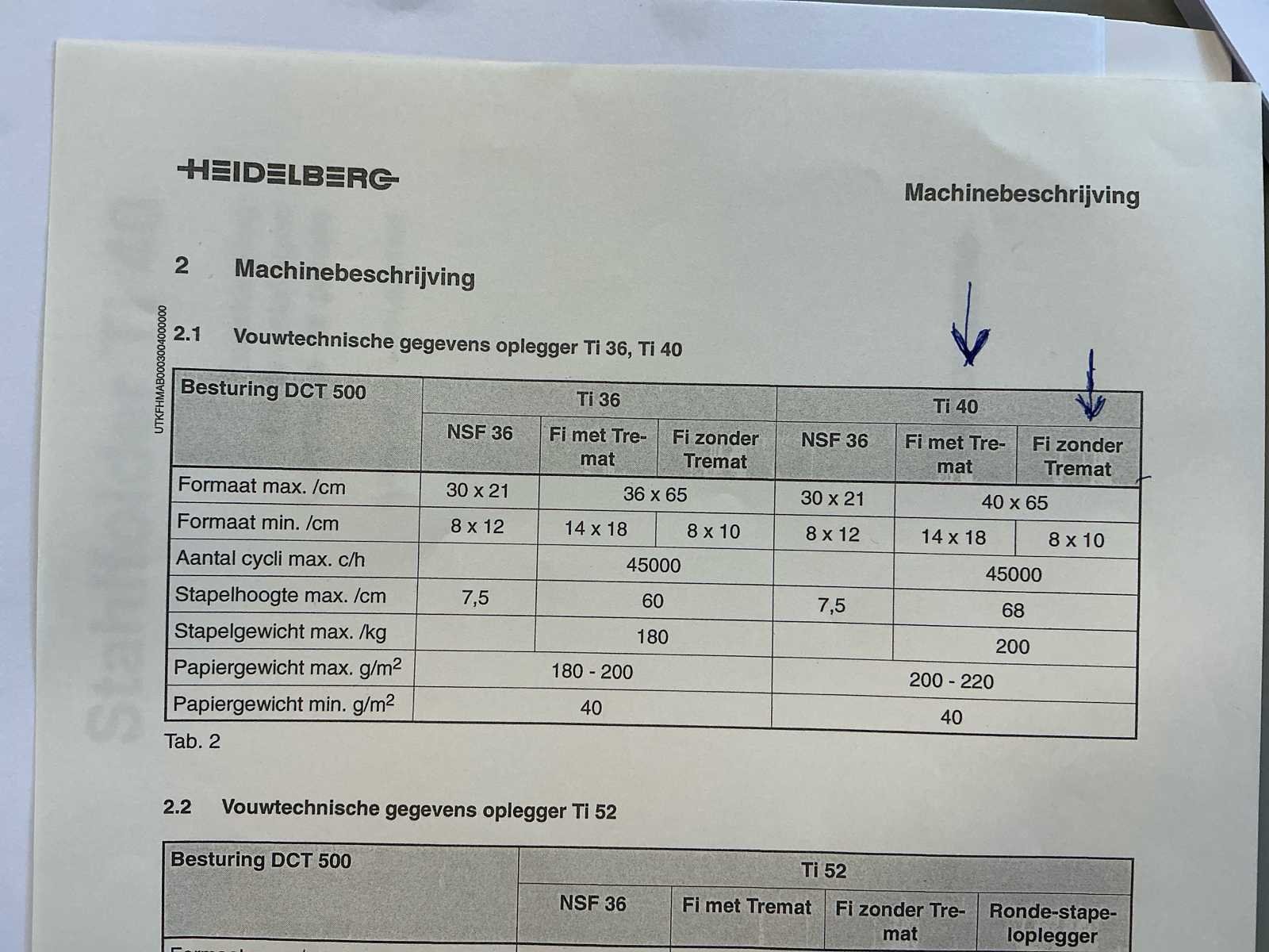 Max. Papierformaat: 400x650 mm; Min. Papierformaat: 80x100 mm; Maximale capaciteit: 45.000 c/u; Max. Stapelhoogte: 680 mm; Max. Stapelgewicht: 200 kg; Afmetingen (LxWxH): 3000x1000x1550 mm; Merk: Heidelberg Type: Stahlfolder TI-40 Bouwjaar: 2007