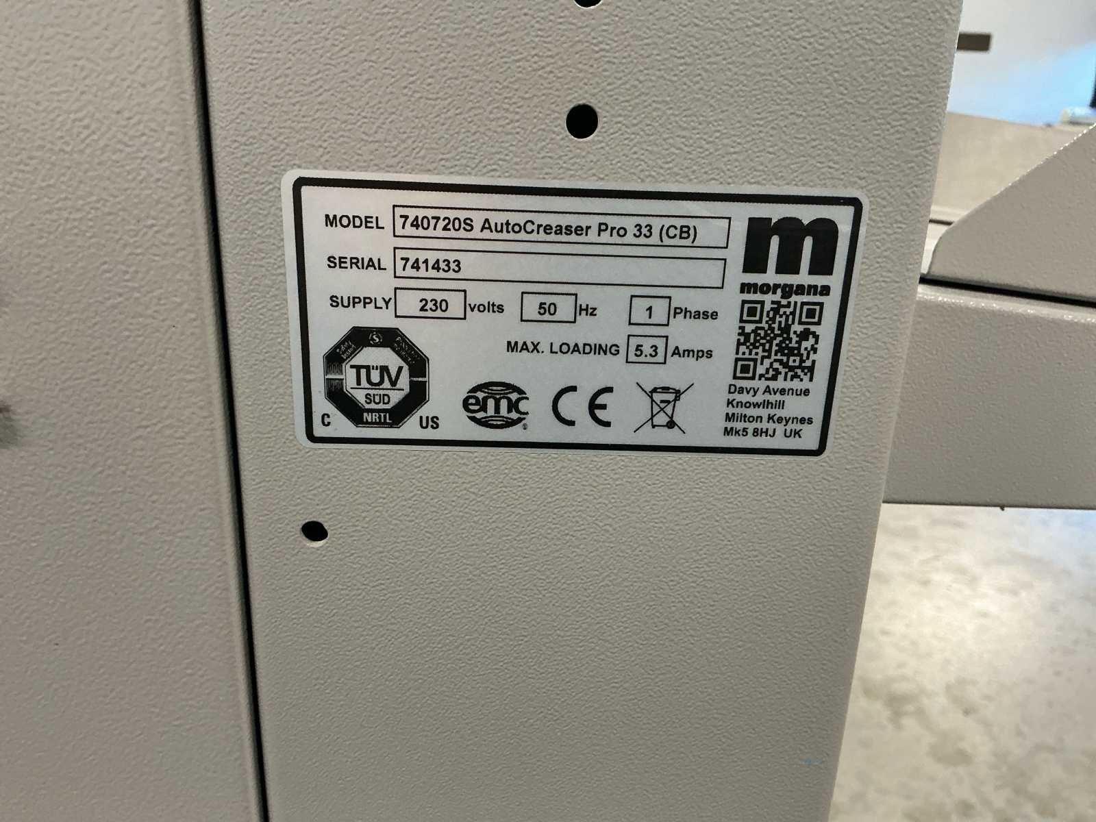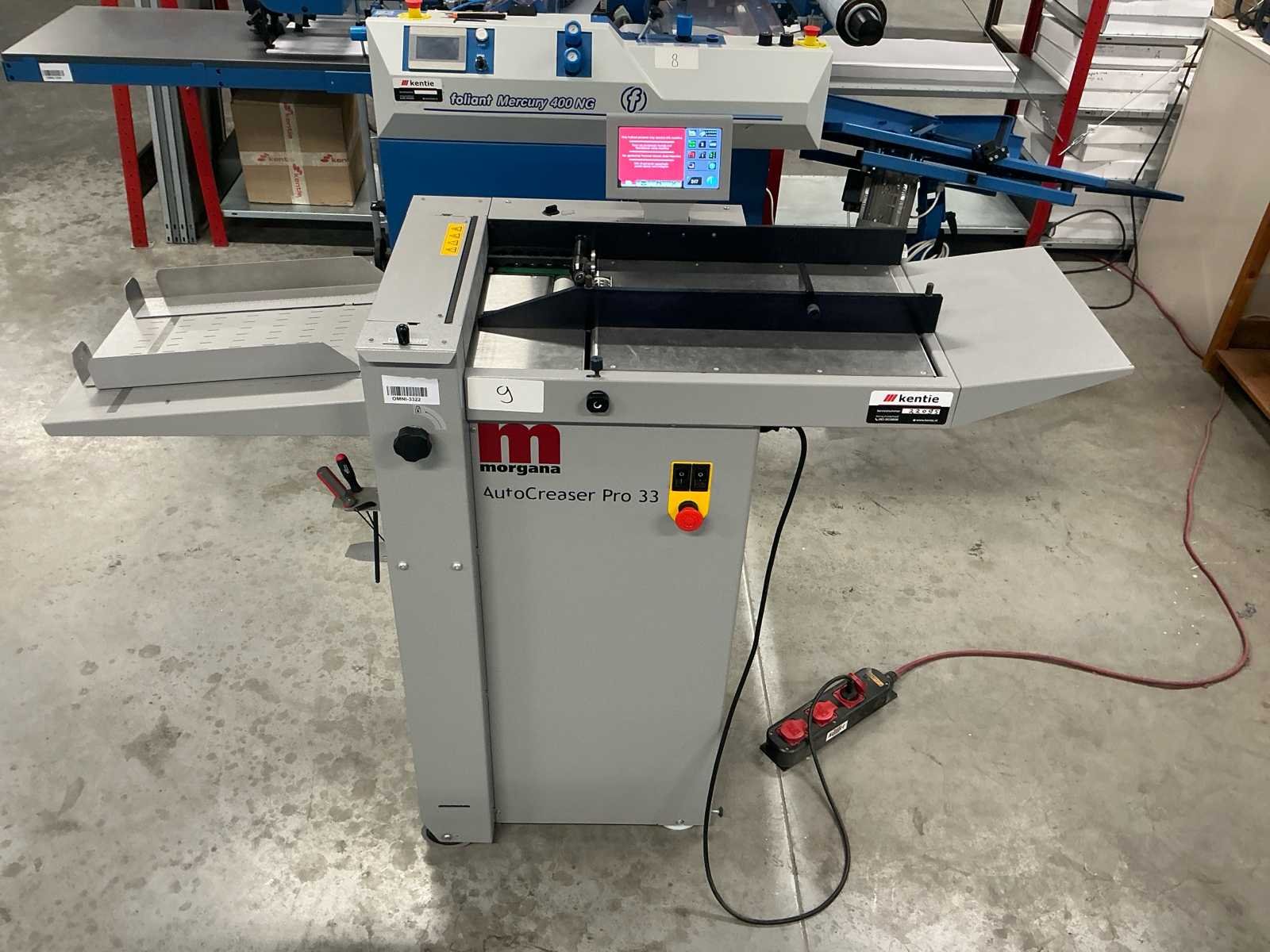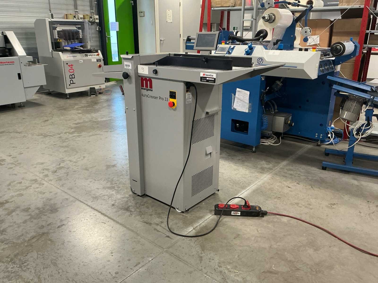 Maximaal plaatgrootte: 700x330mm; Min. bladgrootte: 210x140mm; Maximale papierdikte: 0,4 mm (varieert afhankelijk van hardheid, type vouw en substraat); Max. Nee. Vouwen per blad: 16; Min. afstand tussen vouwen: 0,1 mm Min. vouwafstand tot de voorrand: 2,5 mm; Min. vouwafstand vanaf de staartrand: 35 mm Snelheid per uur (A4 in de helft): 8500; Snelheid per uur (A5 in de helft): 11.000; Afmetingen (LxWxH): 1450x1224x522mm; Gewicht: 121kg (+50kg inpakwerk); Vermogen: 1 fase 230V, 50Hz; Inclusief reserveonderdelen Merk: Morgana Type: Autocreaser