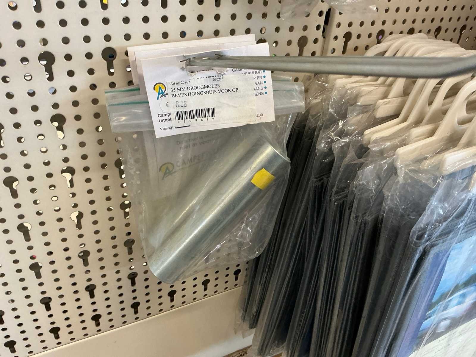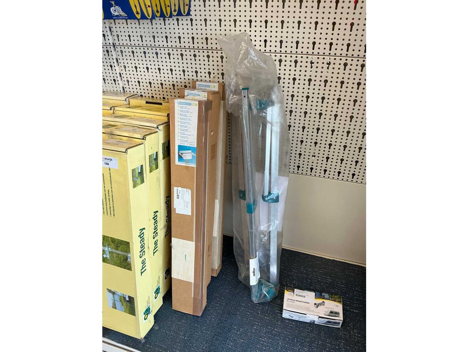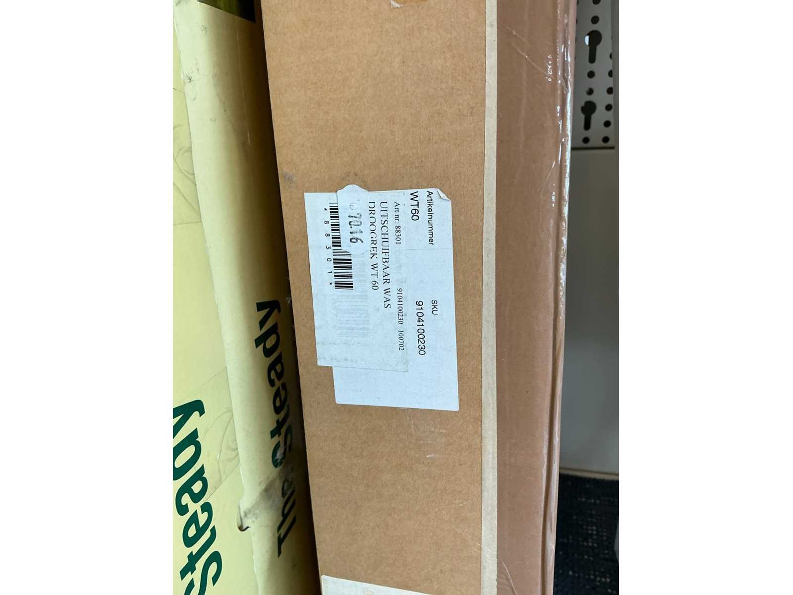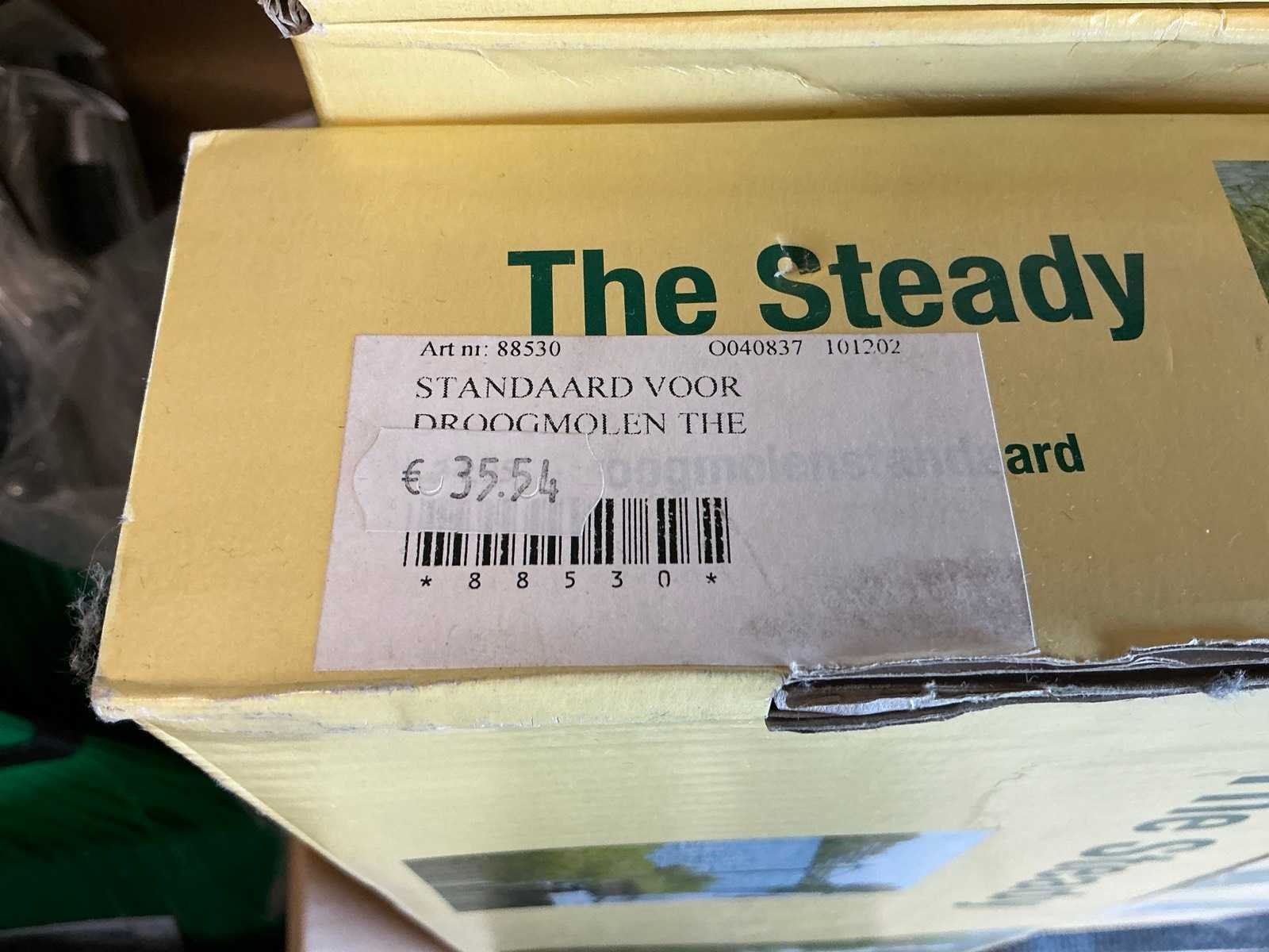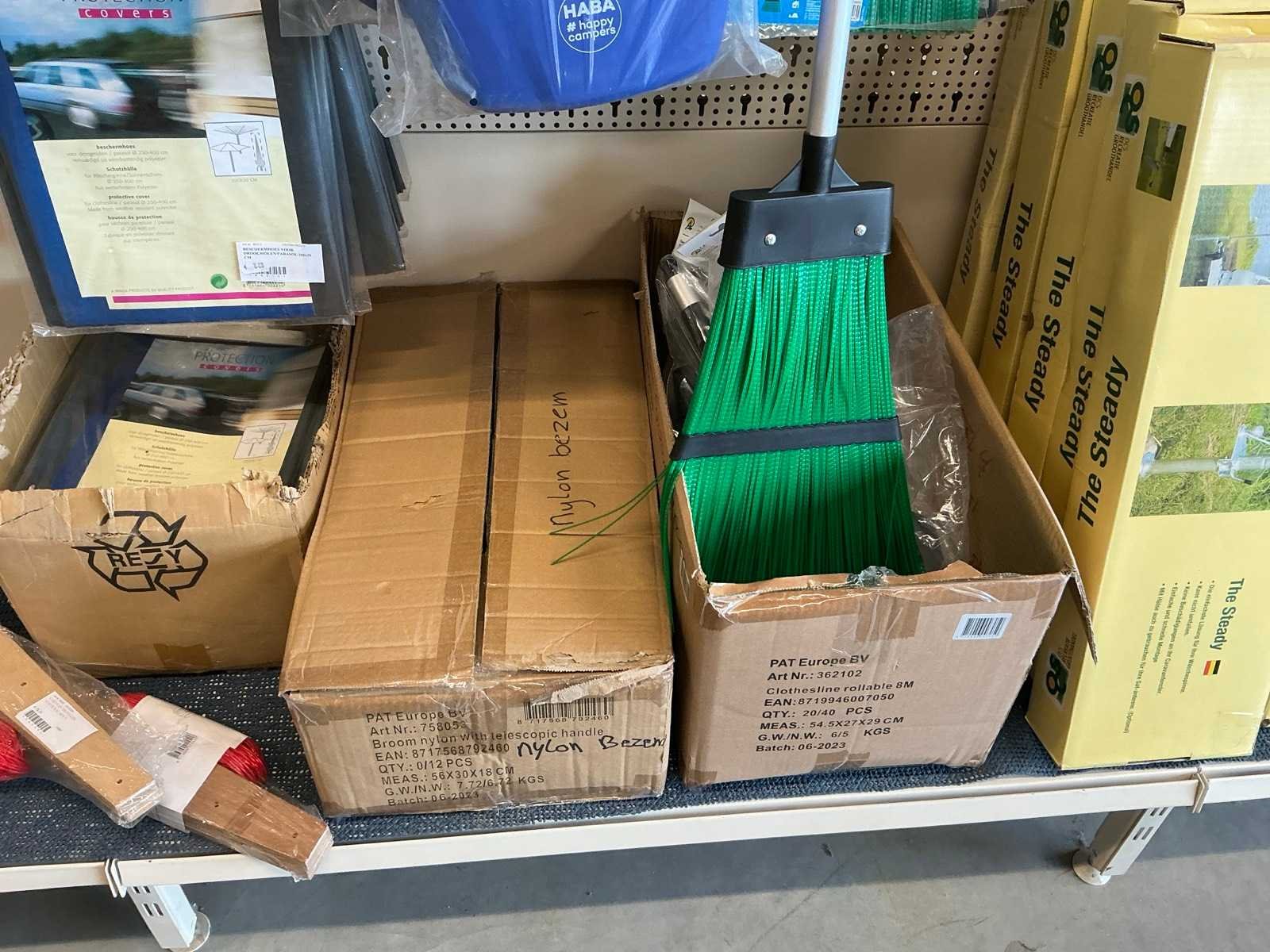 O.a. 9x ‘The Steady’ standaard voor droogmolen, 3x uitschuifbaar wasdroogrek, partij bezems etc