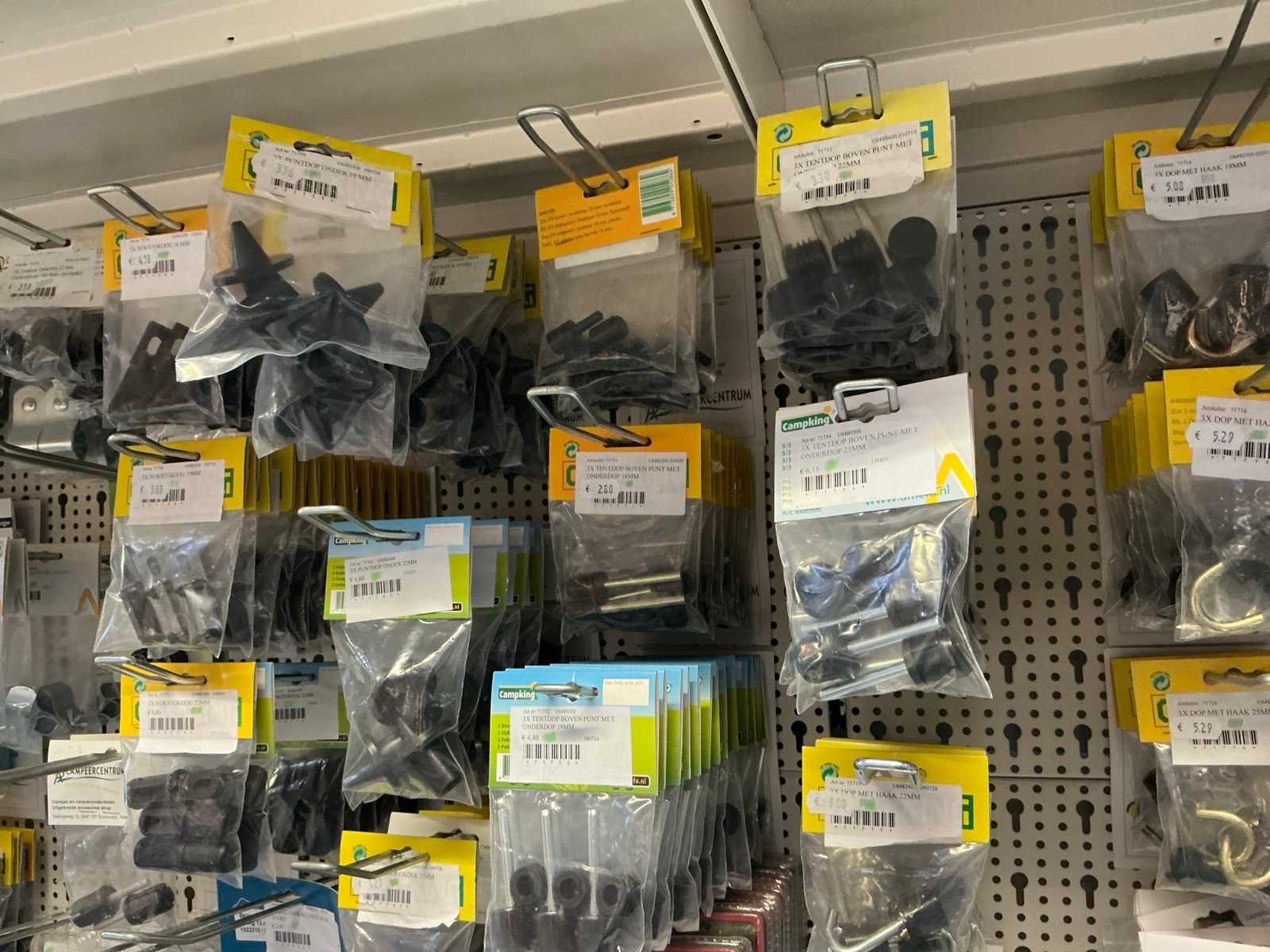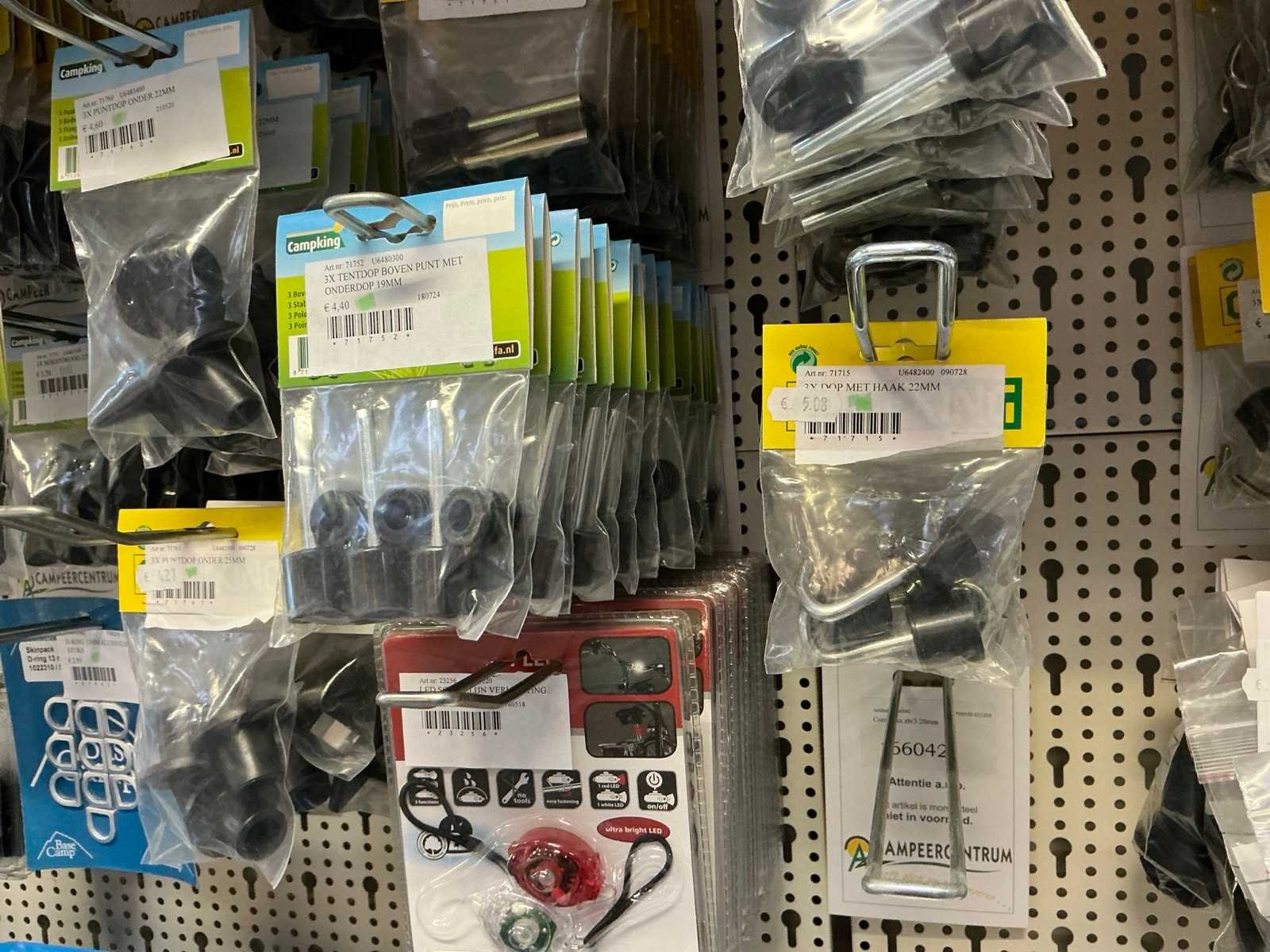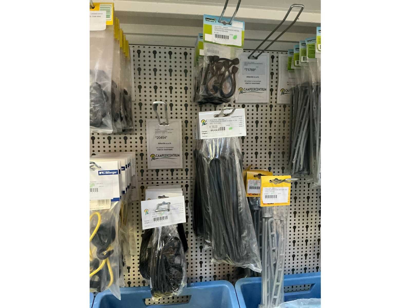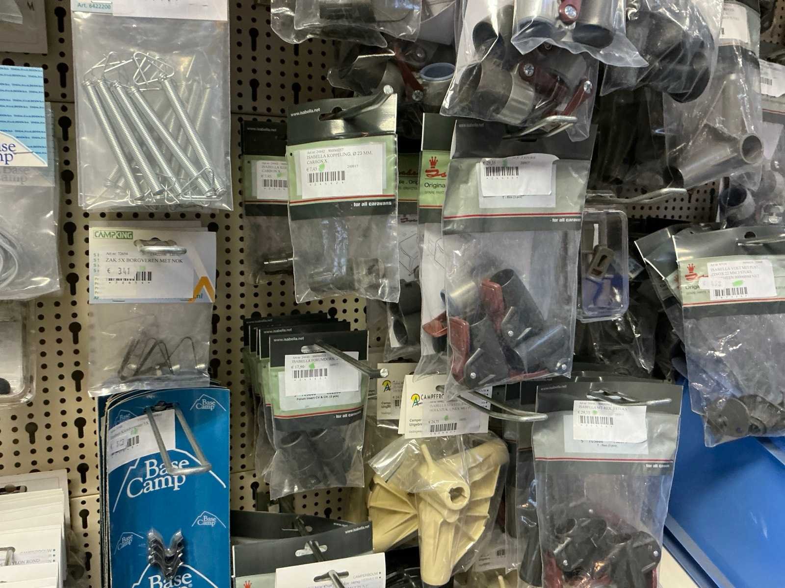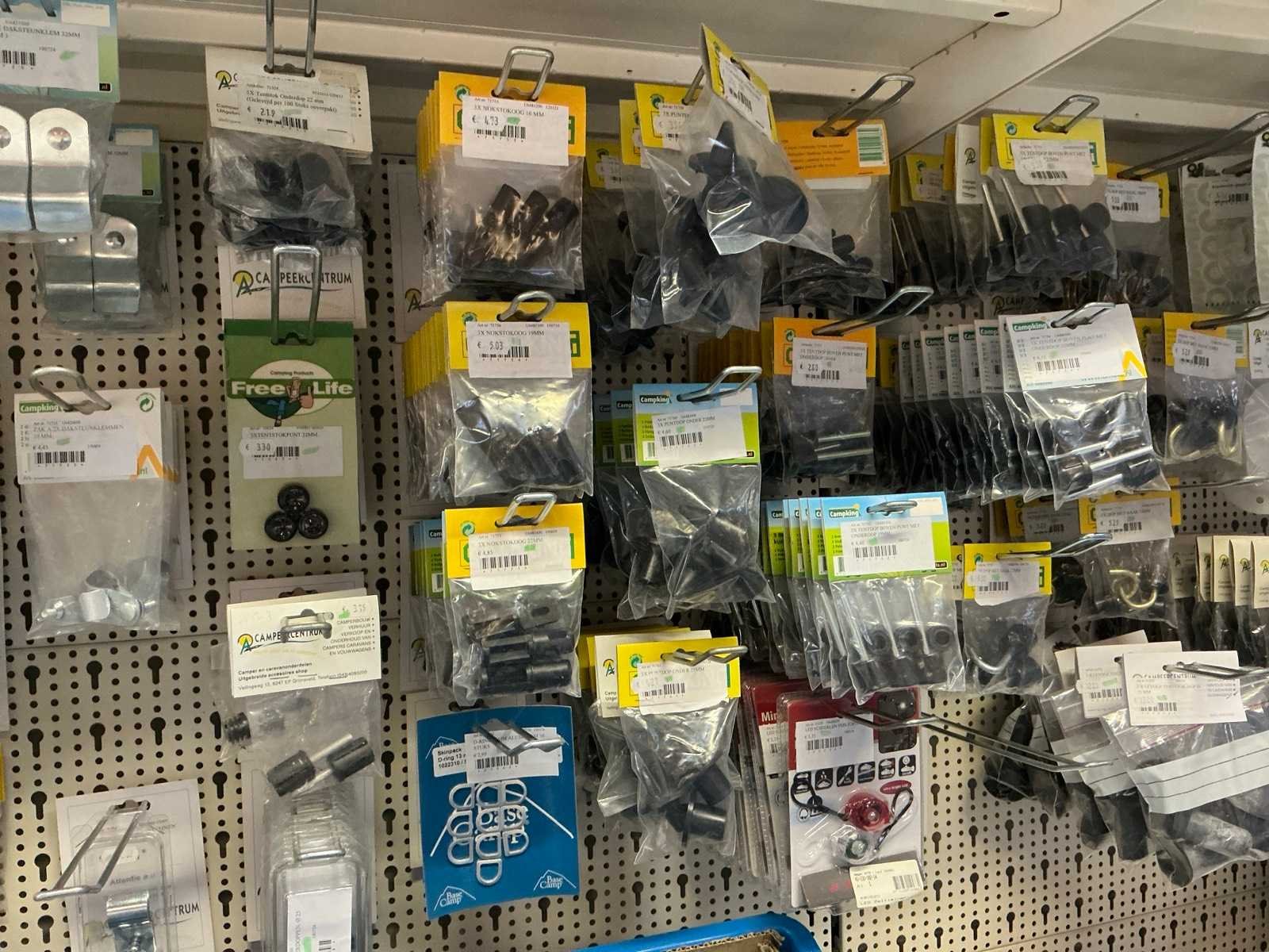 Bestaande uit onder meer: tent en luifelonderdelen, dopjes, hoekstukken, knikstukken tentclips, tentdoekreparatue sets etc, aan 8 secties stelling (exclusief stelling) met 5 blauwe kratten benodigdheden
