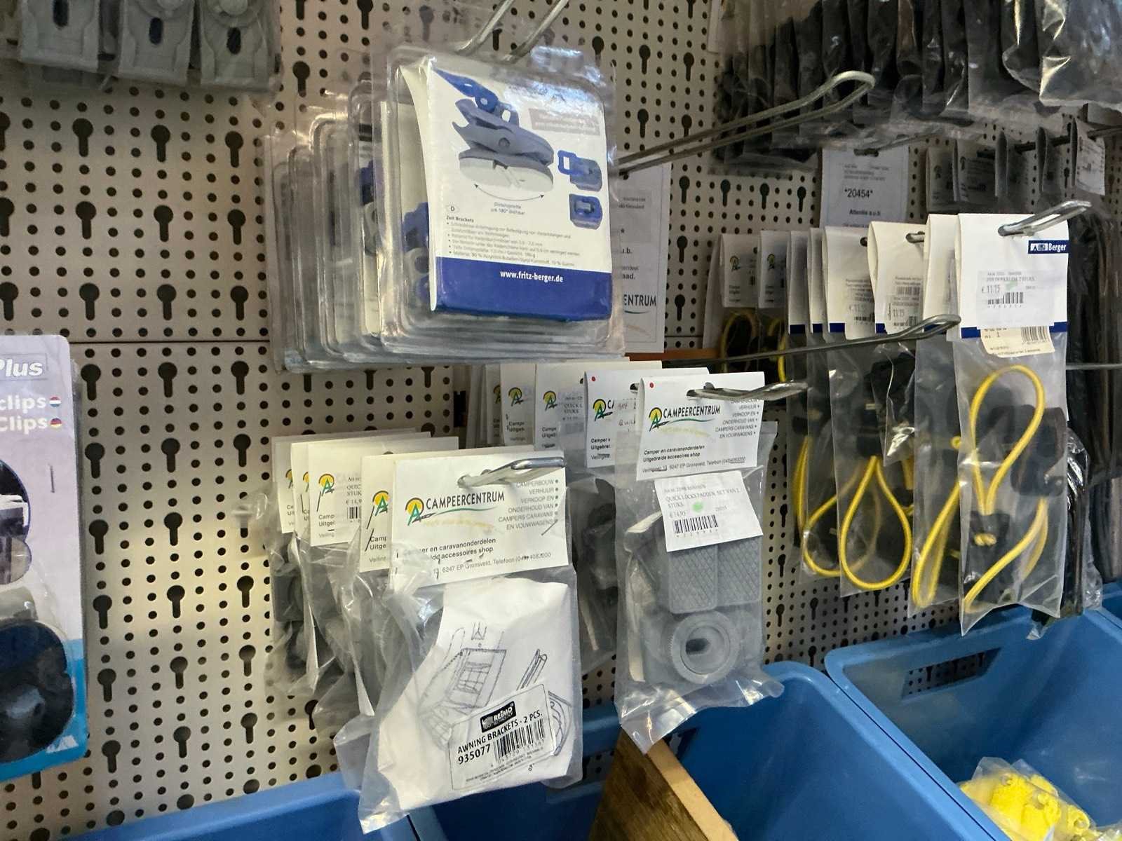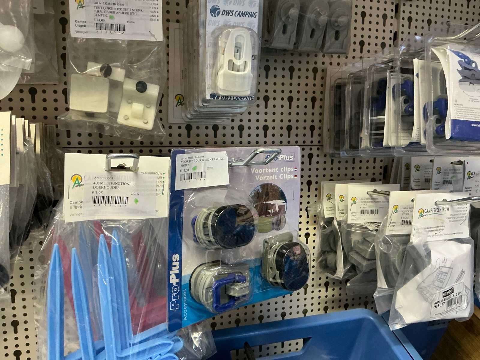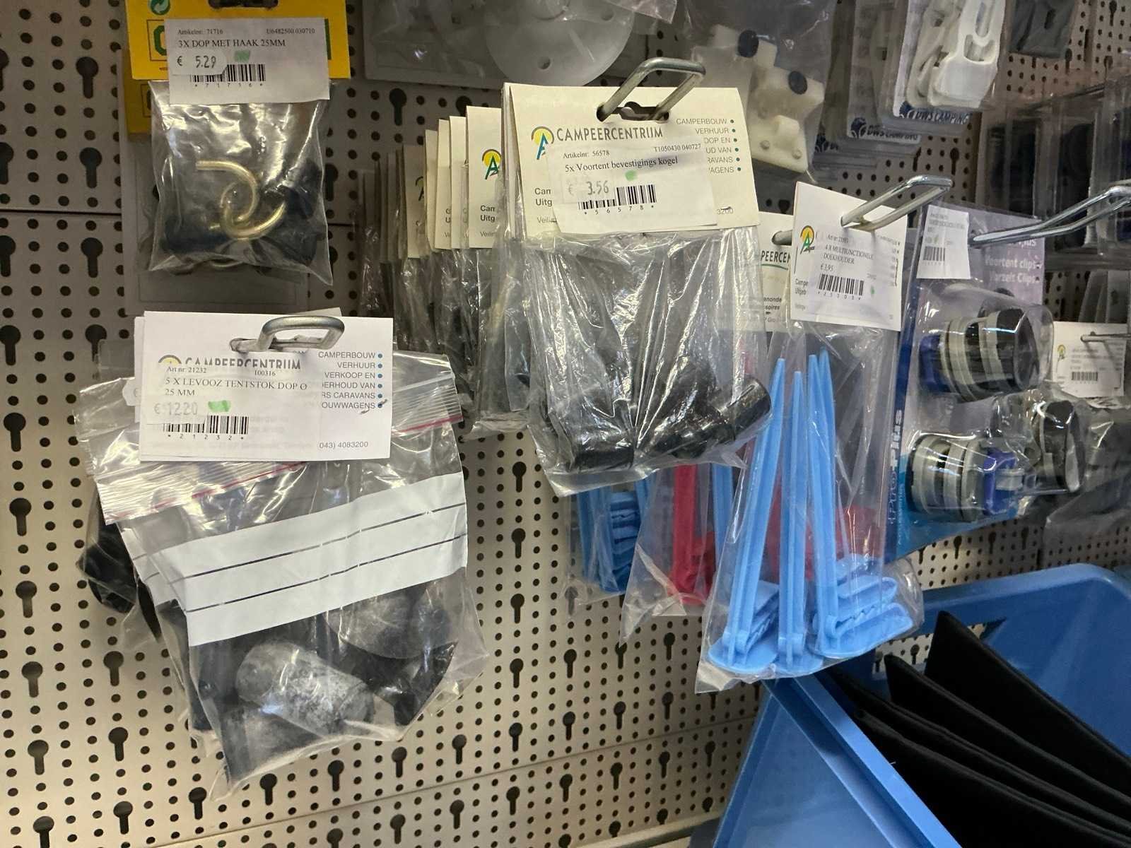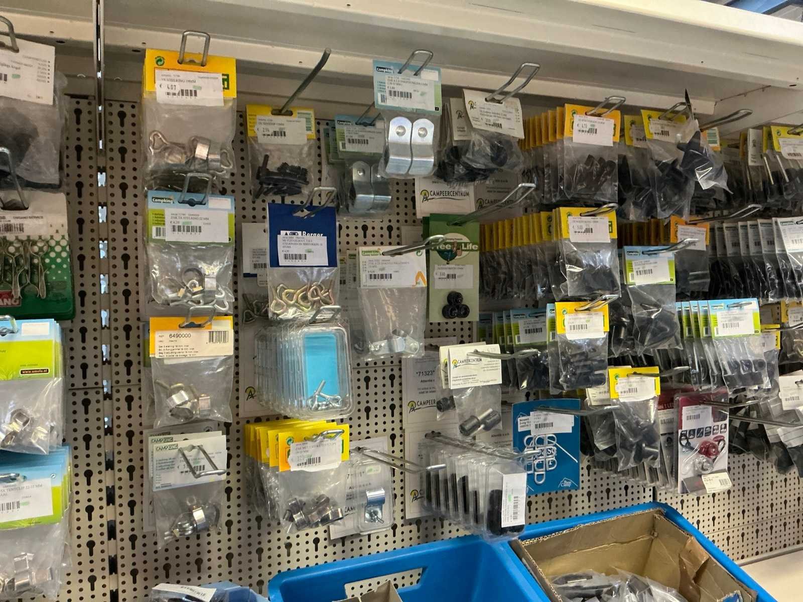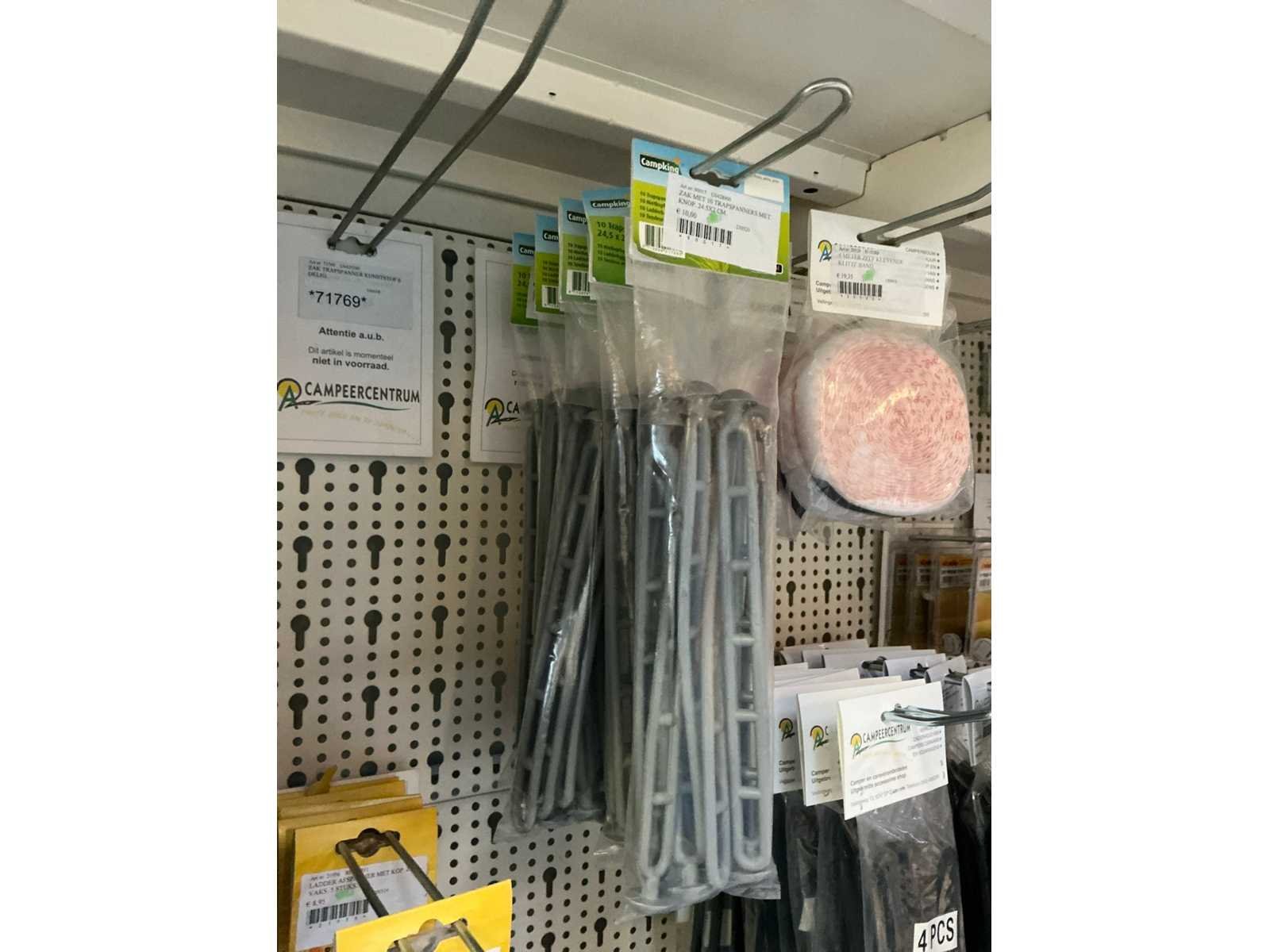 Bestaande uit onder meer: tent en luifelonderdelen, dopjes, hoekstukken, knikstukken tentclips, tentdoekreparatue sets etc, aan 8 secties stelling (exclusief stelling) met 5 blauwe kratten benodigdheden