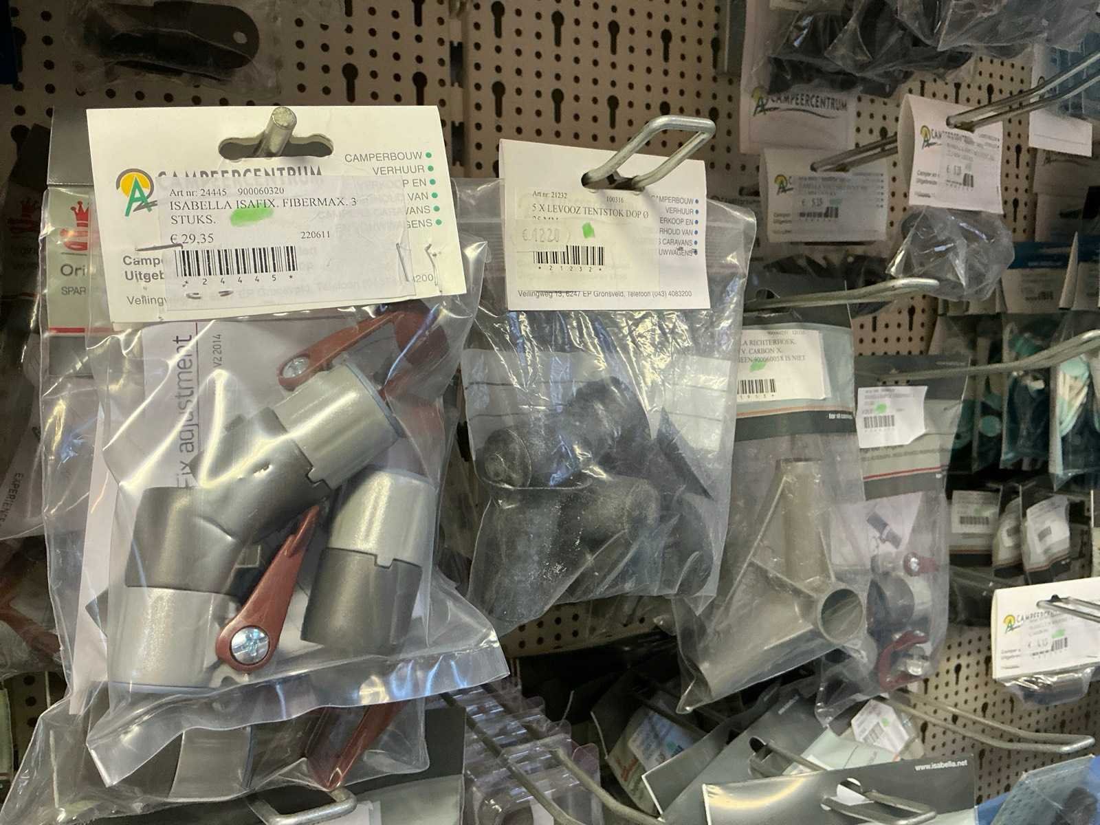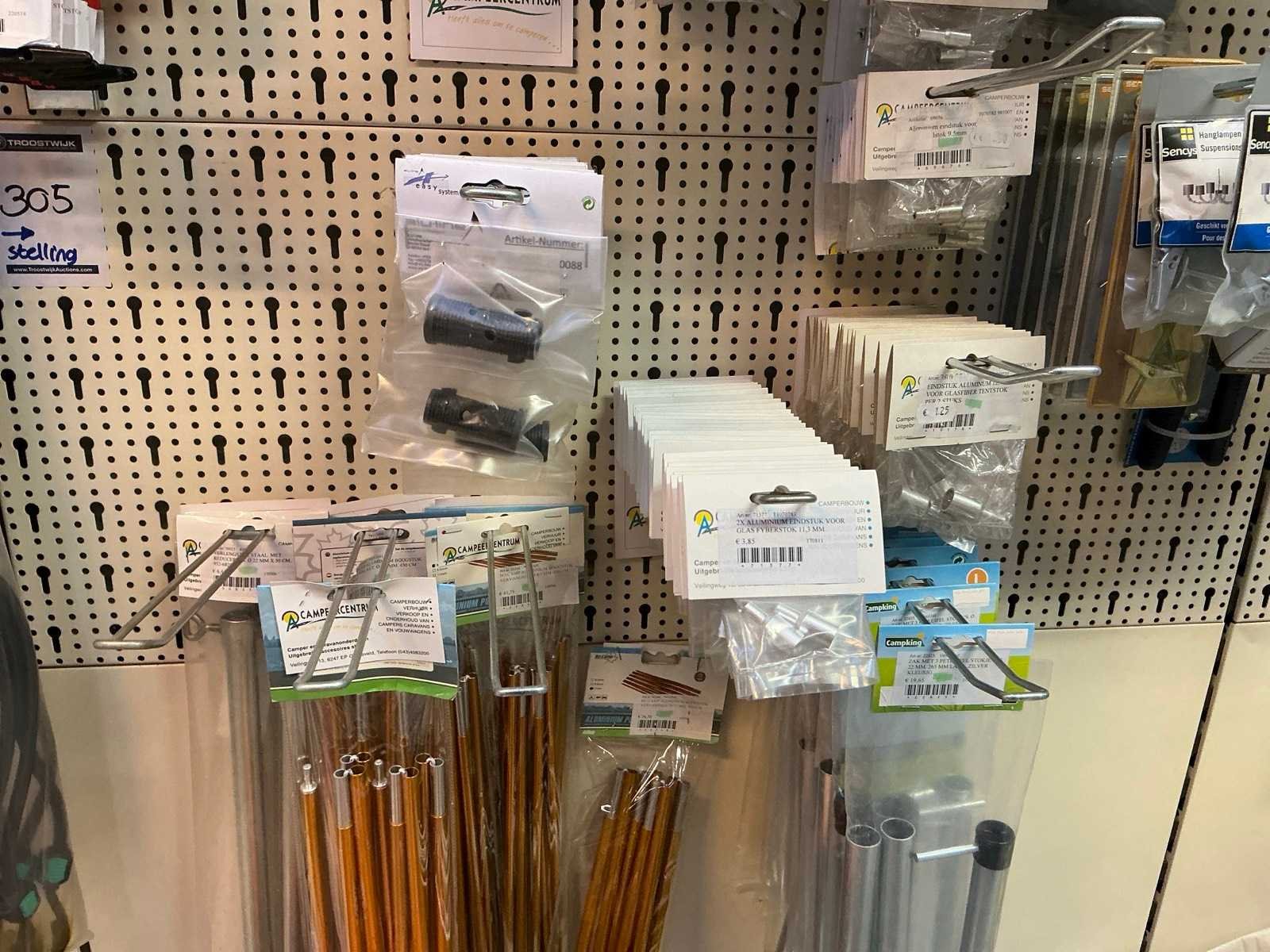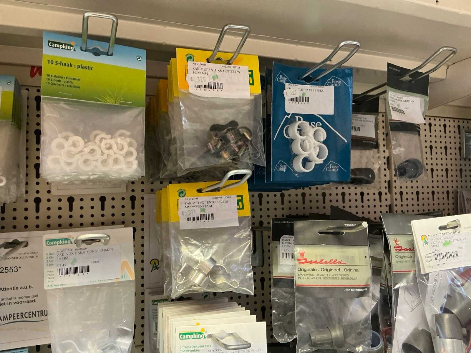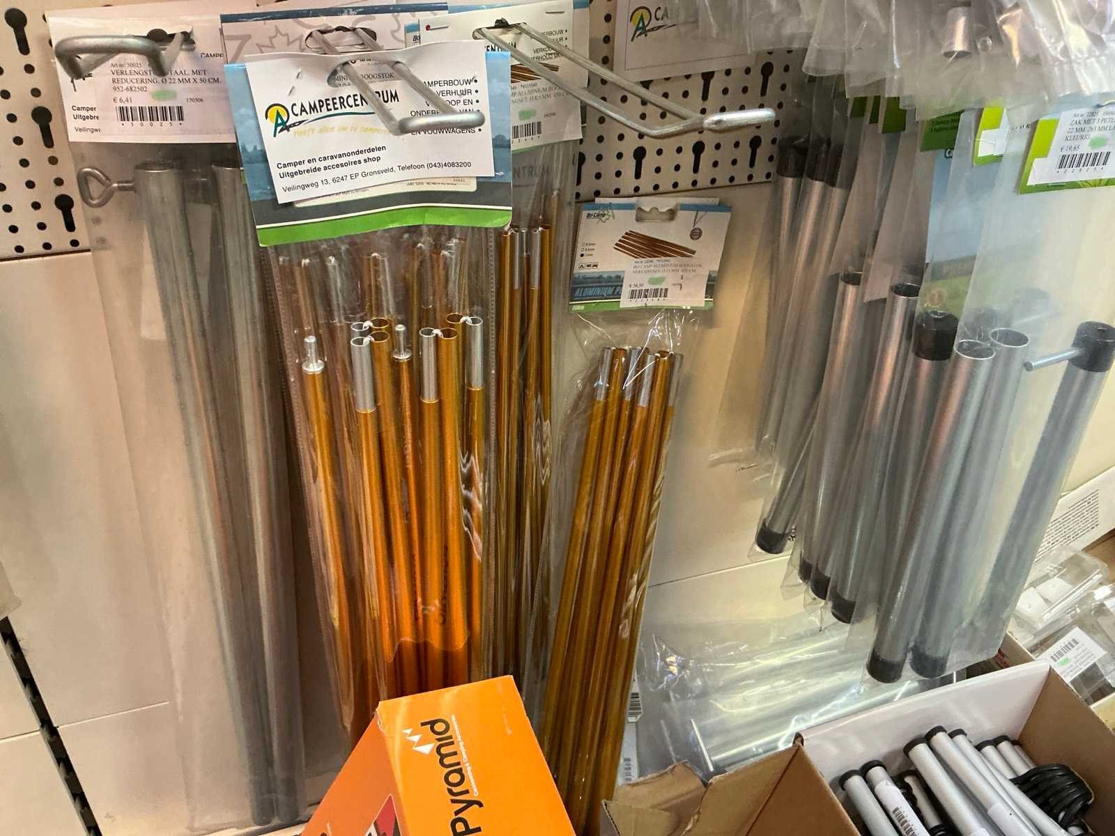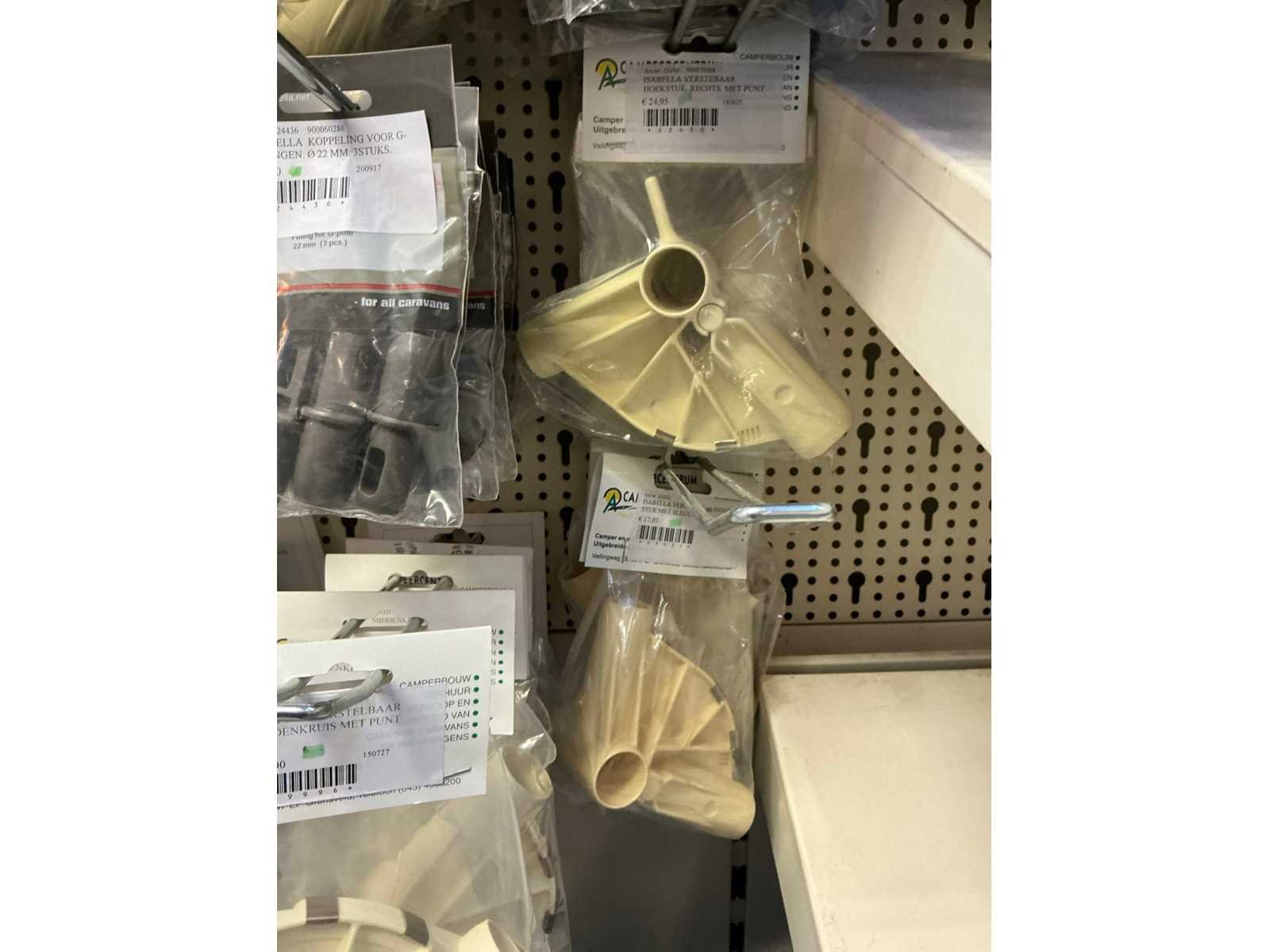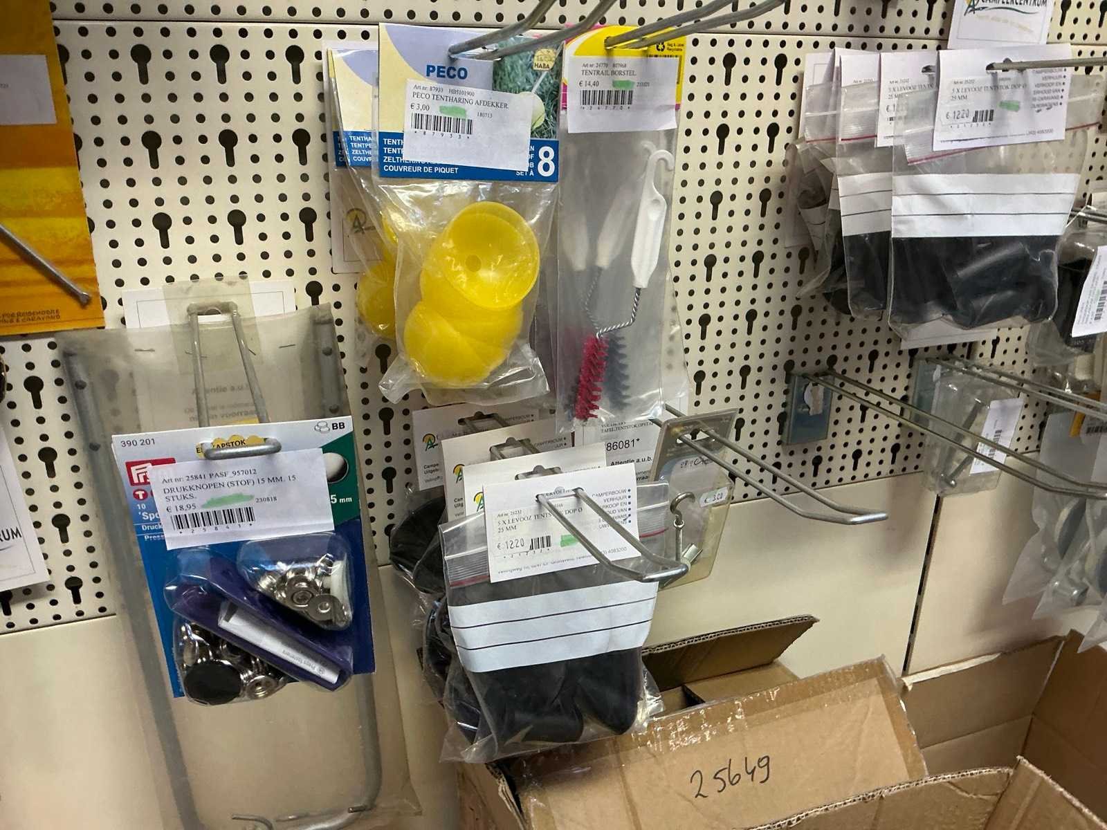 Bestaande uit onder meer: tent en luifelonderdelen, dopjes, hoekstukken, knikstukken tentclips, tentdoekreparatue sets etc, aan 8 secties stelling (exclusief stelling) met 5 blauwe kratten benodigdheden
