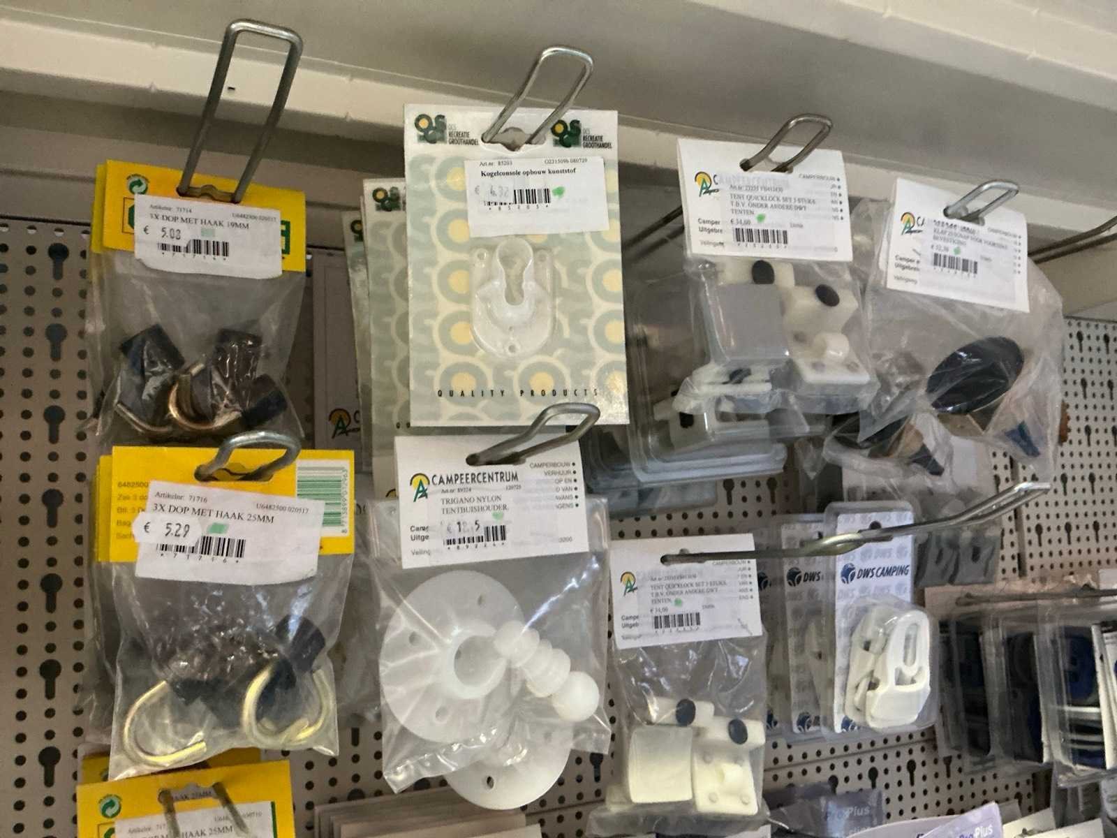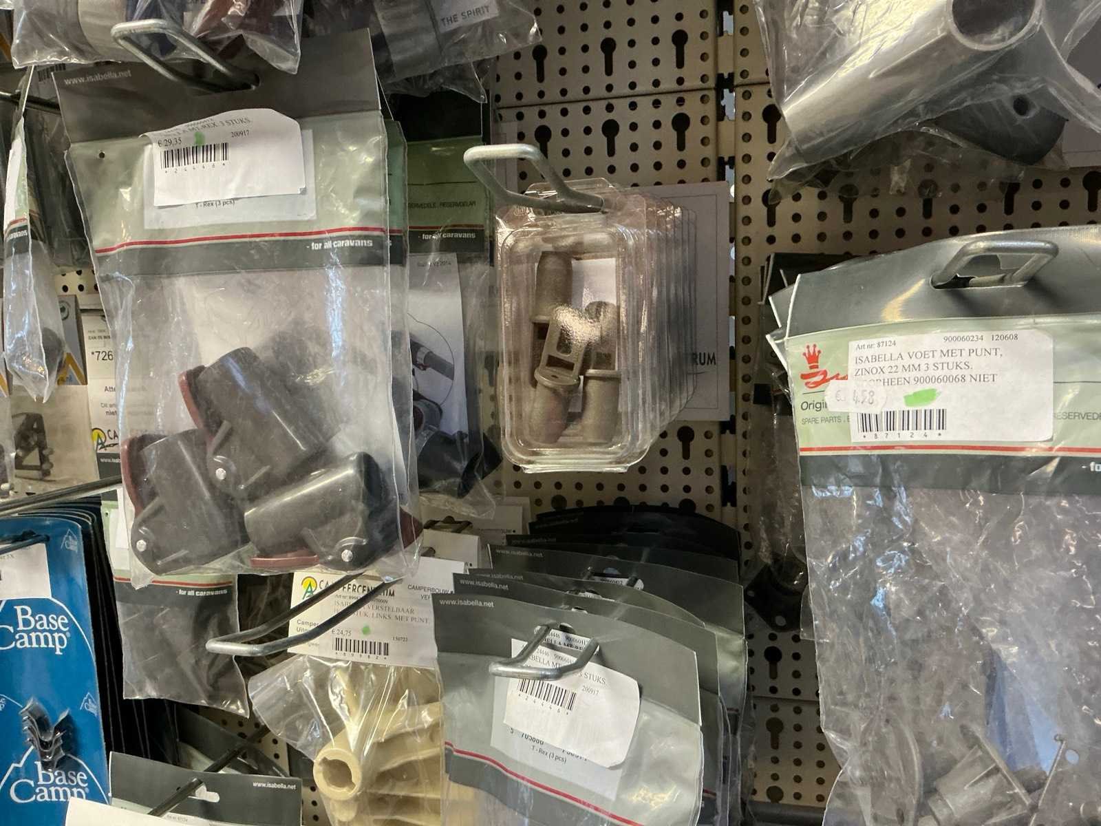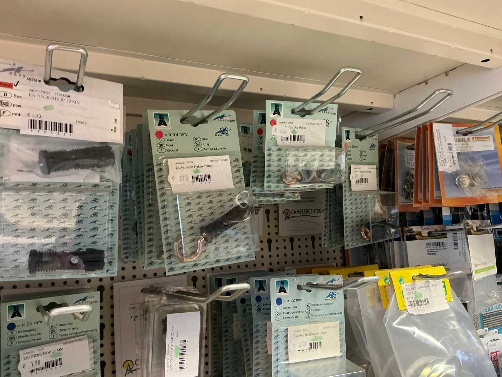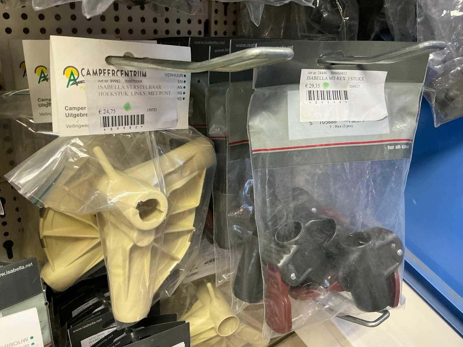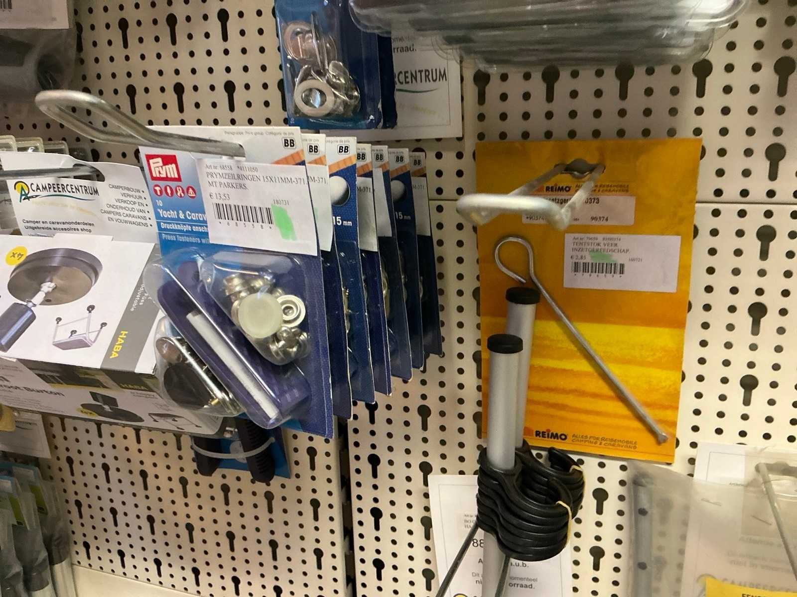 Bestaande uit onder meer: tent en luifelonderdelen, dopjes, hoekstukken, knikstukken tentclips, tentdoekreparatue sets etc, aan 8 secties stelling (exclusief stelling) met 5 blauwe kratten benodigdheden
