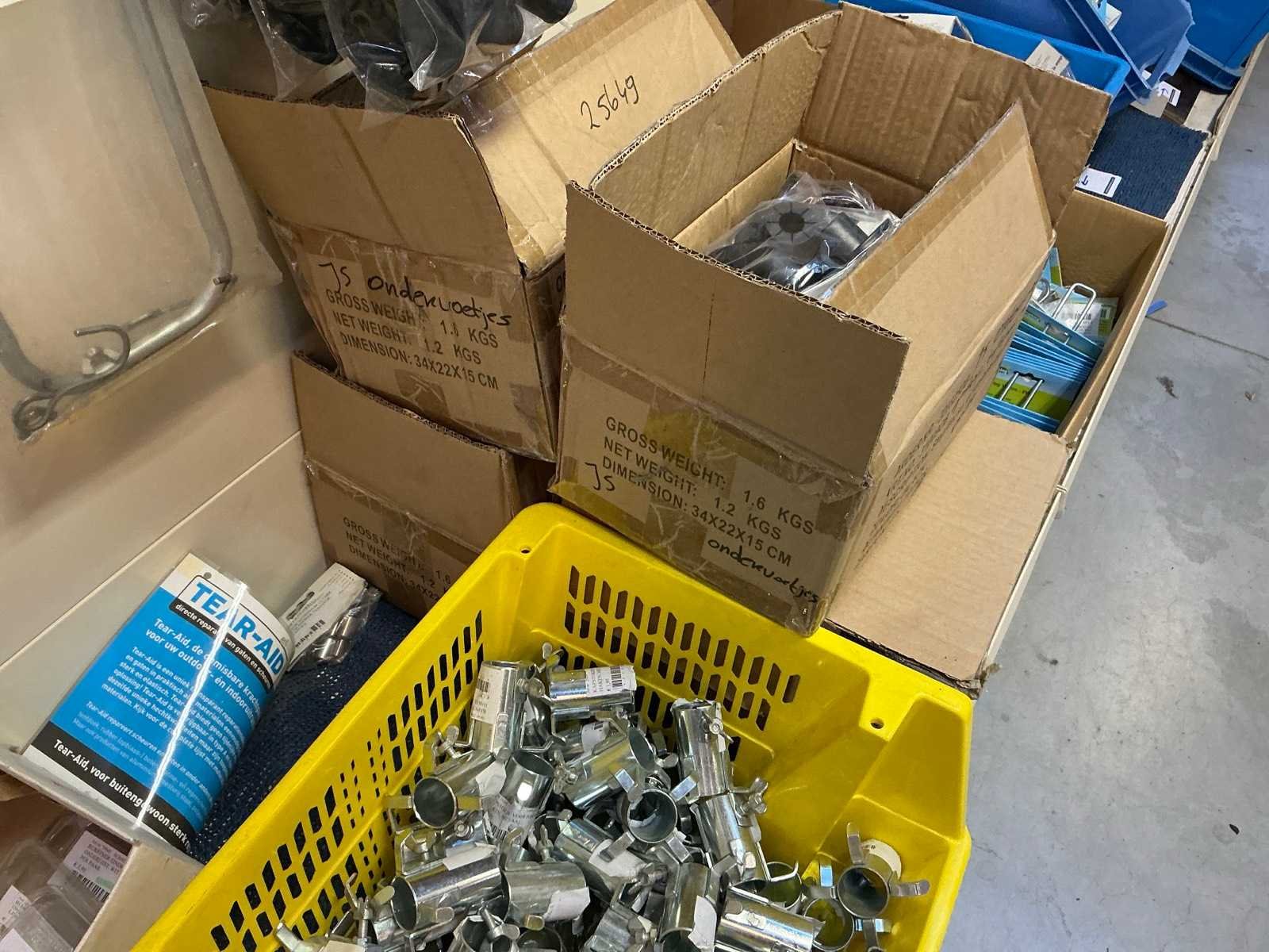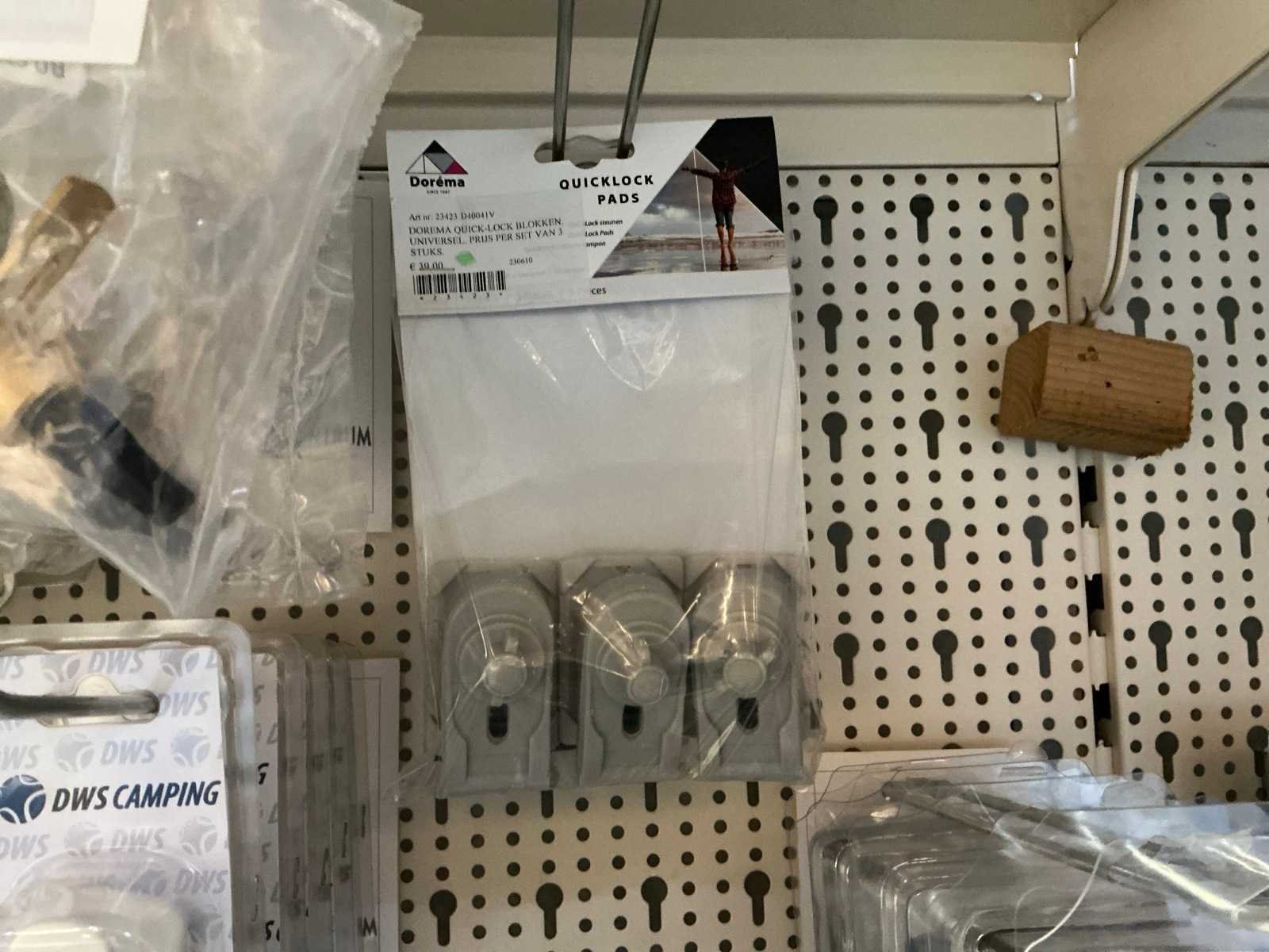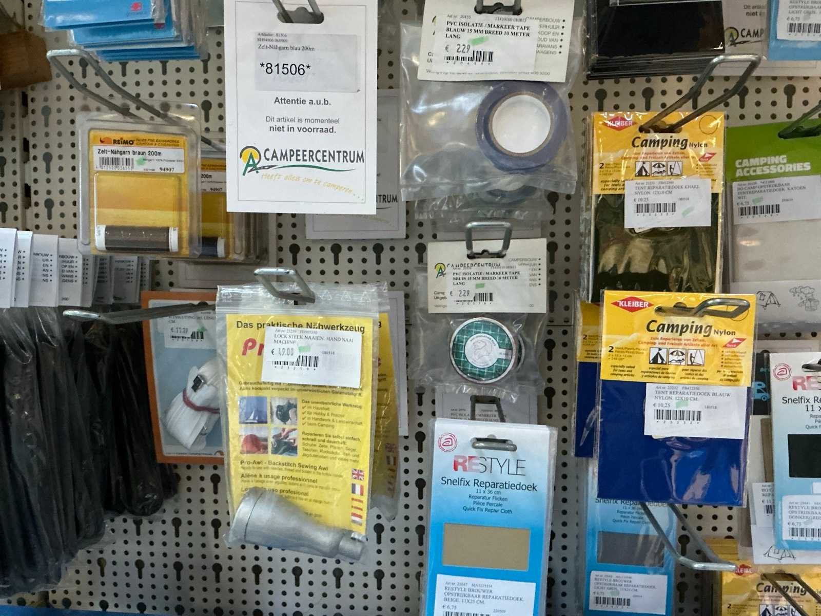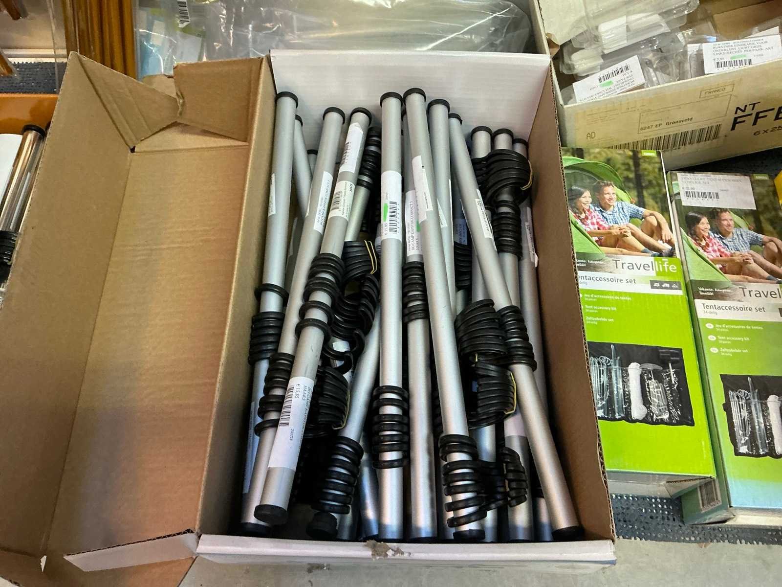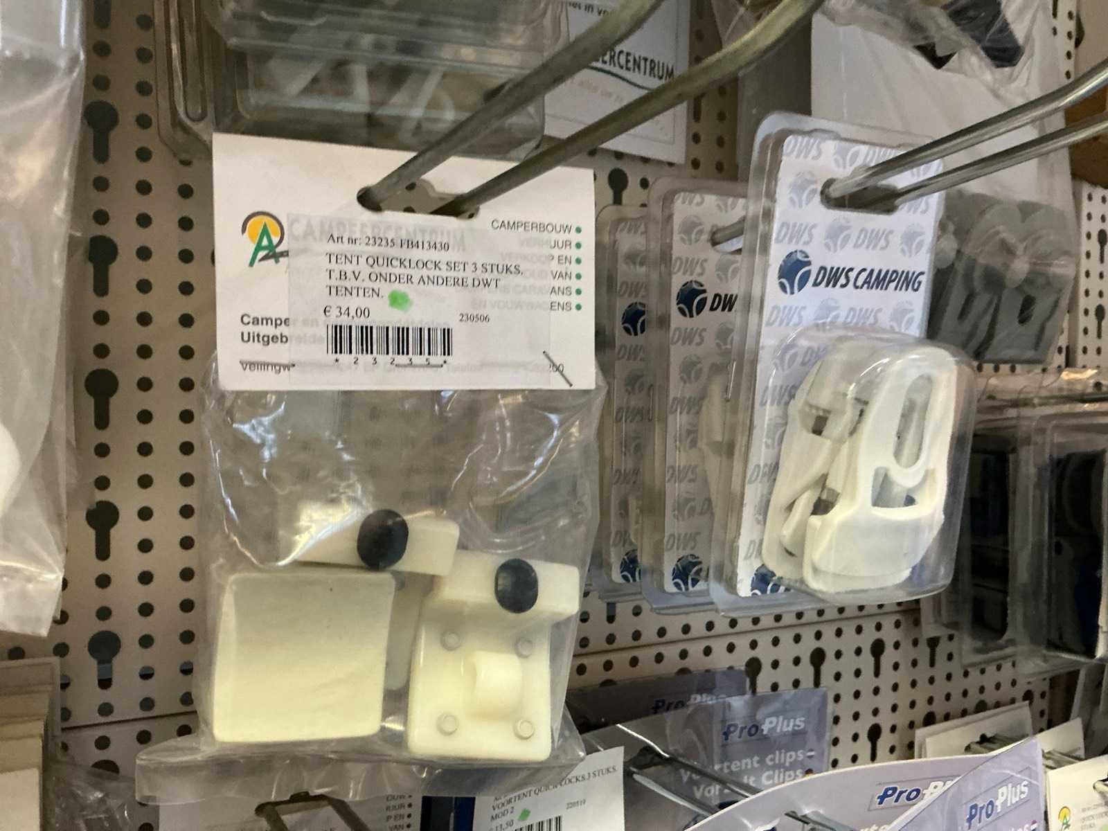 Bestaande uit onder meer: tent en luifelonderdelen, dopjes, hoekstukken, knikstukken tentclips, tentdoekreparatue sets etc, aan 8 secties stelling (exclusief stelling) met 5 blauwe kratten benodigdheden