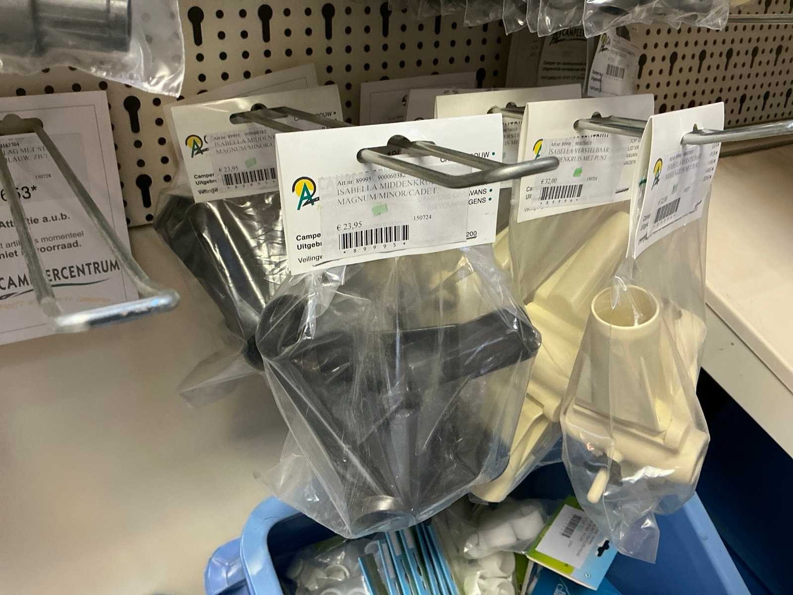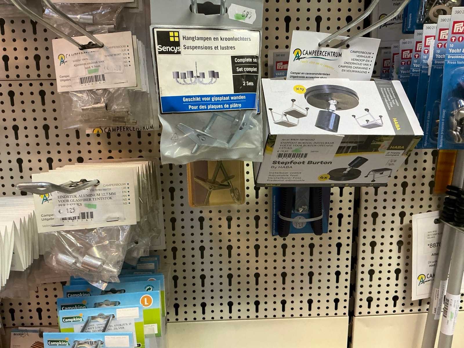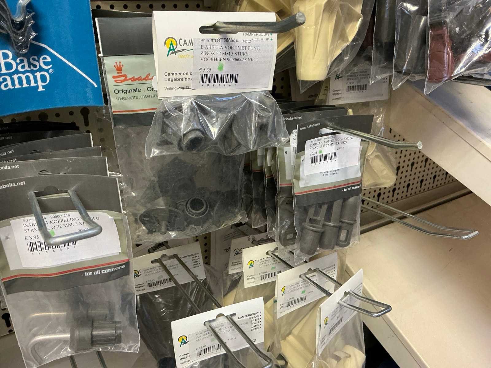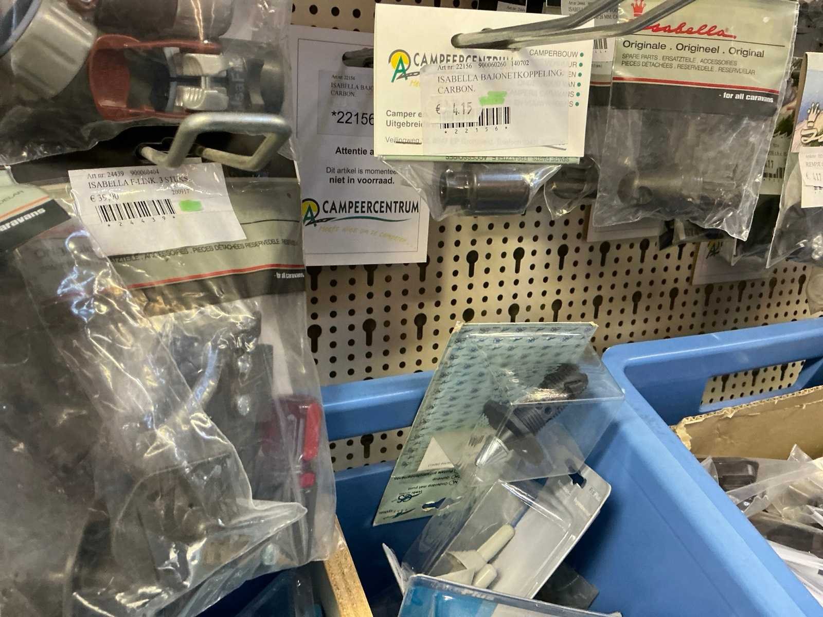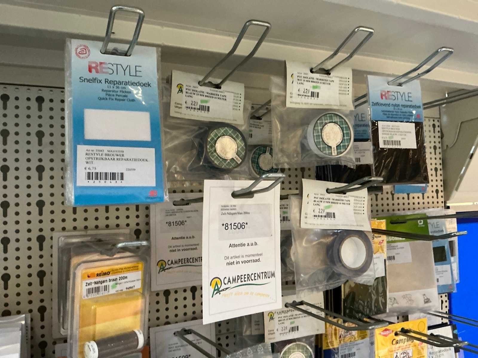 Bestaande uit onder meer: tent en luifelonderdelen, dopjes, hoekstukken, knikstukken tentclips, tentdoekreparatue sets etc, aan 8 secties stelling (exclusief stelling) met 5 blauwe kratten benodigdheden