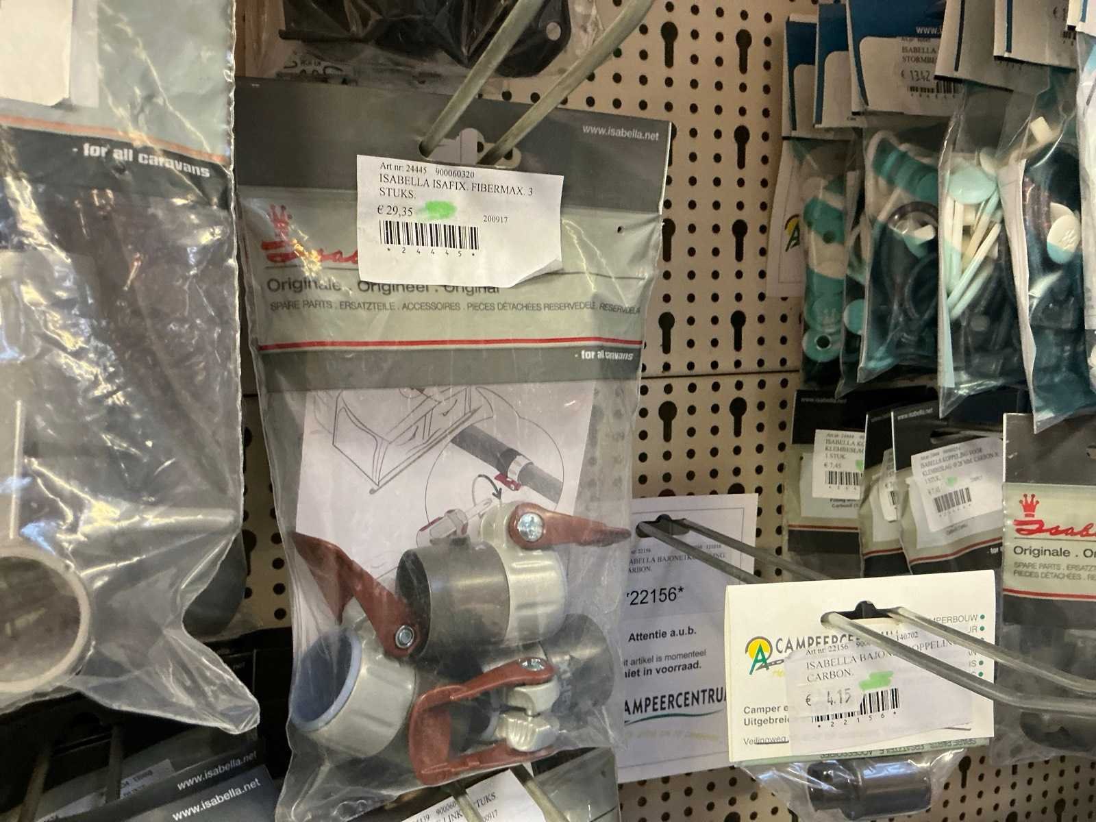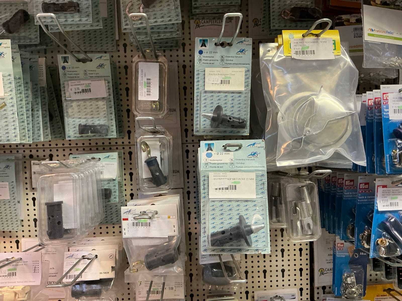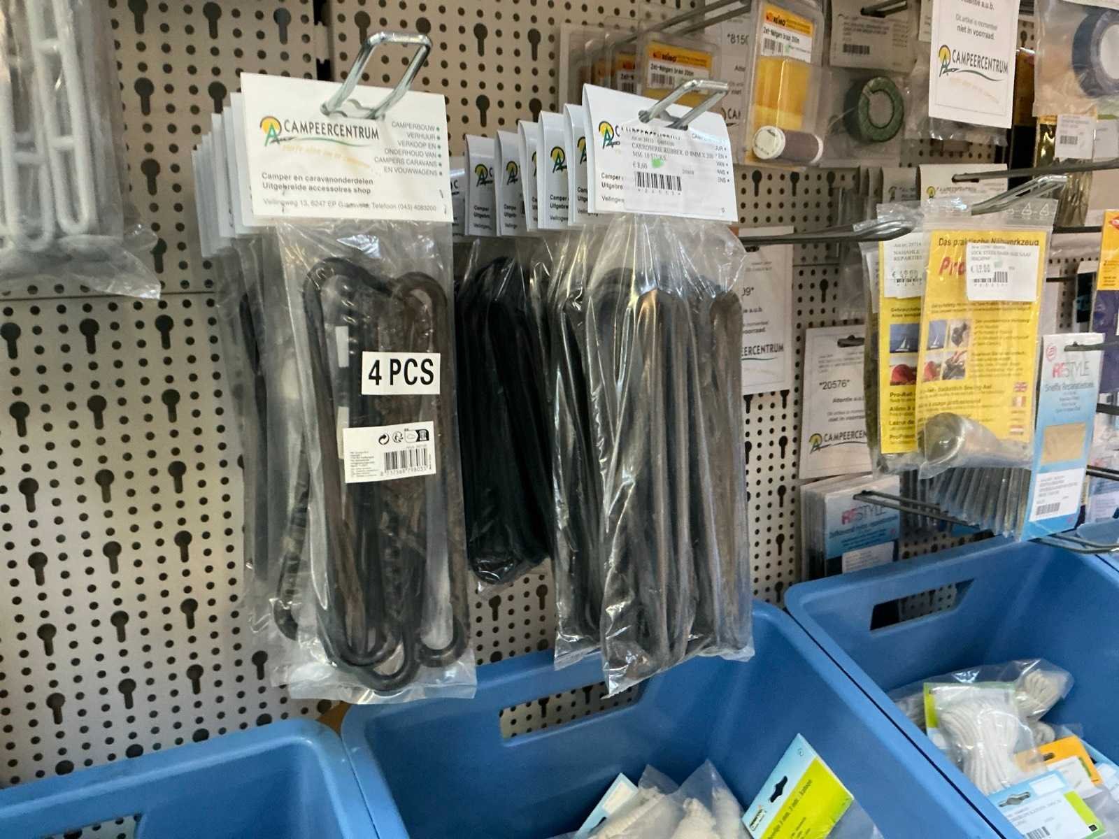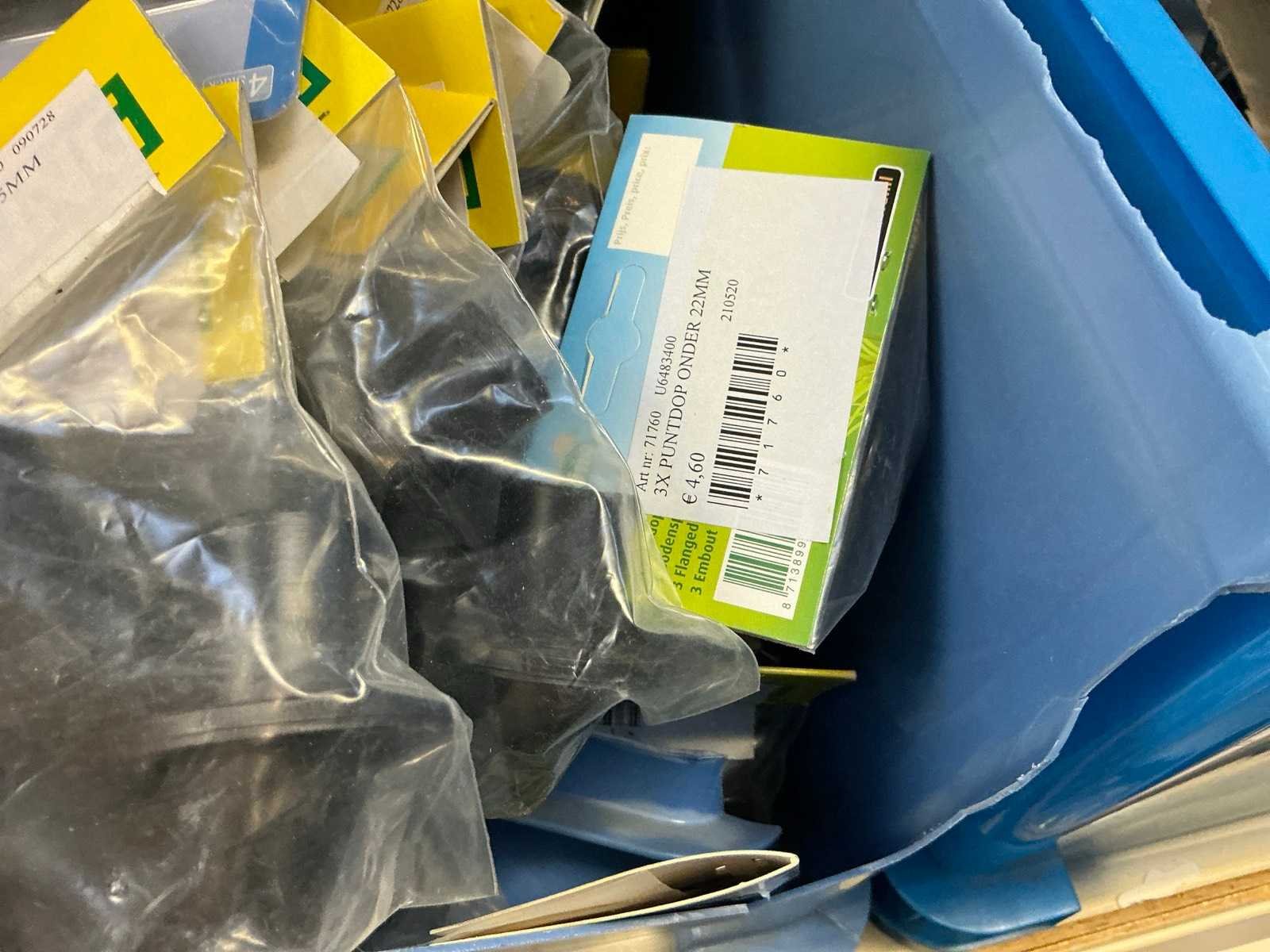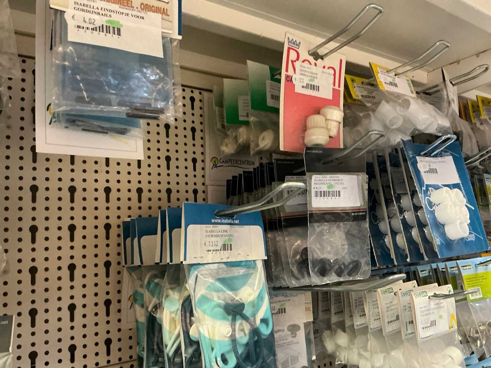 Bestaande uit onder meer: tent en luifelonderdelen, dopjes, hoekstukken, knikstukken tentclips, tentdoekreparatue sets etc, aan 8 secties stelling (exclusief stelling) met 5 blauwe kratten benodigdheden