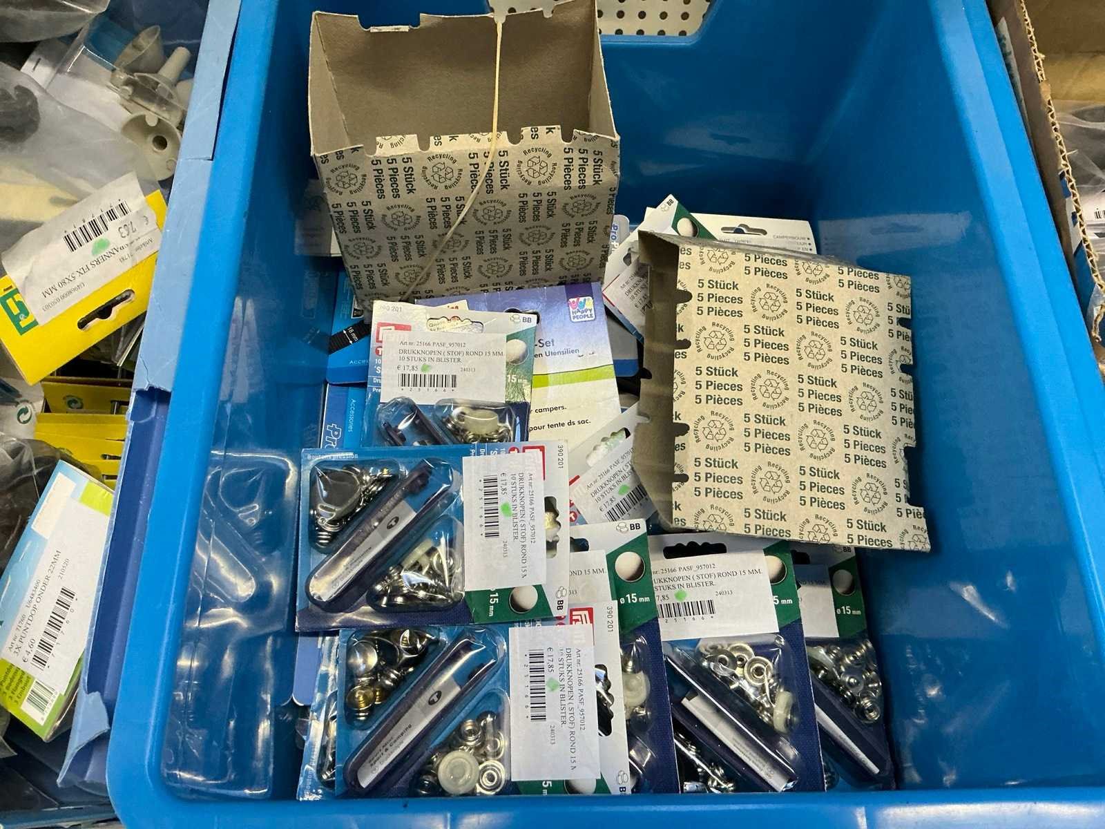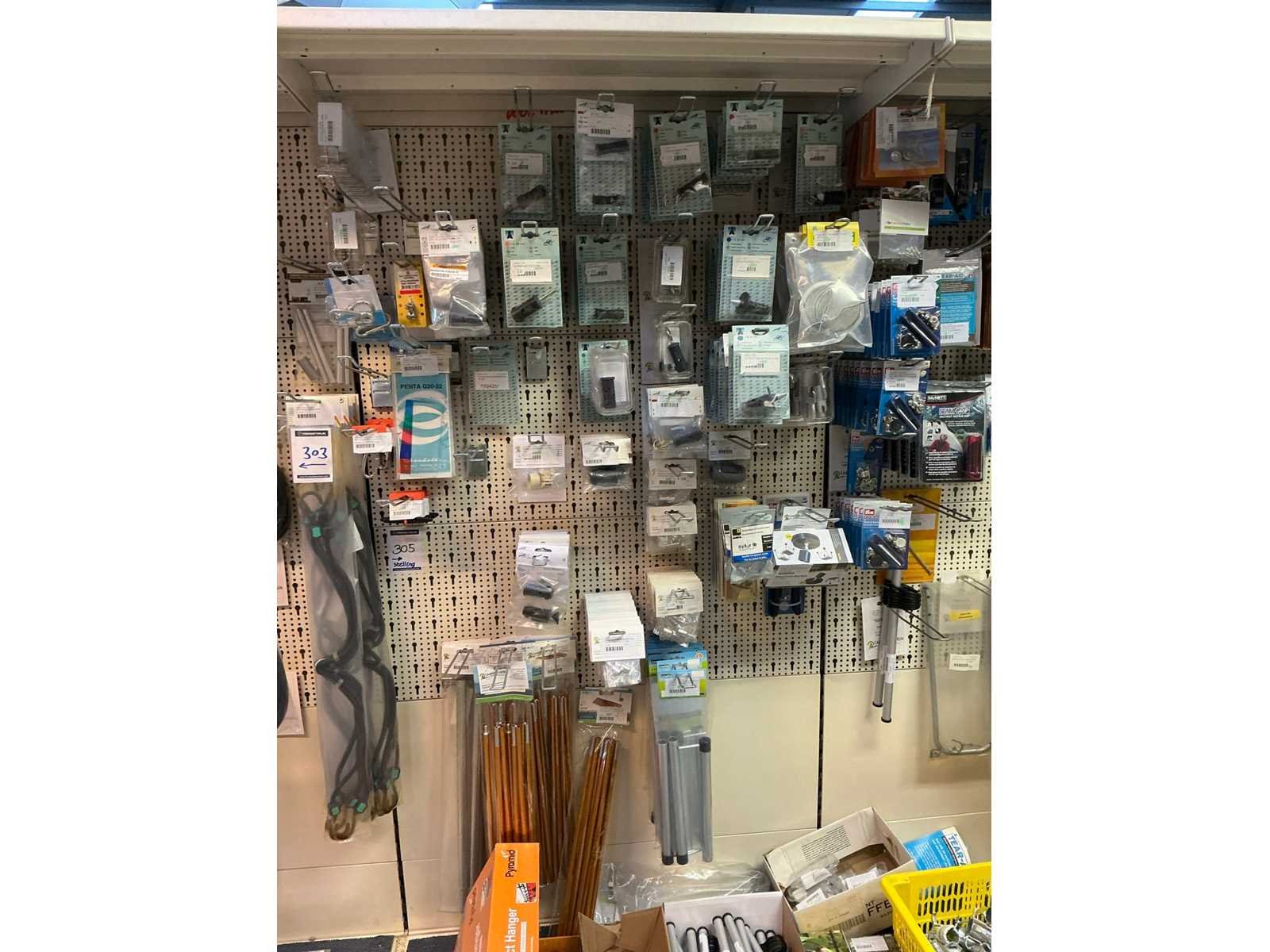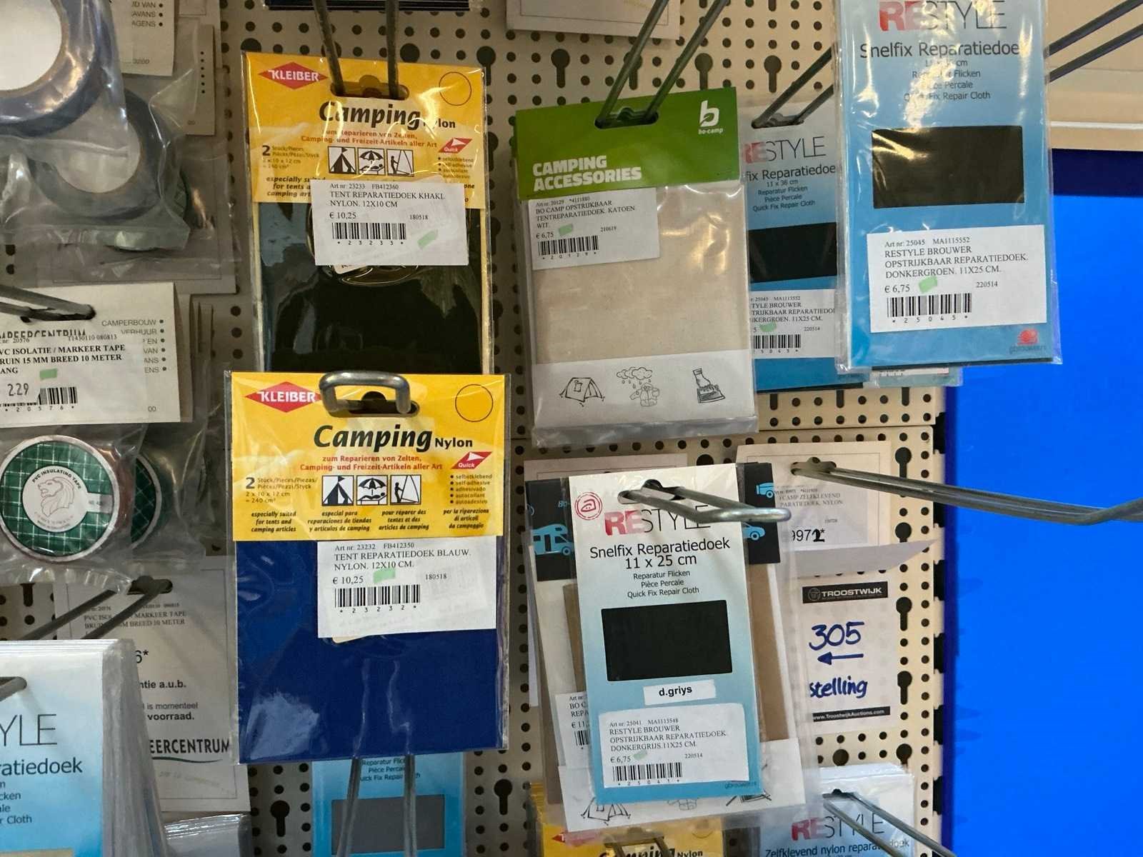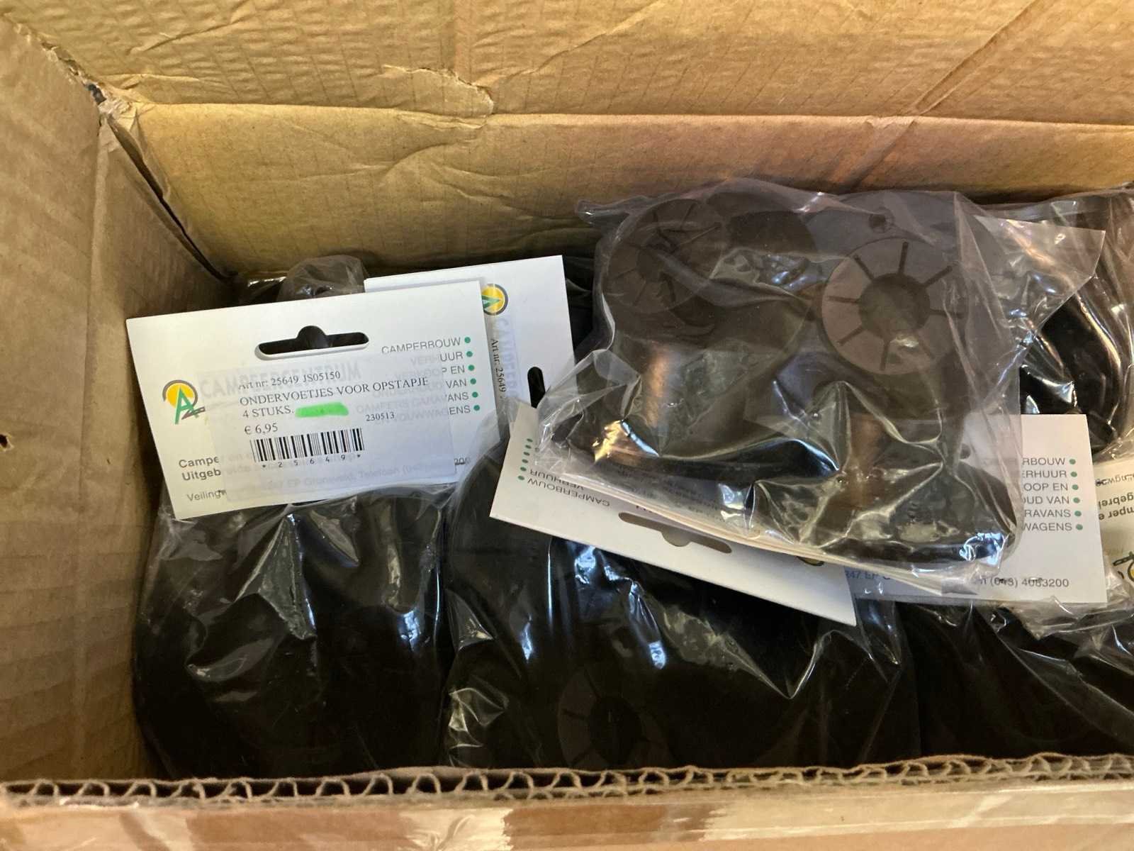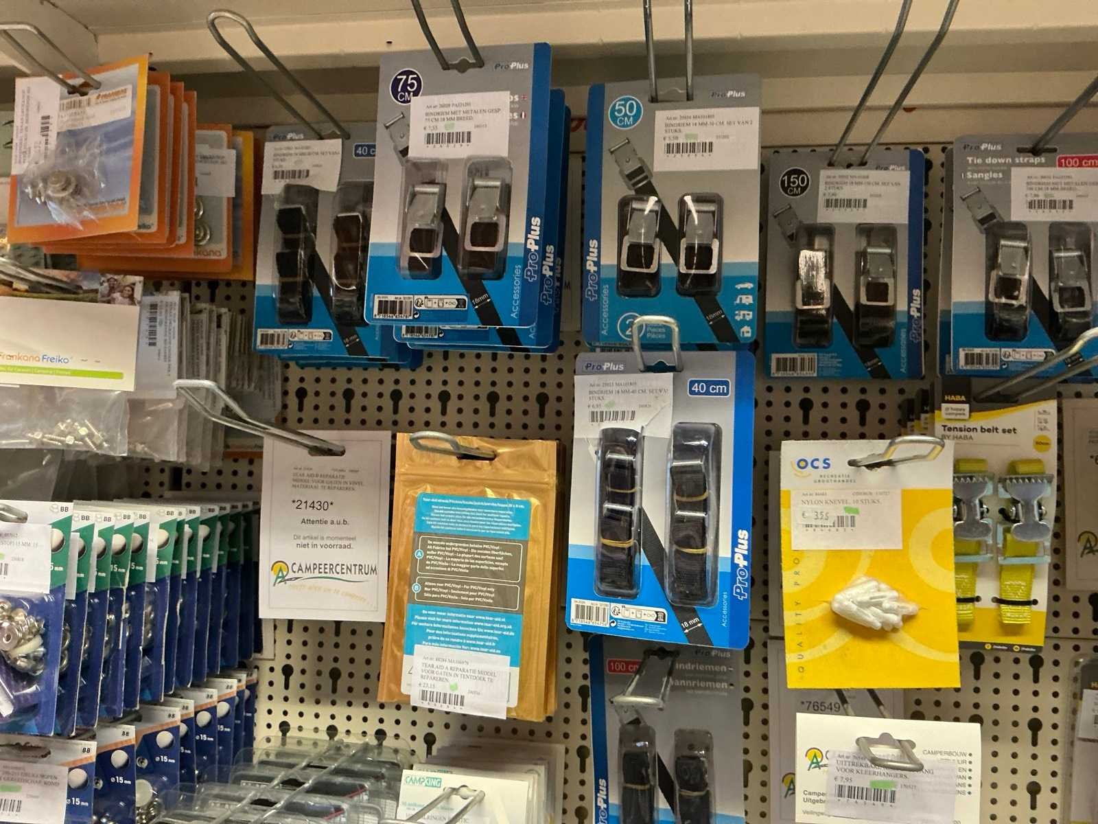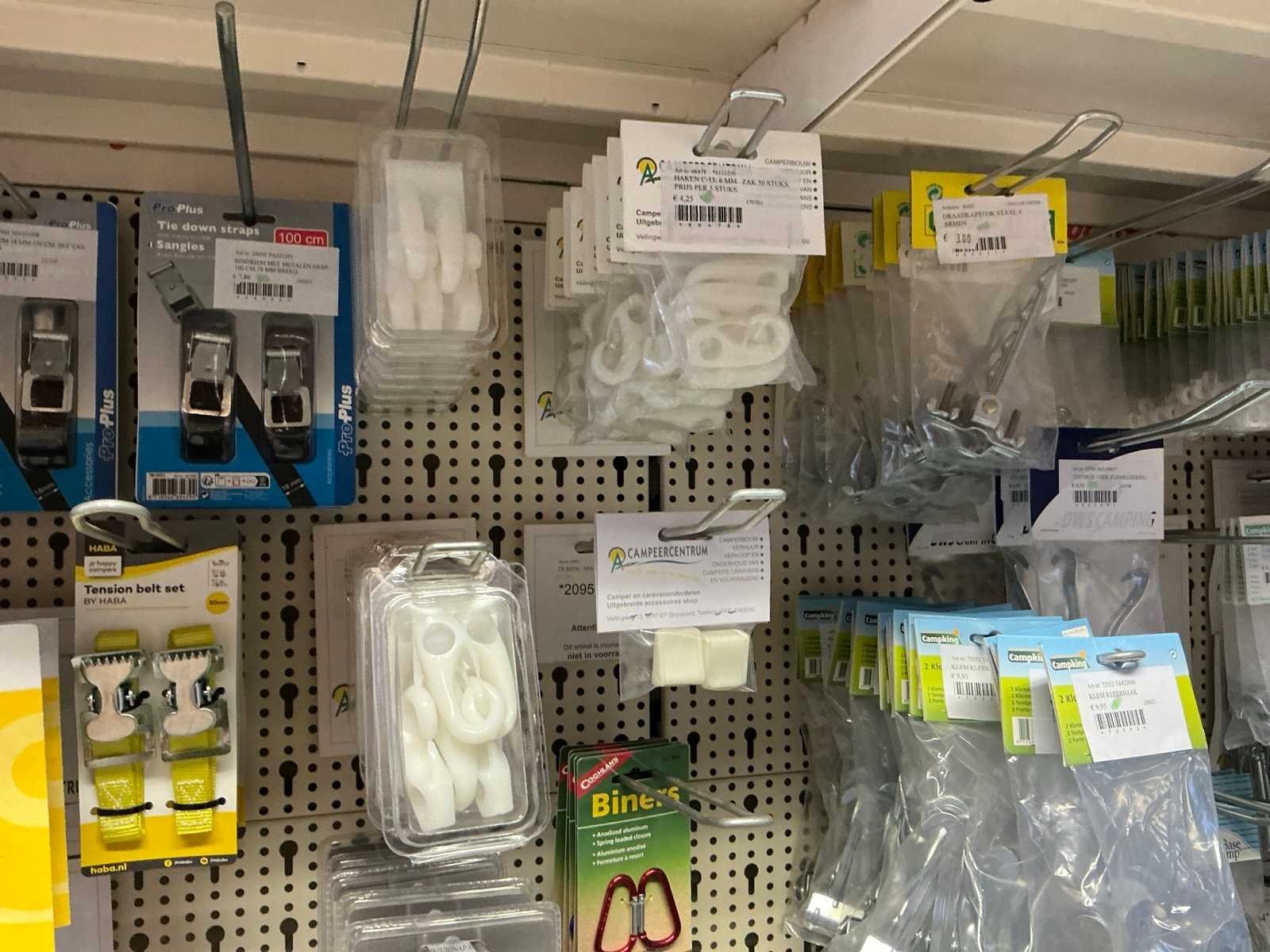 Bestaande uit onder meer: tent en luifelonderdelen, dopjes, hoekstukken, knikstukken tentclips, tentdoekreparatue sets etc, aan 8 secties stelling (exclusief stelling) met 5 blauwe kratten benodigdheden