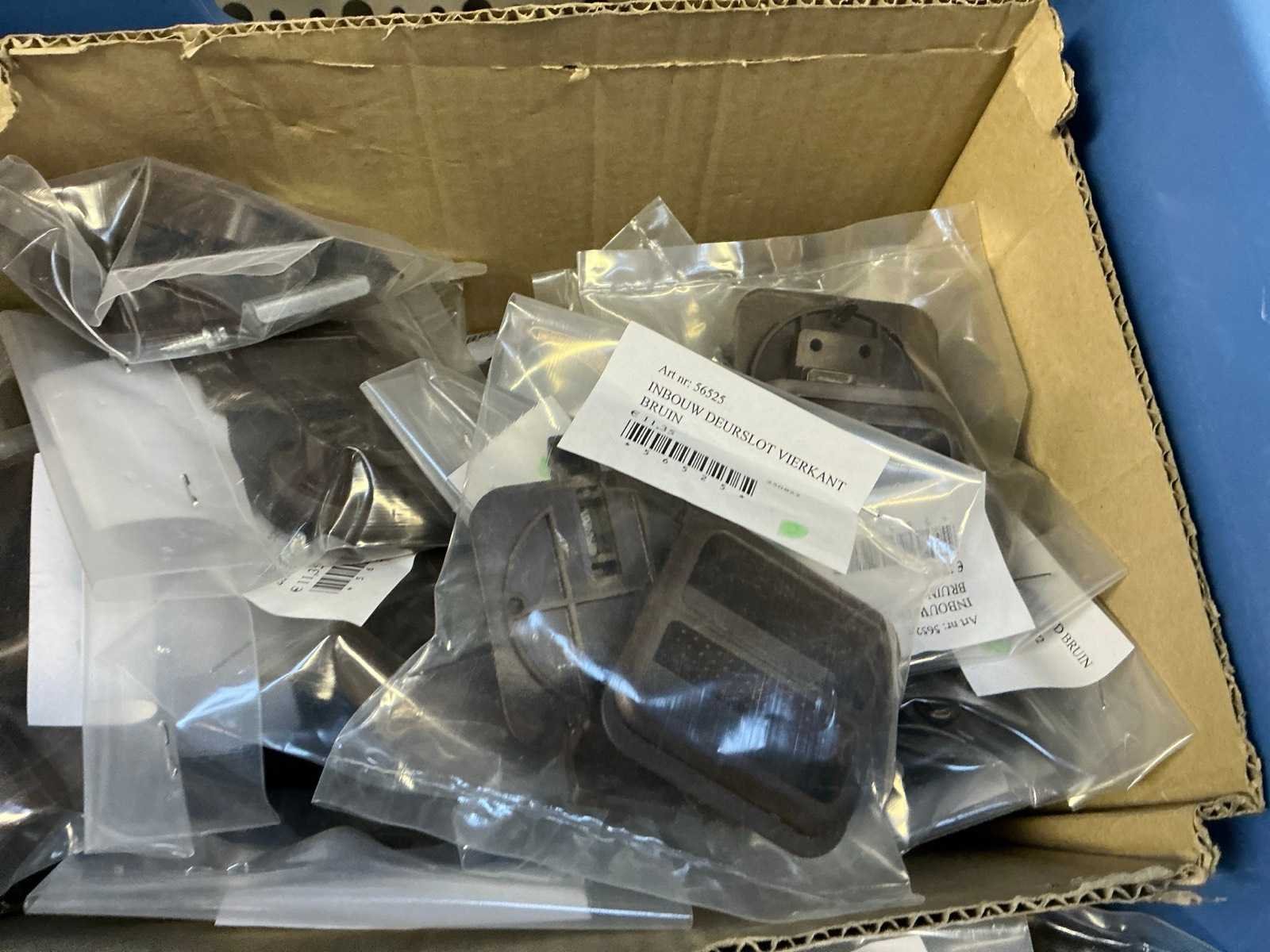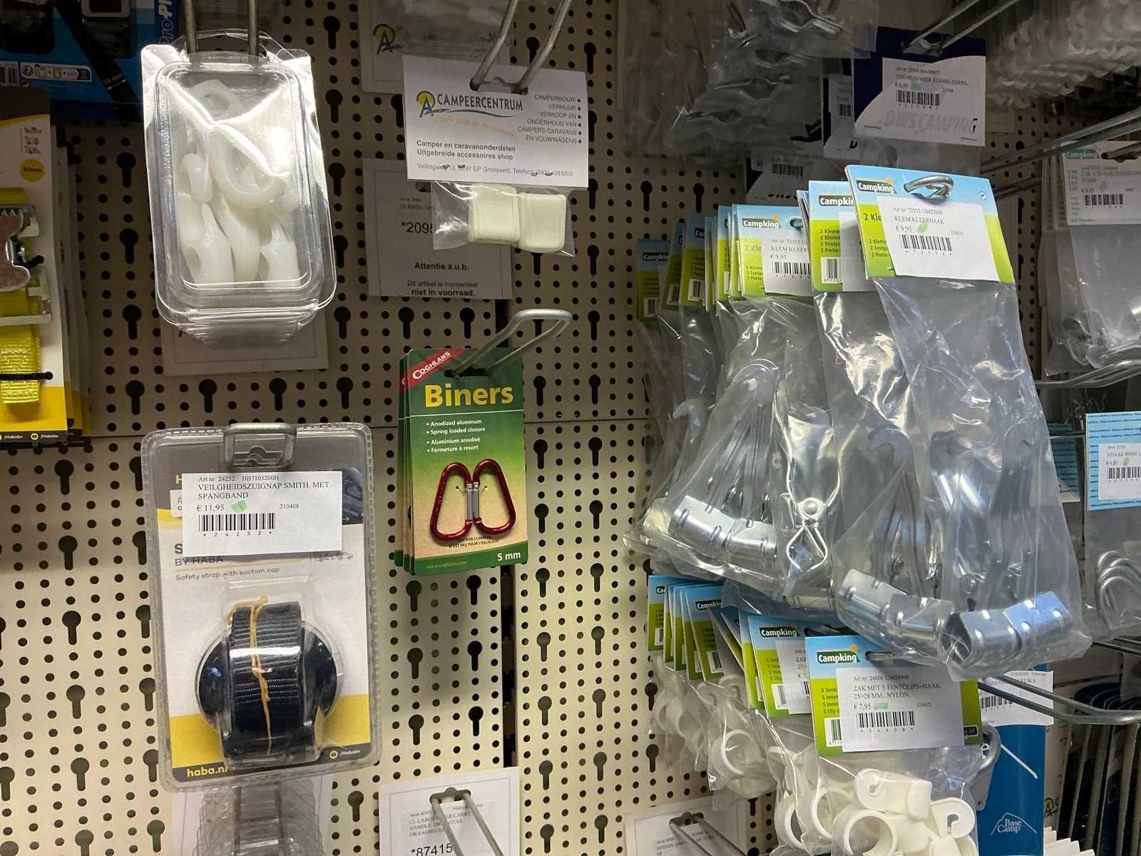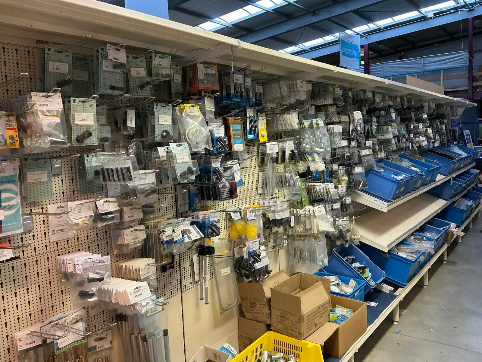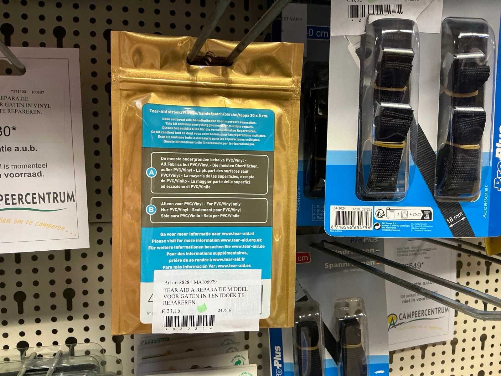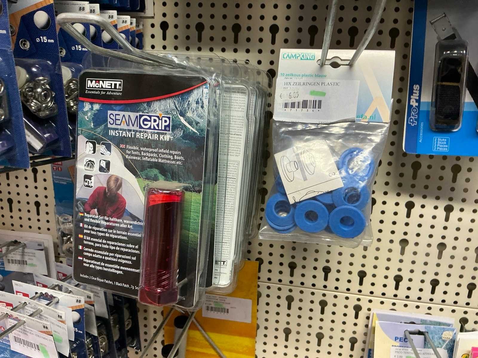 Bestaande uit onder meer: tent en luifelonderdelen, dopjes, hoekstukken, knikstukken tentclips, tentdoekreparatue sets etc, aan 8 secties stelling (exclusief stelling) met 5 blauwe kratten benodigdheden