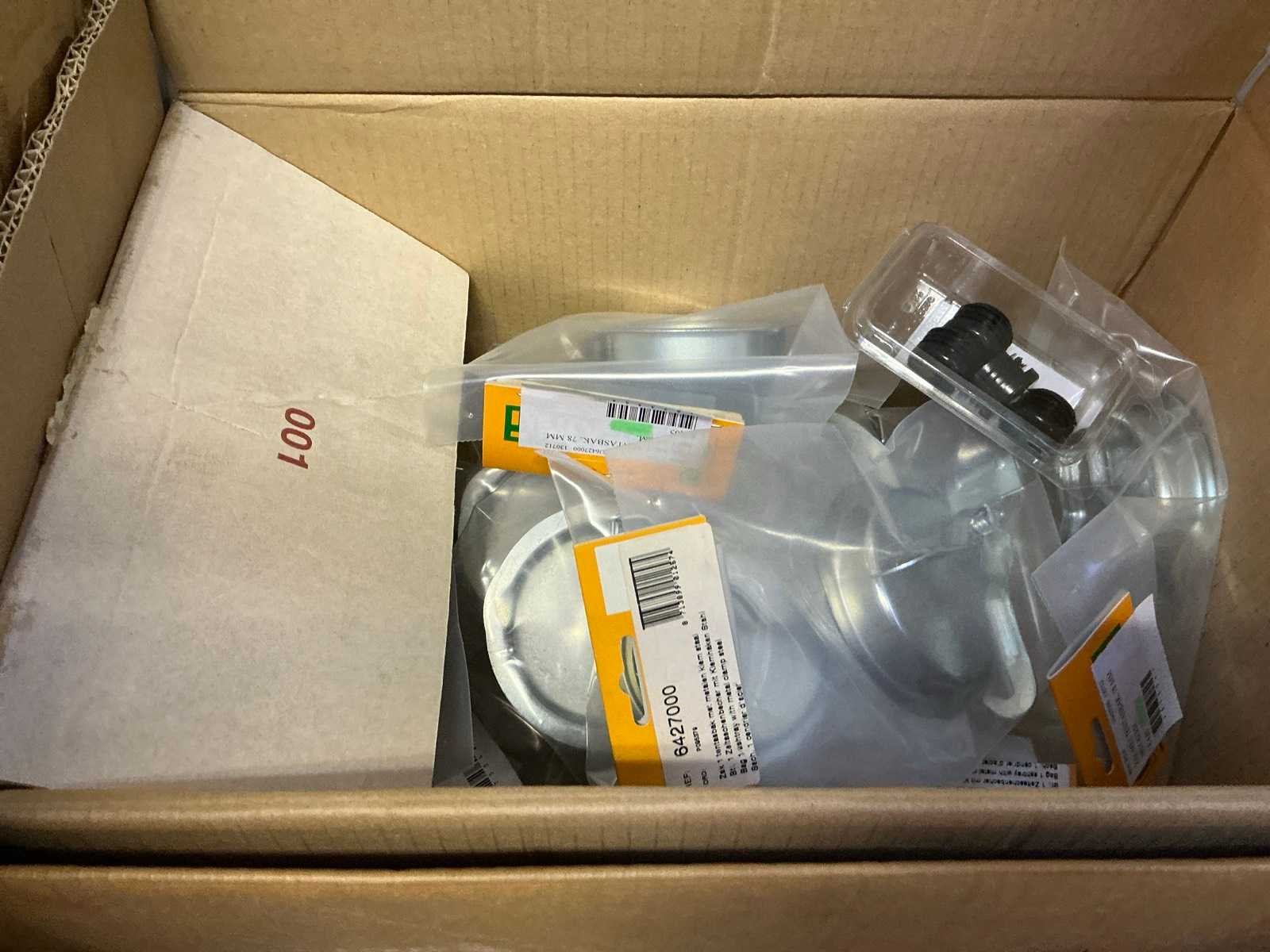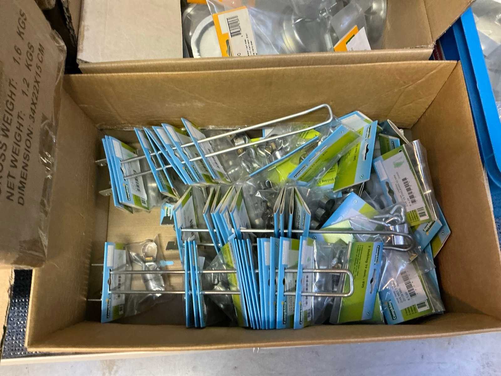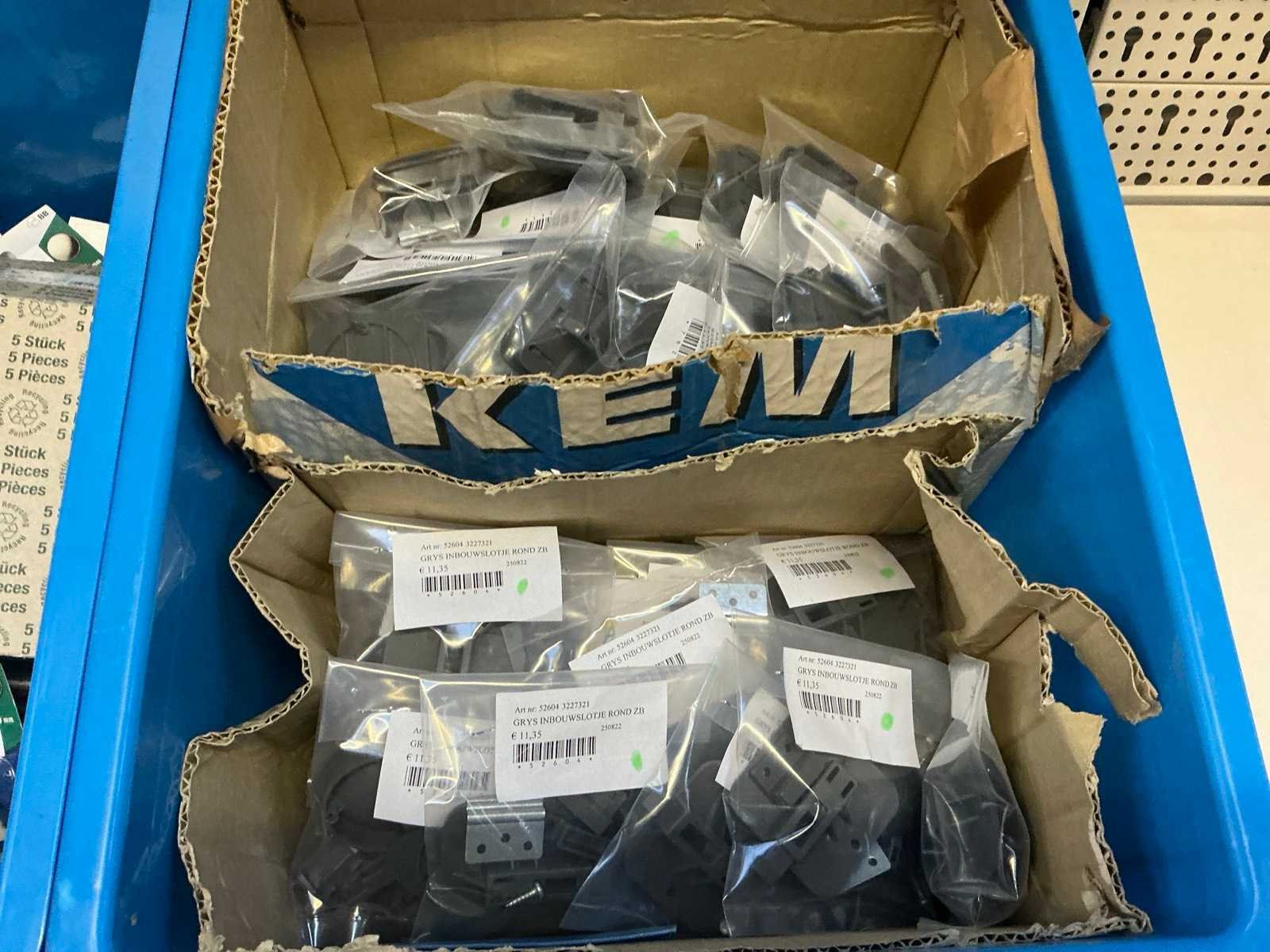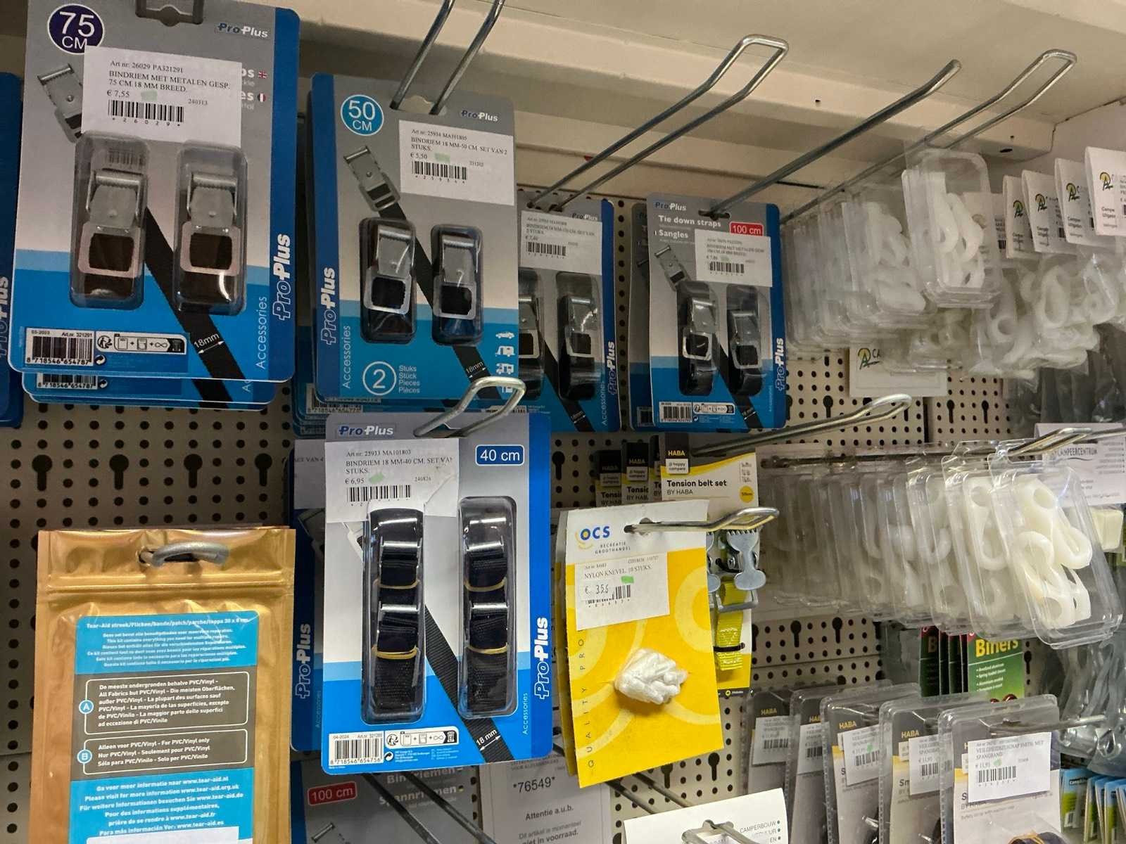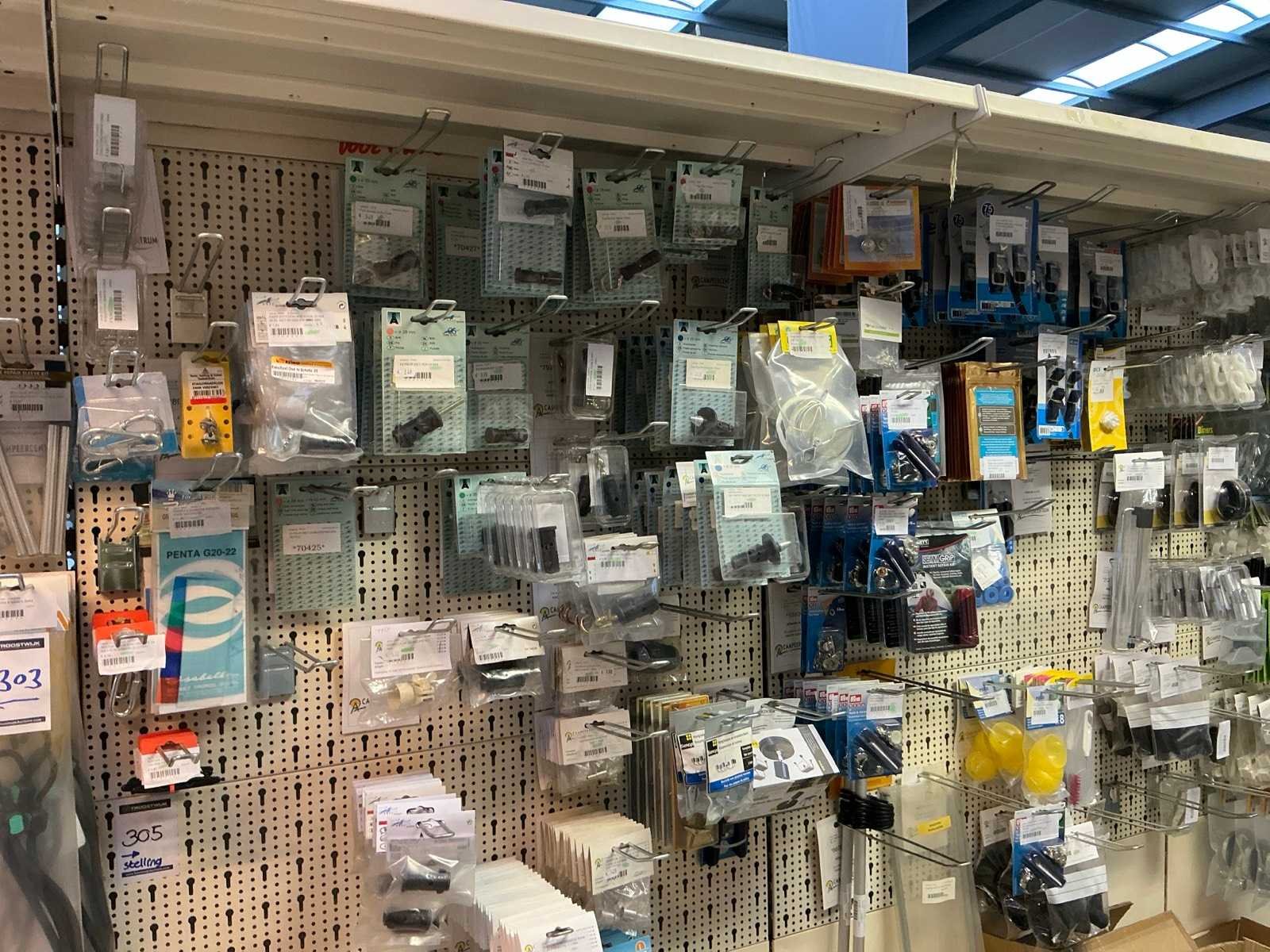 Bestaande uit onder meer: tent en luifelonderdelen, dopjes, hoekstukken, knikstukken tentclips, tentdoekreparatue sets etc, aan 8 secties stelling (exclusief stelling) met 5 blauwe kratten benodigdheden