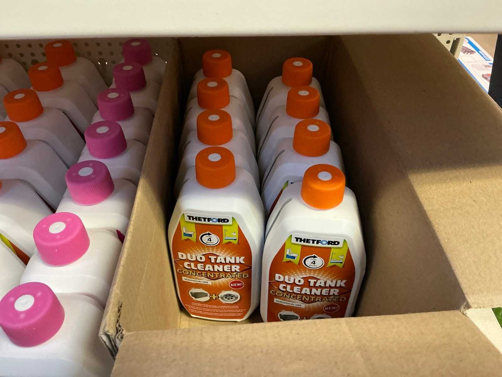 Ca. 40 flessen Thetford grijswatertankreiniger en partij toiletbrilhoezen