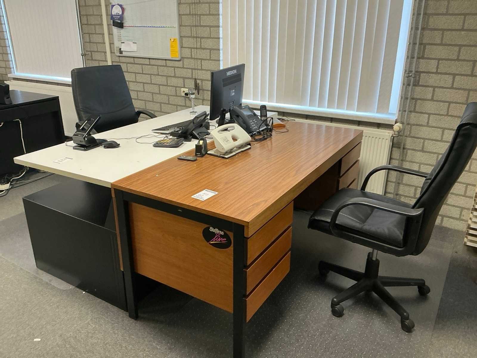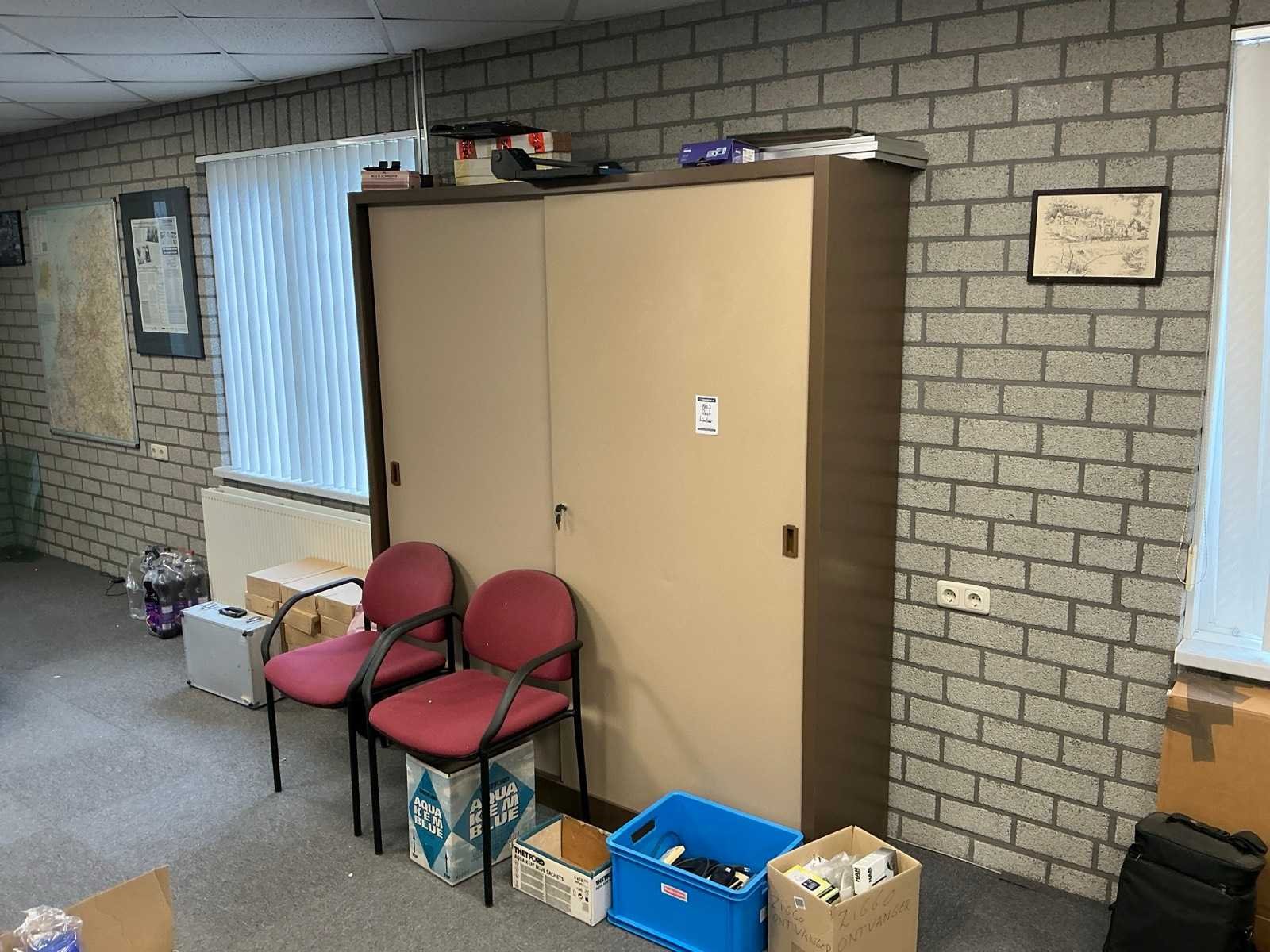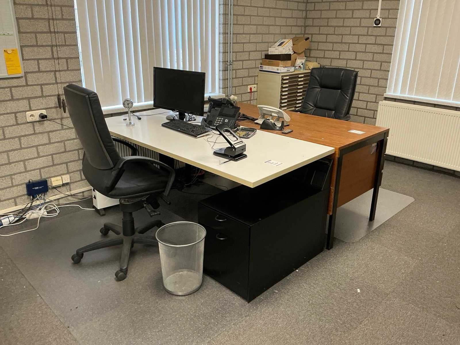Bestaande uit onder meer: 2 bureaus met stoelen, 1 directiebureau, 1 bezoekerstafel met 5 stoelen, 3 lage schuifdeurkasten, 1 hoge schuifdeurkast, 2 ladekasten, porte-manteaus, papierversnipperaar, geldtelmachine etc.