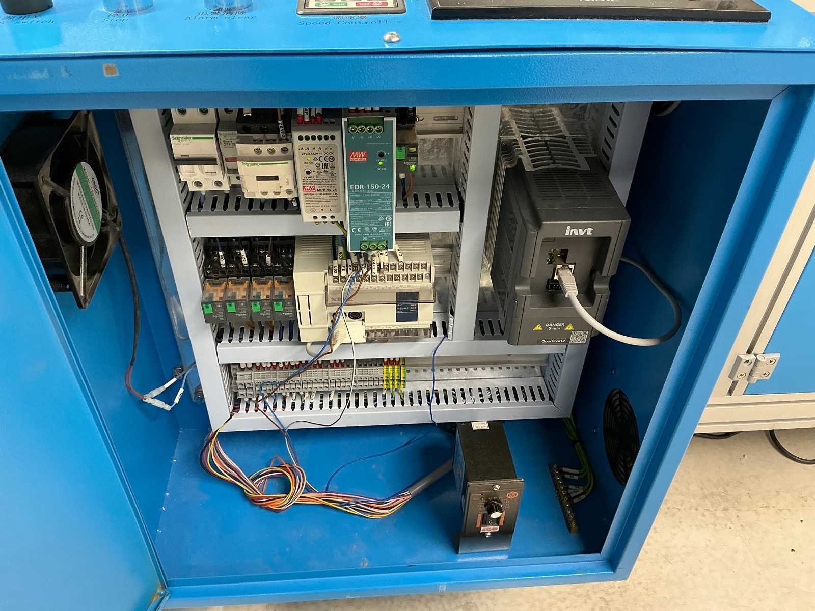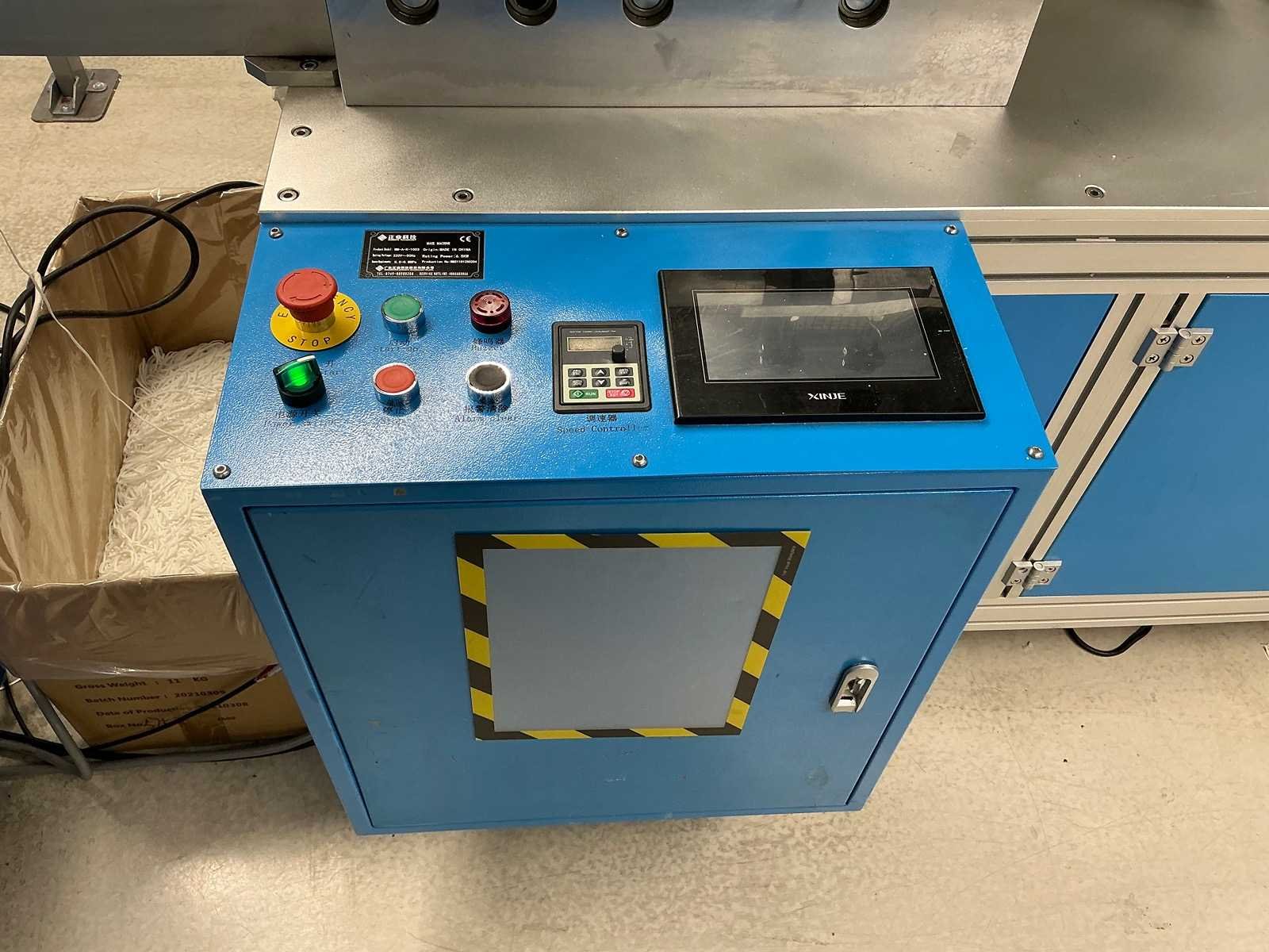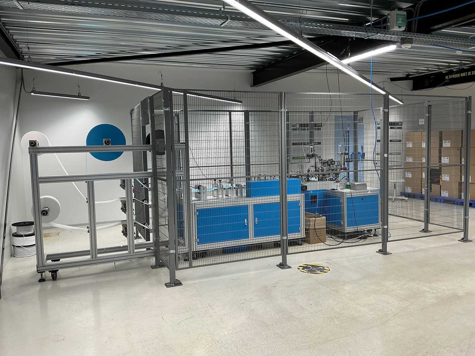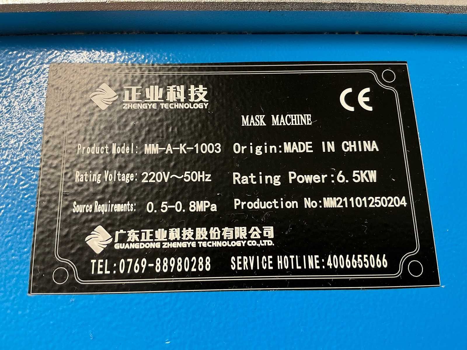 Producent Zhengye Technology; Chirurgisch mondmasker type llR, blauw, elastiek; power 6,5kw; reële capaciteit 3.000 per uur; mask size LxW 175mmx95mm; voorzien van Troax Smartfix veiligheidskooi Merk: Mask Machine Type: MM-A-K-1003 Bouwjaar: 2020 Aansluiting: 220V Totale afmeting L: 4600mm Totale afmeting Breedte: 3300mm Totale afmeting Hoogte: 2050mm