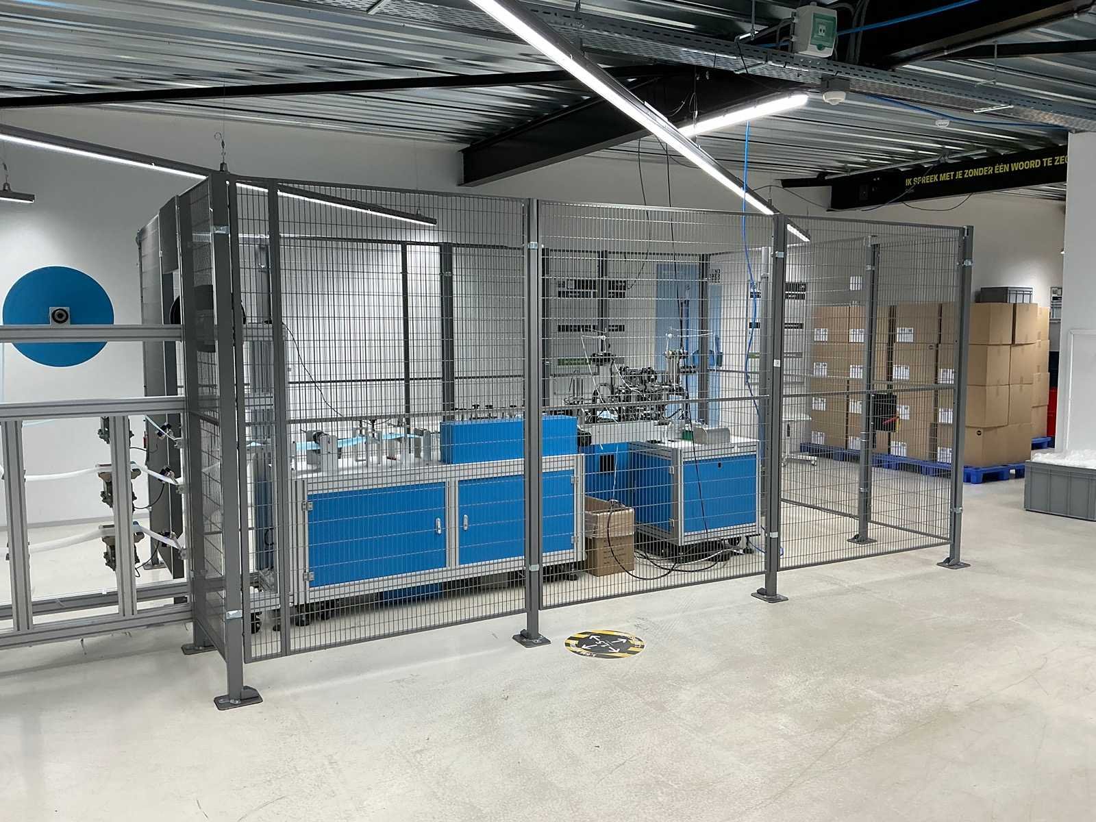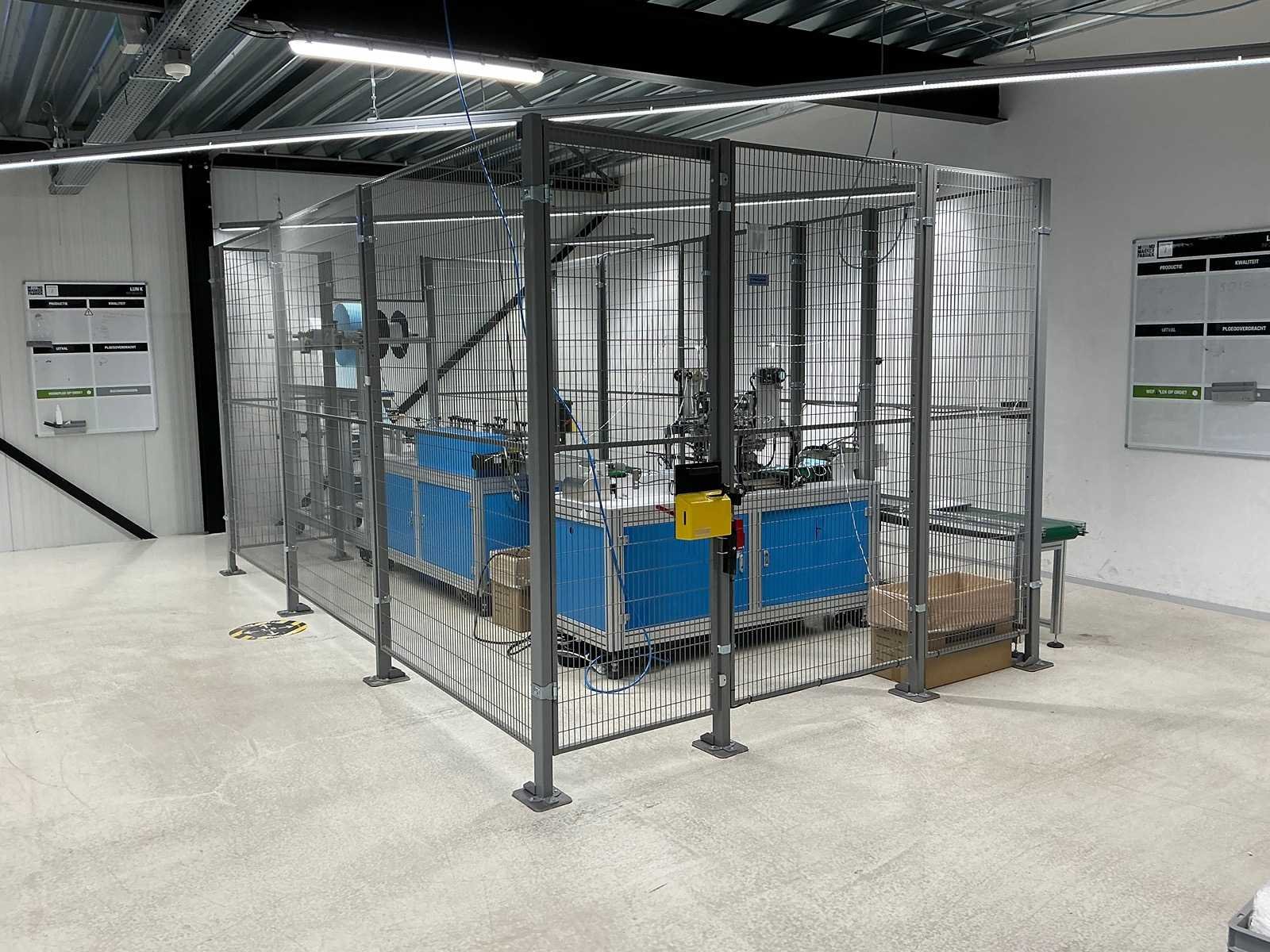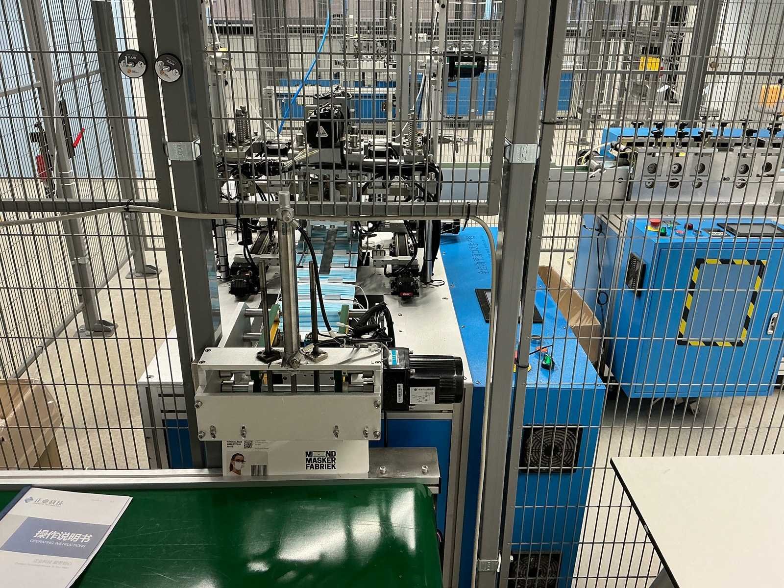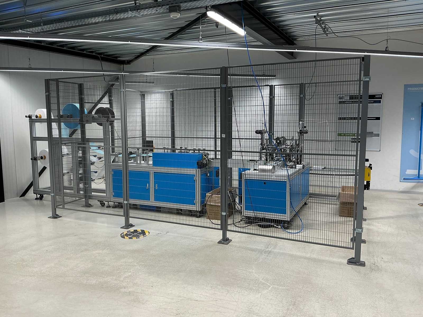 Producent Zhengye Technology; Chirurgisch mondmasker type llR, blauw, elastiek; power 6,5kw; reële capaciteit 3.000 per uur; mask size LxW 175mmx95mm; voorzien van Troax Smartfix veiligheidskooi Merk: Mask Machine Type: MM-A-K-1003 Bouwjaar: 2020 Aansluiting: 220V Totale afmeting L: 4600mm Totale afmeting Breedte: 3300mm Totale afmeting Hoogte: 2050mm