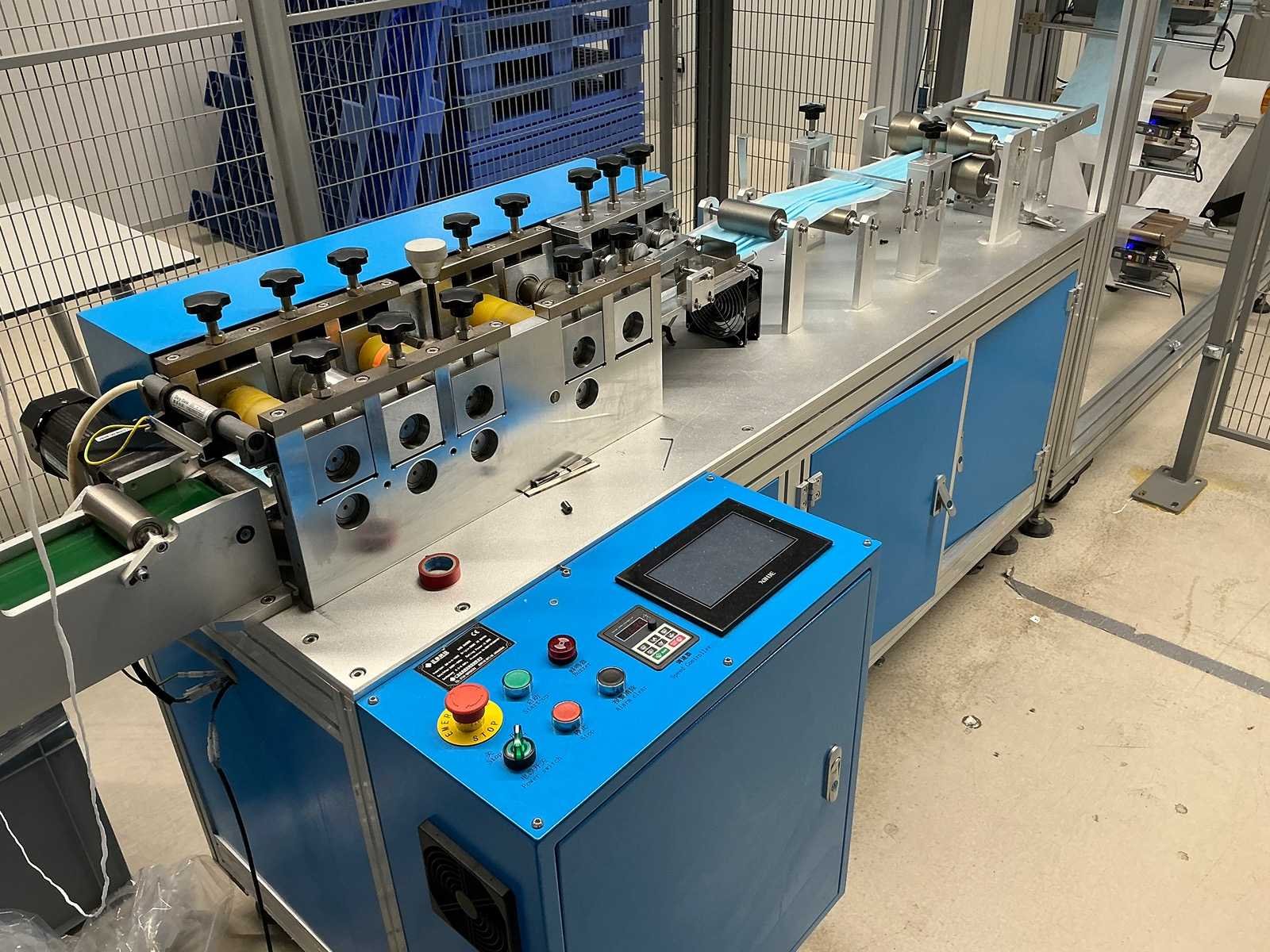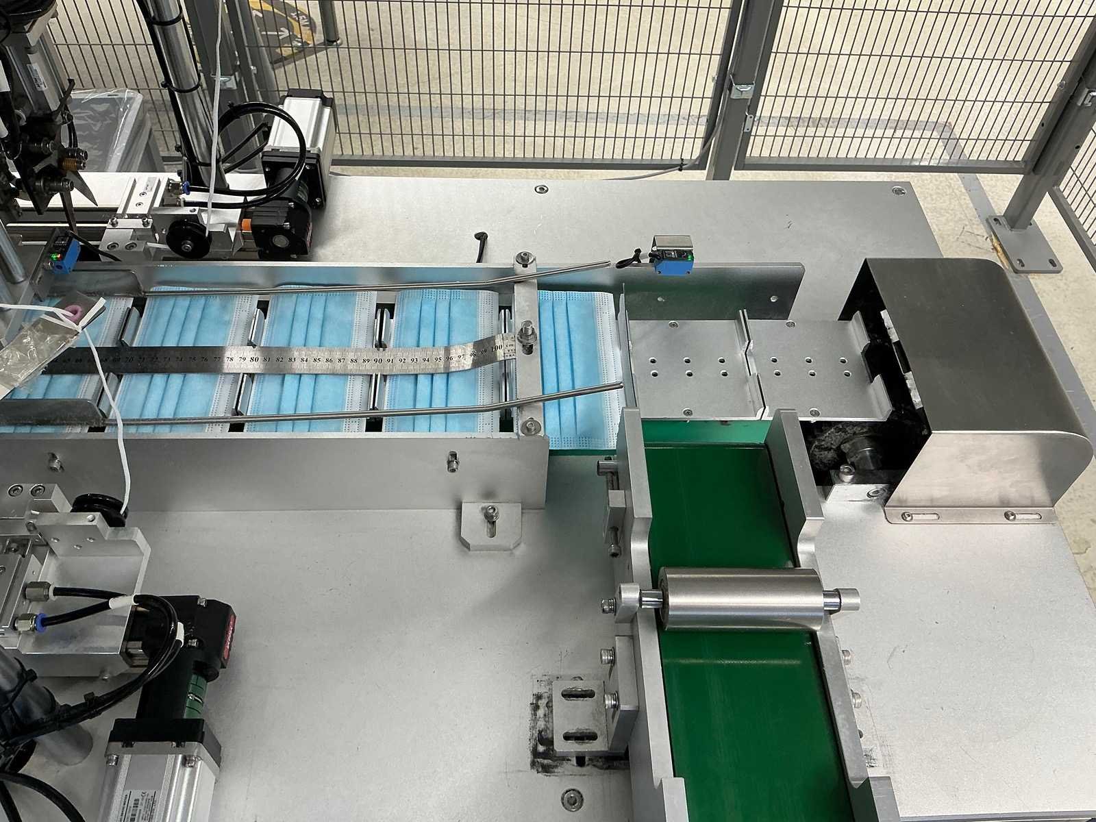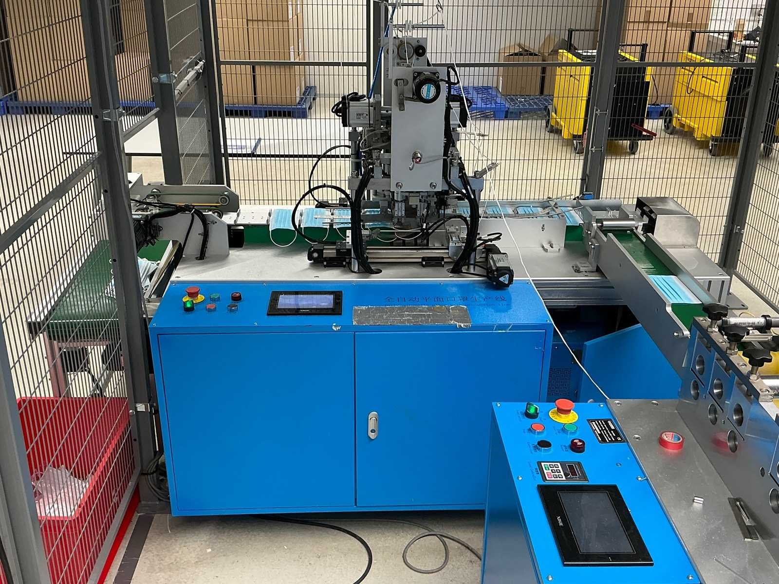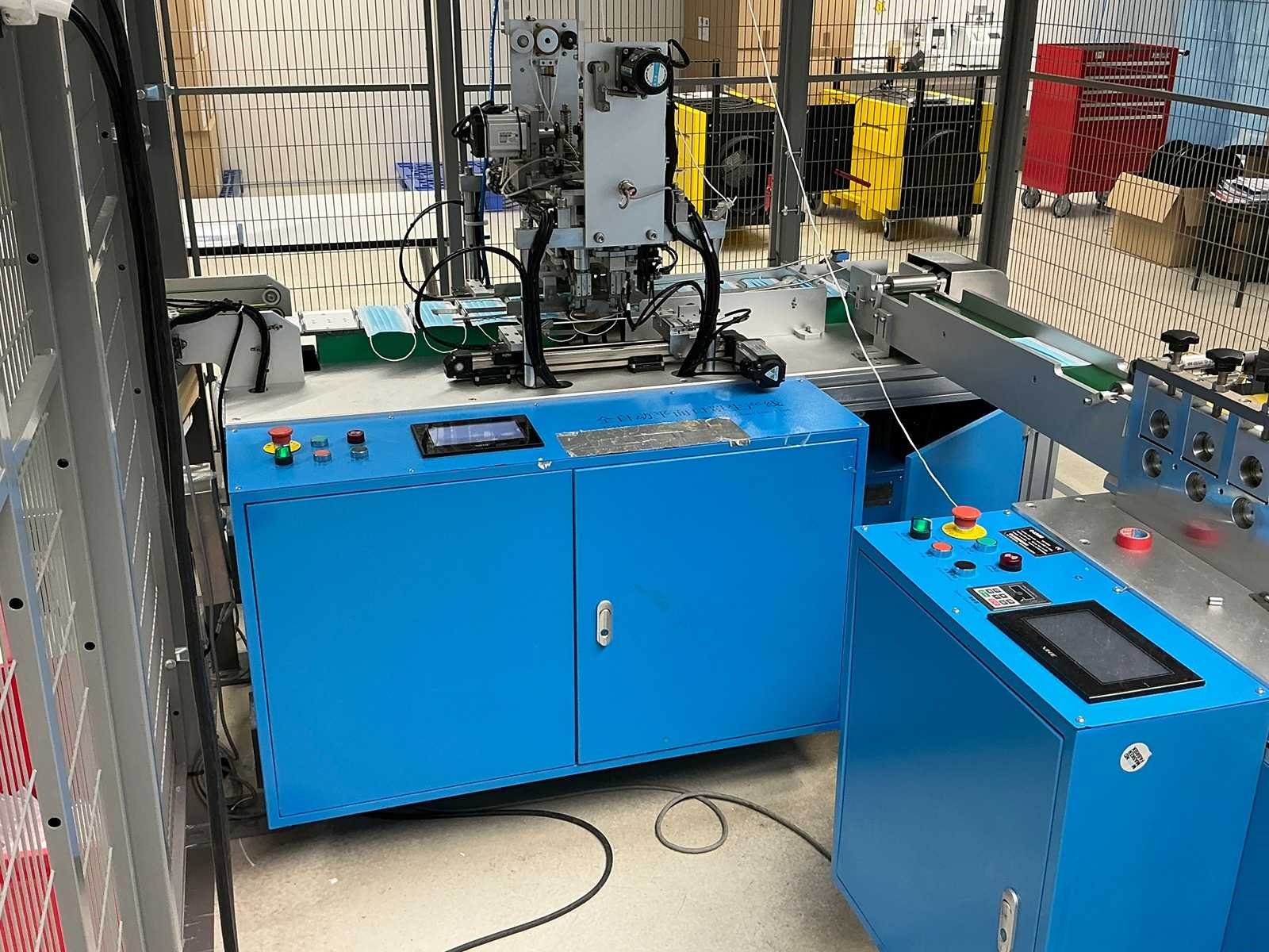 Producent Zhengye Technology; Chirurgisch mondmasker type llR, blauw, elastiek; power 6,5kw; reële capaciteit 3.000 per uur; mask size LxW 175mmx95mm; voorzien van Troax Smartfix veiligheidskooi Merk: Mask Machine Type: MM-A-K-1003 Bouwjaar: 2020 Aansluiting: 220V Totale afmeting L: 4600mm Totale afmeting Breedte: 3300mm Totale afmeting Hoogte: 2050mm