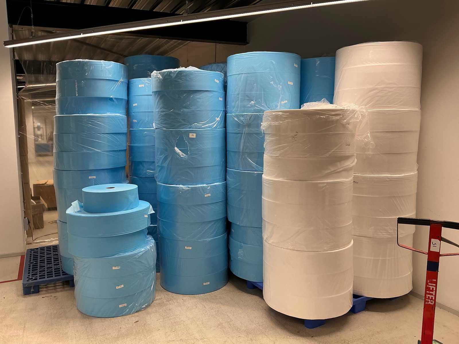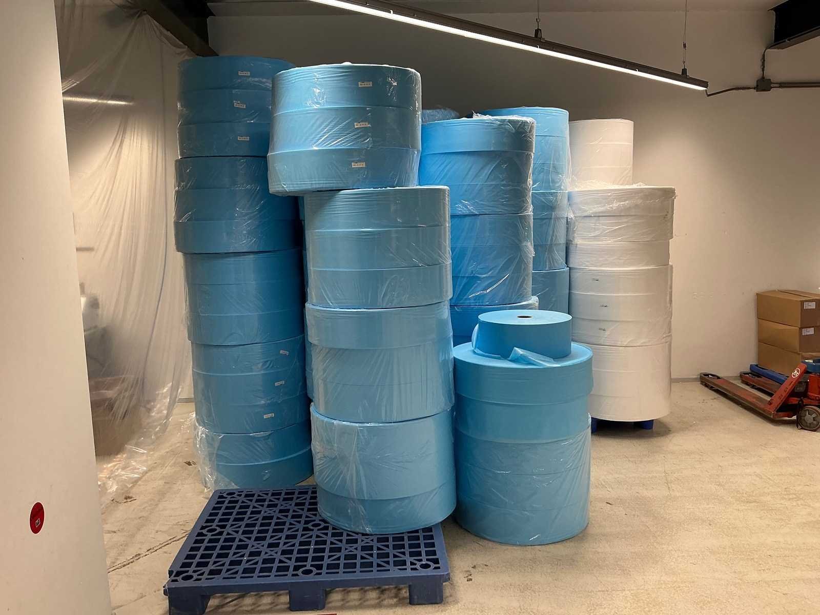 Ca. 120 rollen blauw, breedte 175 mm; ca. 820 rollen wit, breedte 175 mm; 1250 meter per rol