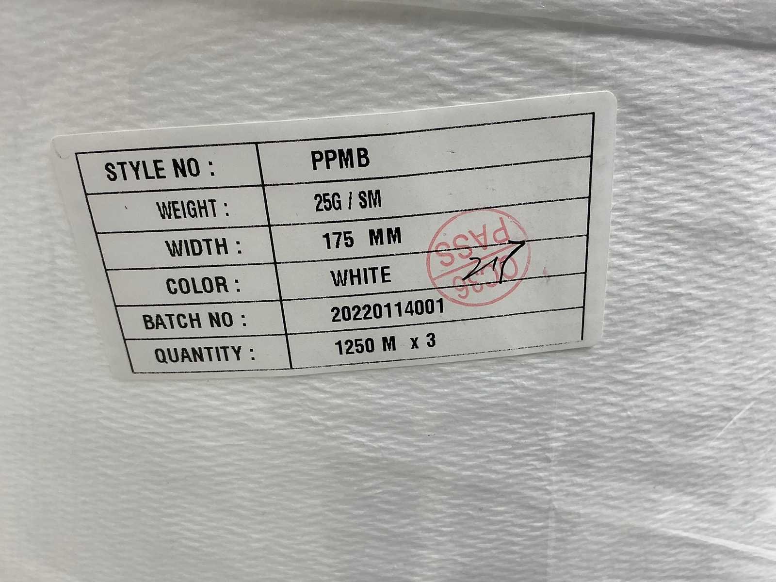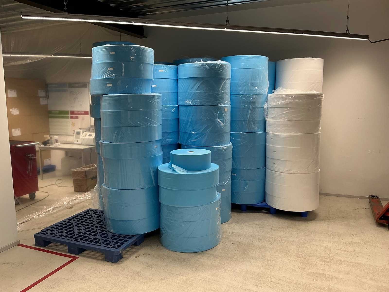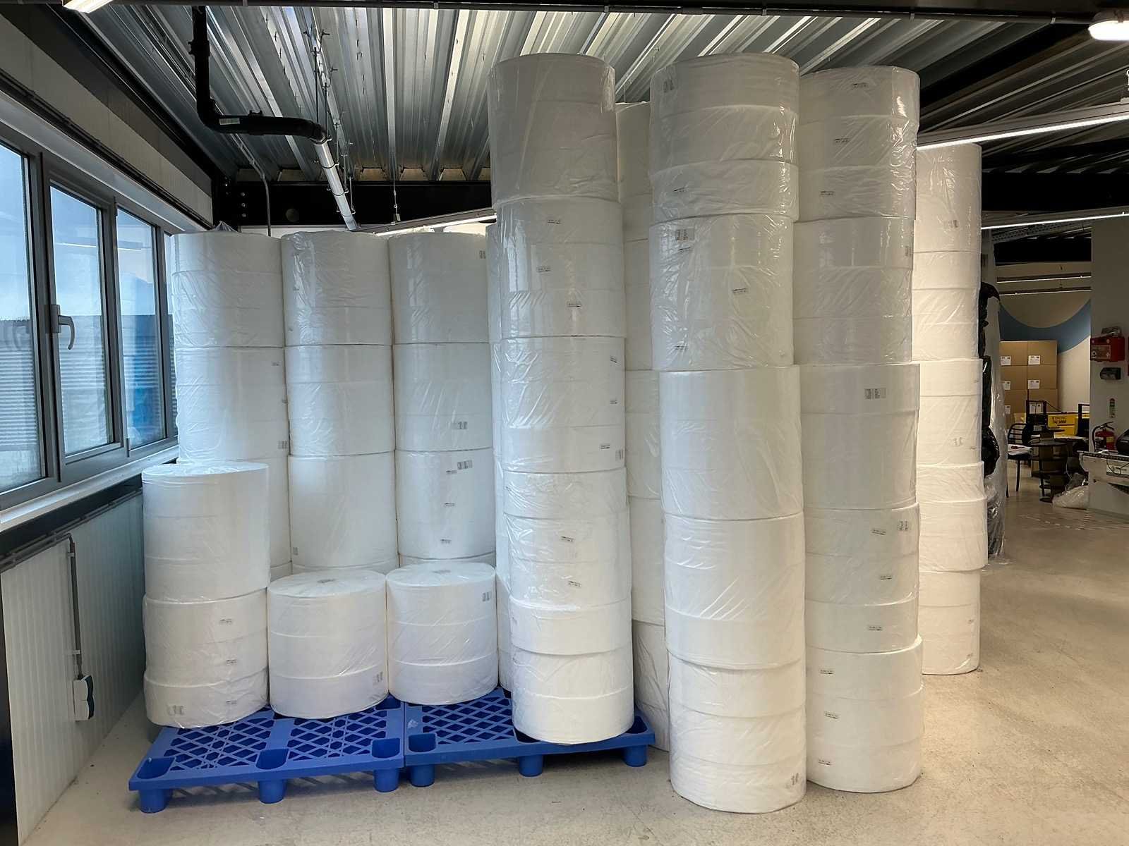 Ca. 120 rollen blauw, breedte 175 mm; ca. 820 rollen wit, breedte 175 mm; 1250 meter per rol