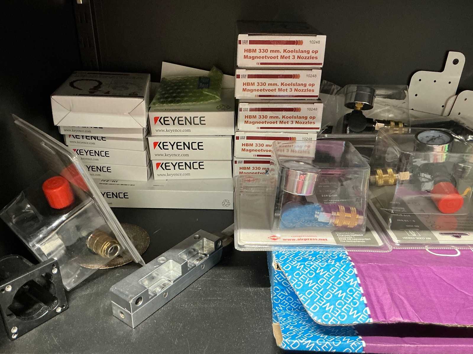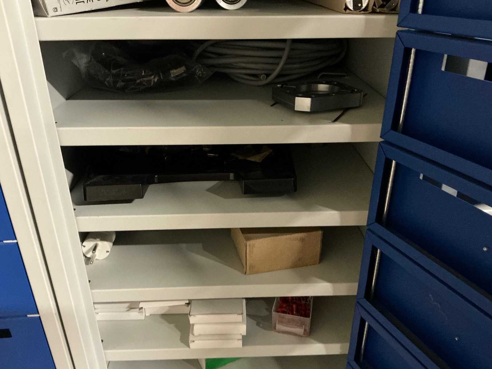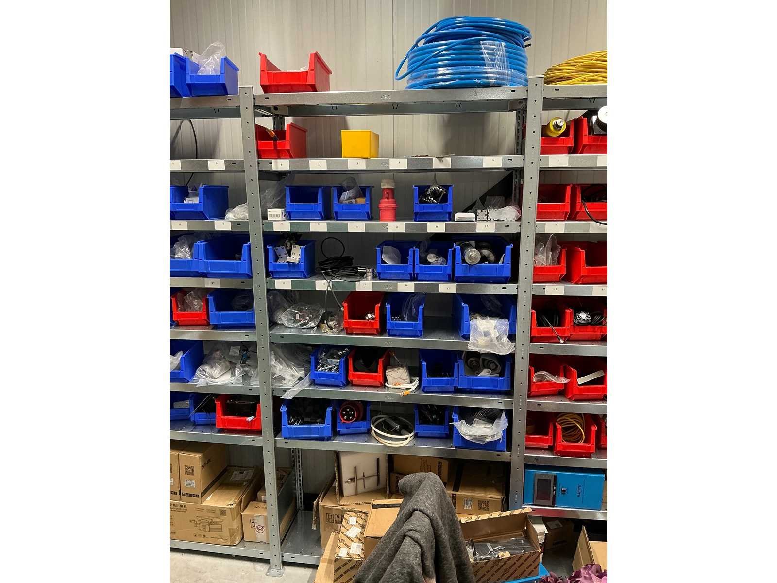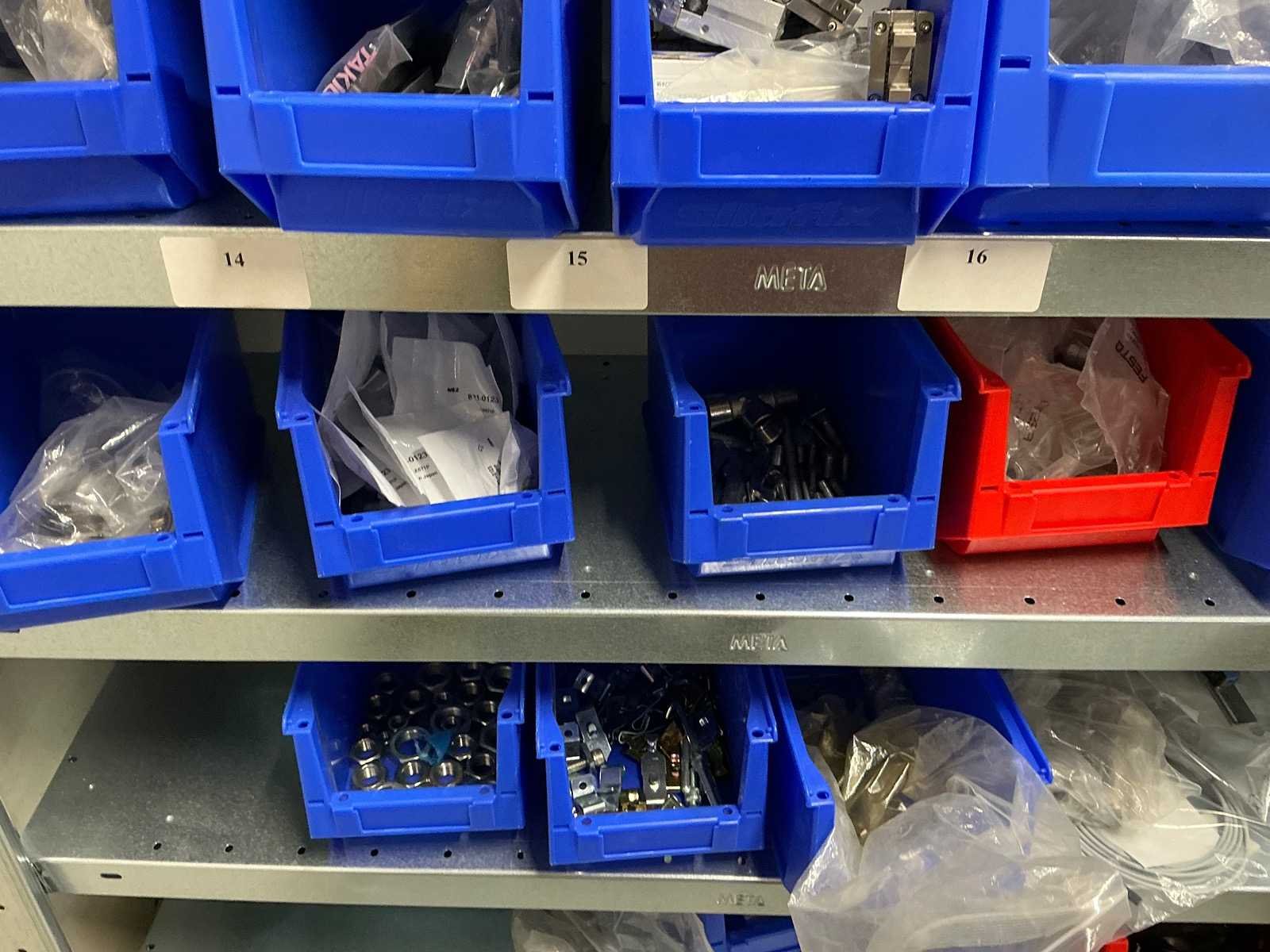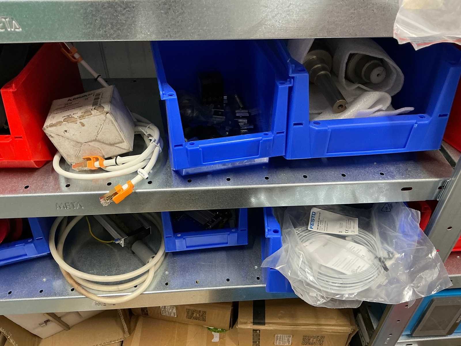 3 secties Meta legbordstelling, 2 stalen kasten met inhoud en 3 delige postvakjeskast met inhoud. Voornamelijk onderdelen voor mondmaskermachines, pneumatische onderdelen, gereedschap etc