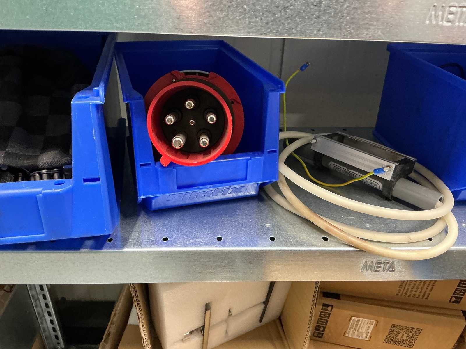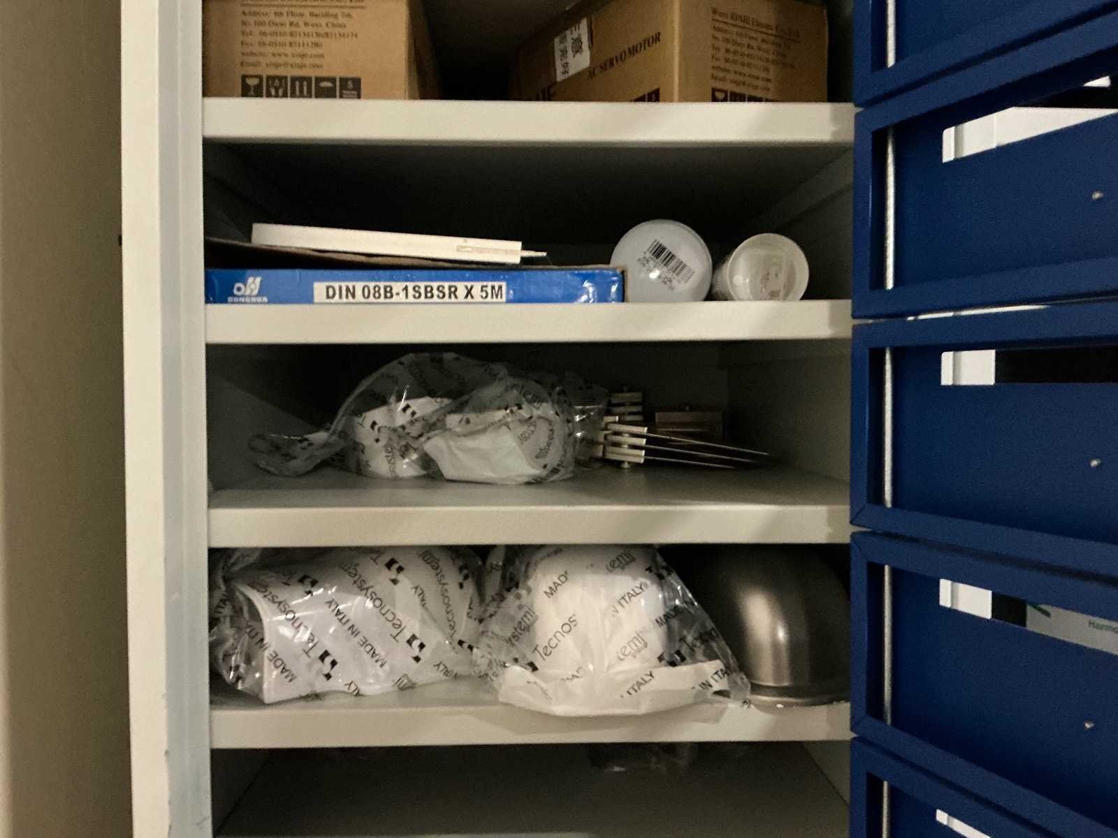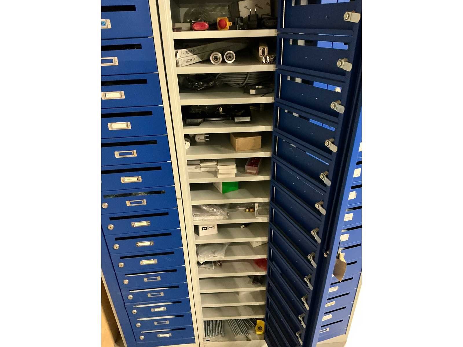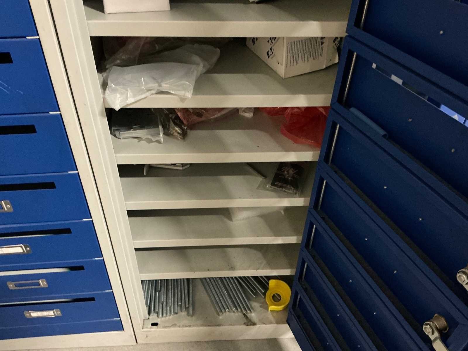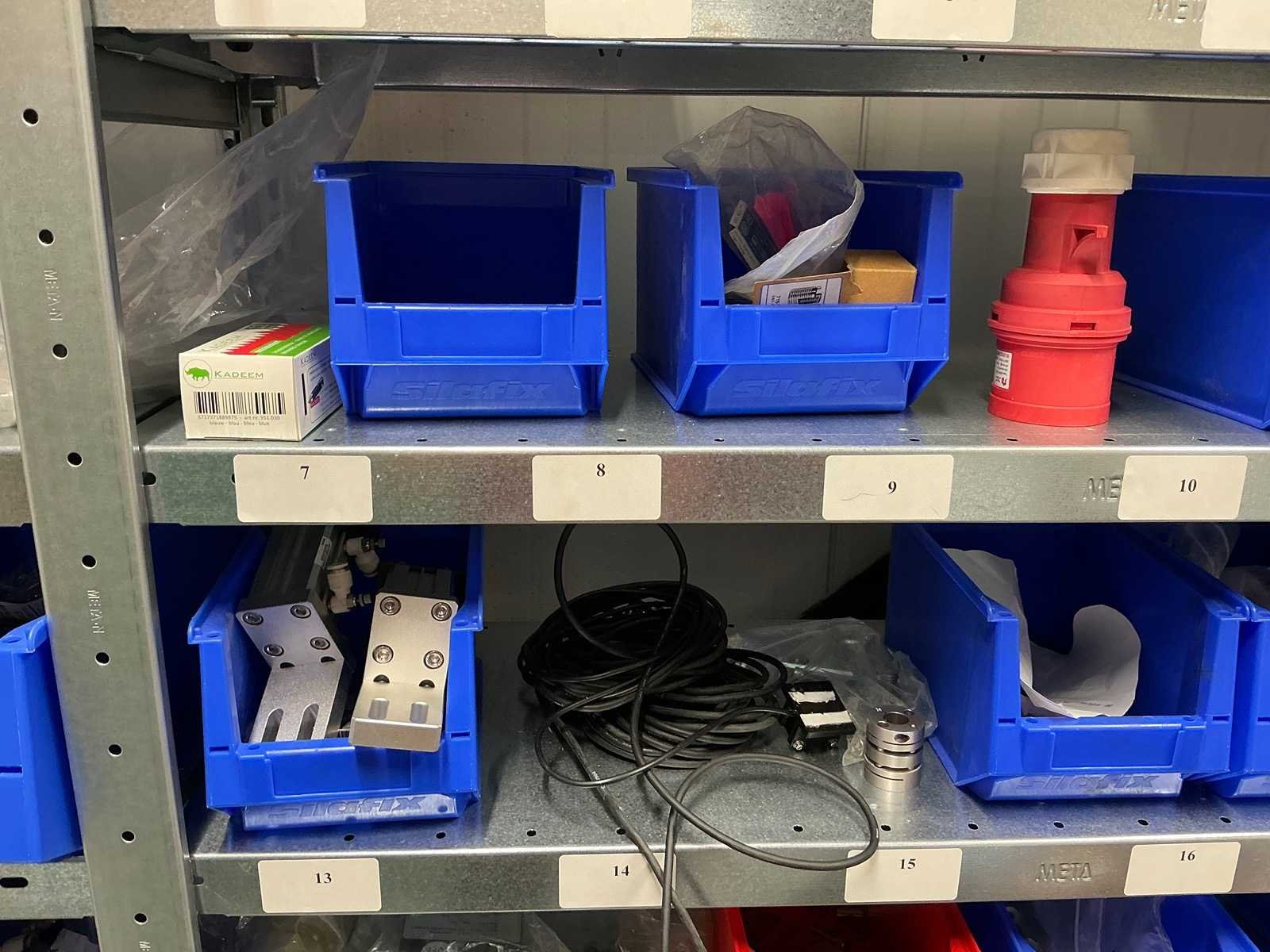 3 secties Meta legbordstelling, 2 stalen kasten met inhoud en 3 delige postvakjeskast met inhoud. Voornamelijk onderdelen voor mondmaskermachines, pneumatische onderdelen, gereedschap etc