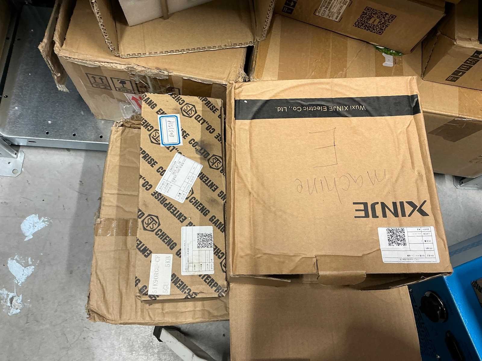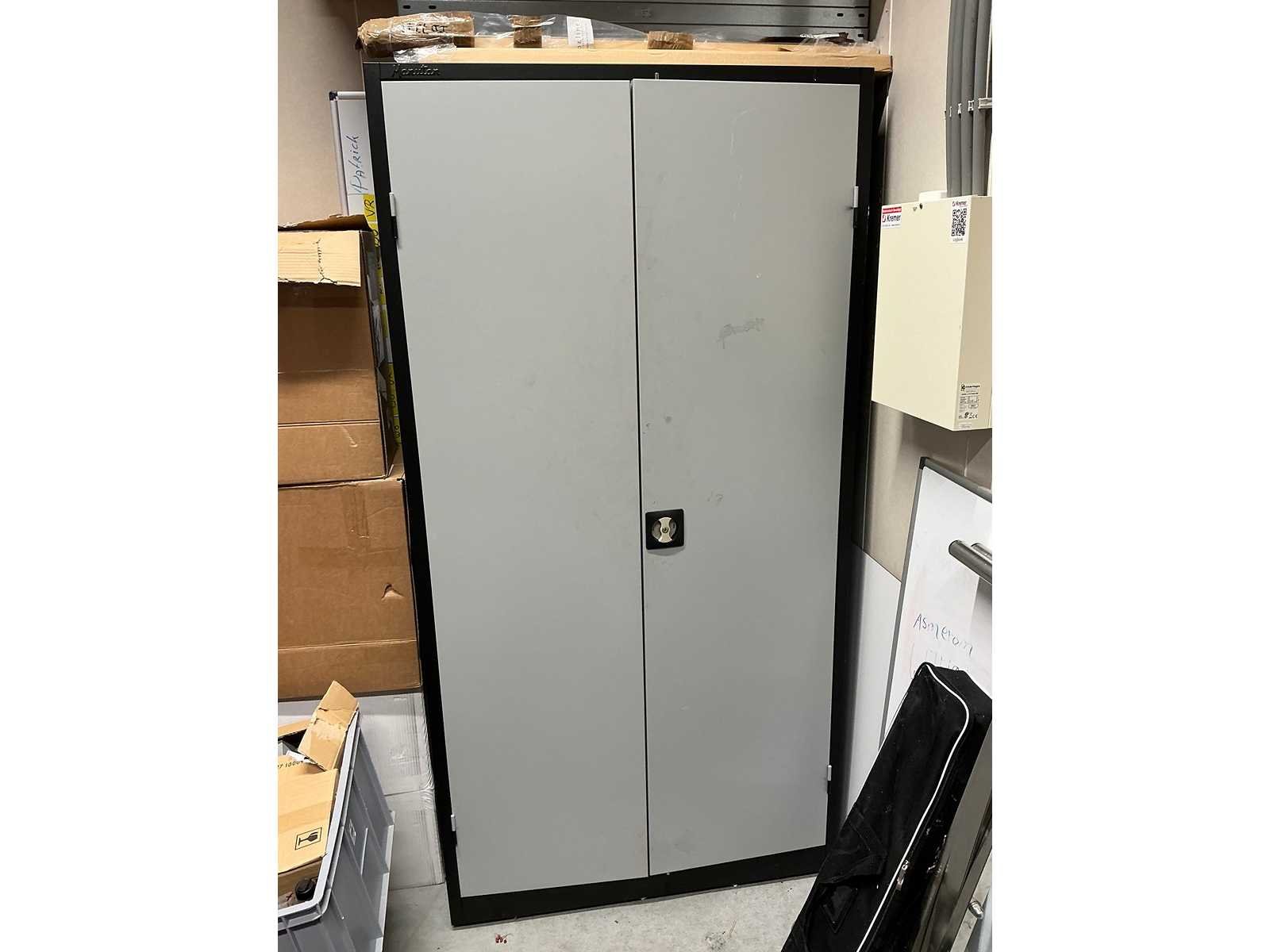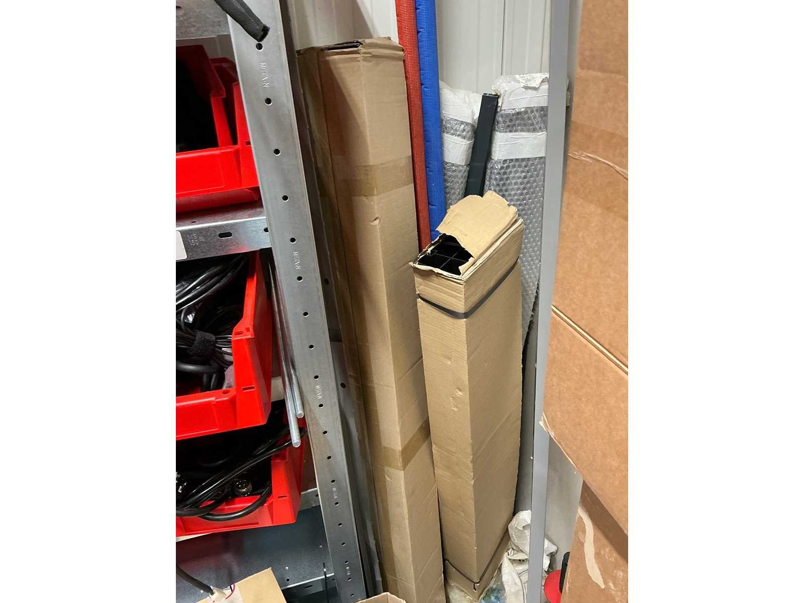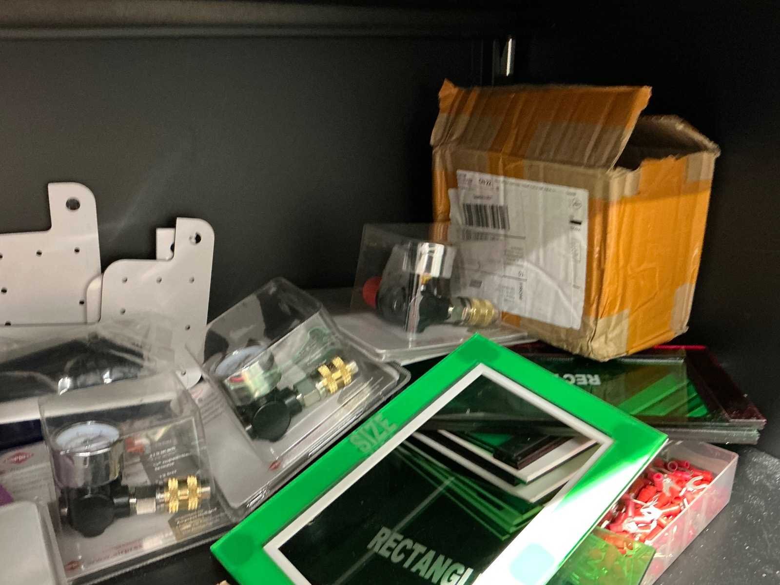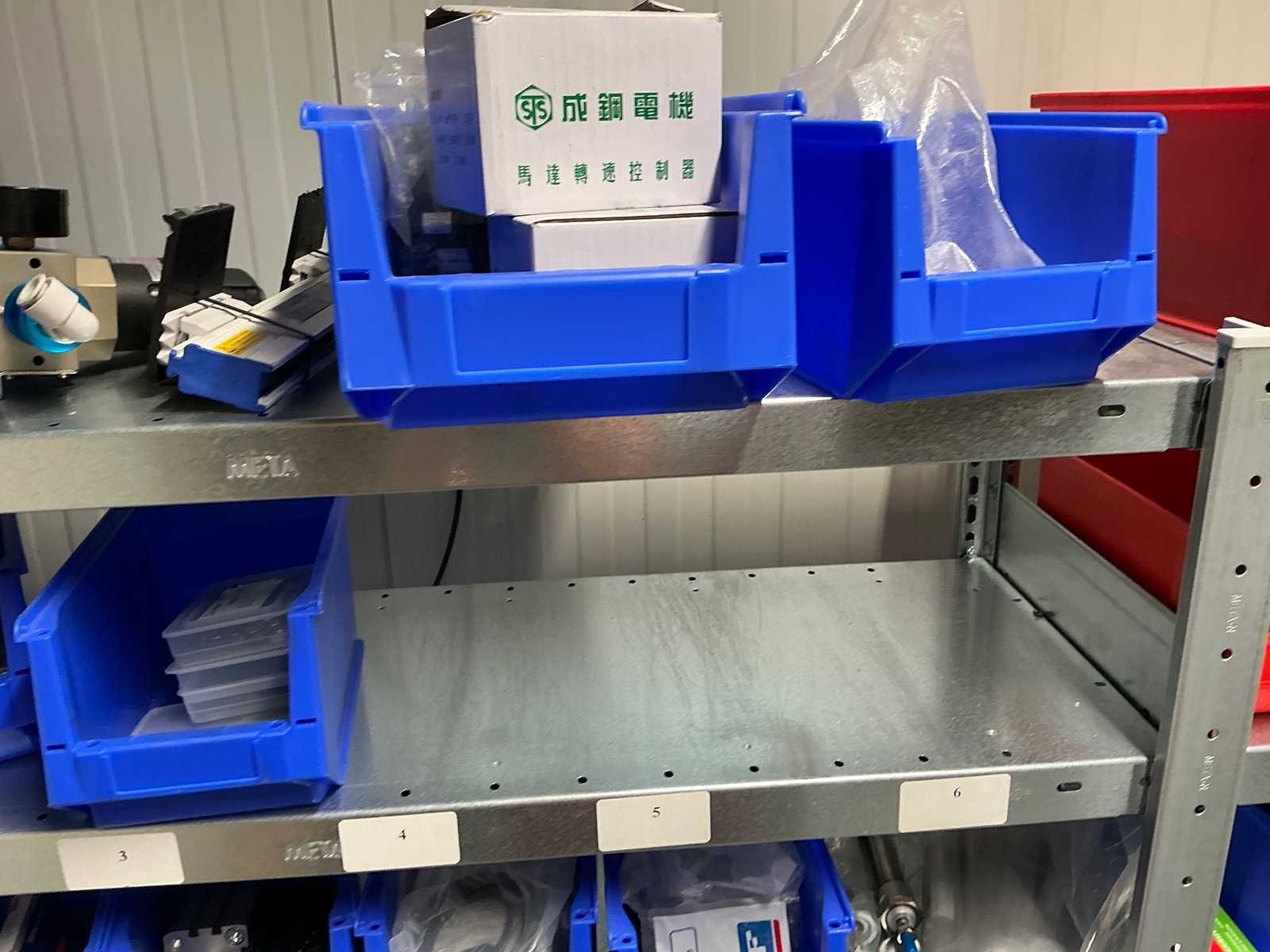 3 secties Meta legbordstelling, 2 stalen kasten met inhoud en 3 delige postvakjeskast met inhoud. Voornamelijk onderdelen voor mondmaskermachines, pneumatische onderdelen, gereedschap etc