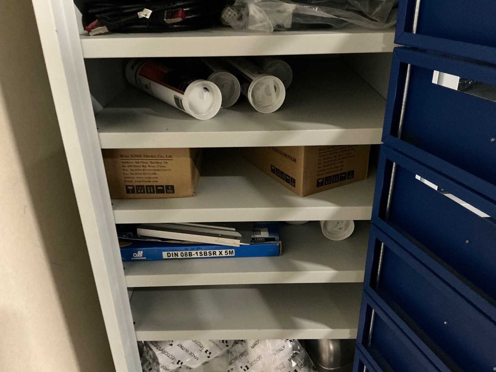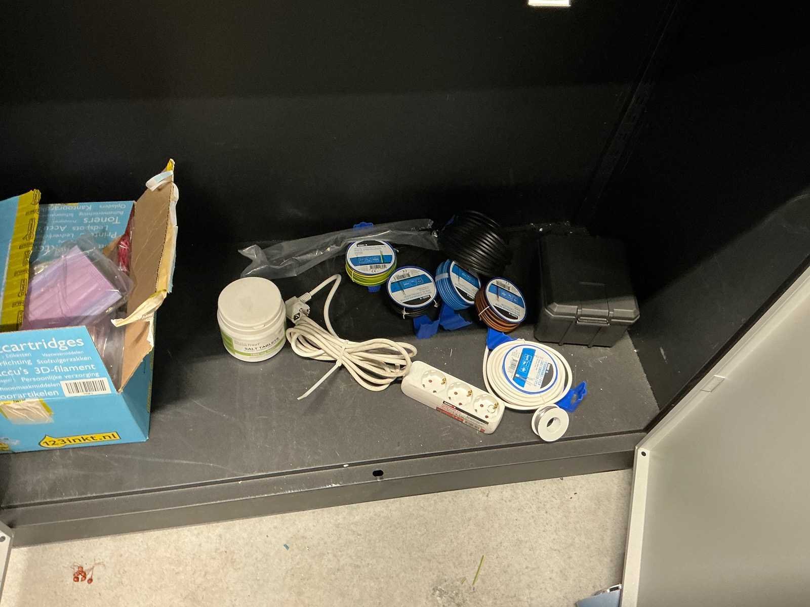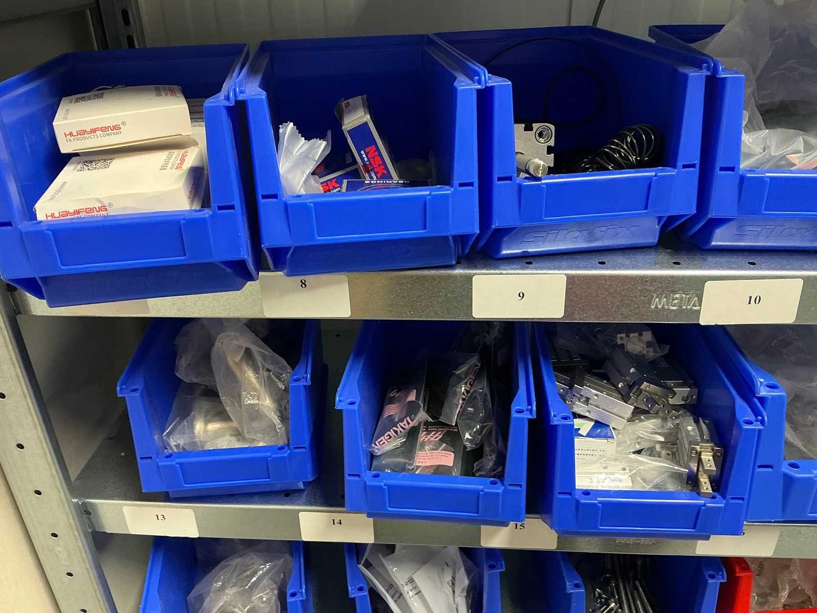 3 secties Meta legbordstelling, 2 stalen kasten met inhoud en 3 delige postvakjeskast met inhoud. Voornamelijk onderdelen voor mondmaskermachines, pneumatische onderdelen, gereedschap etc