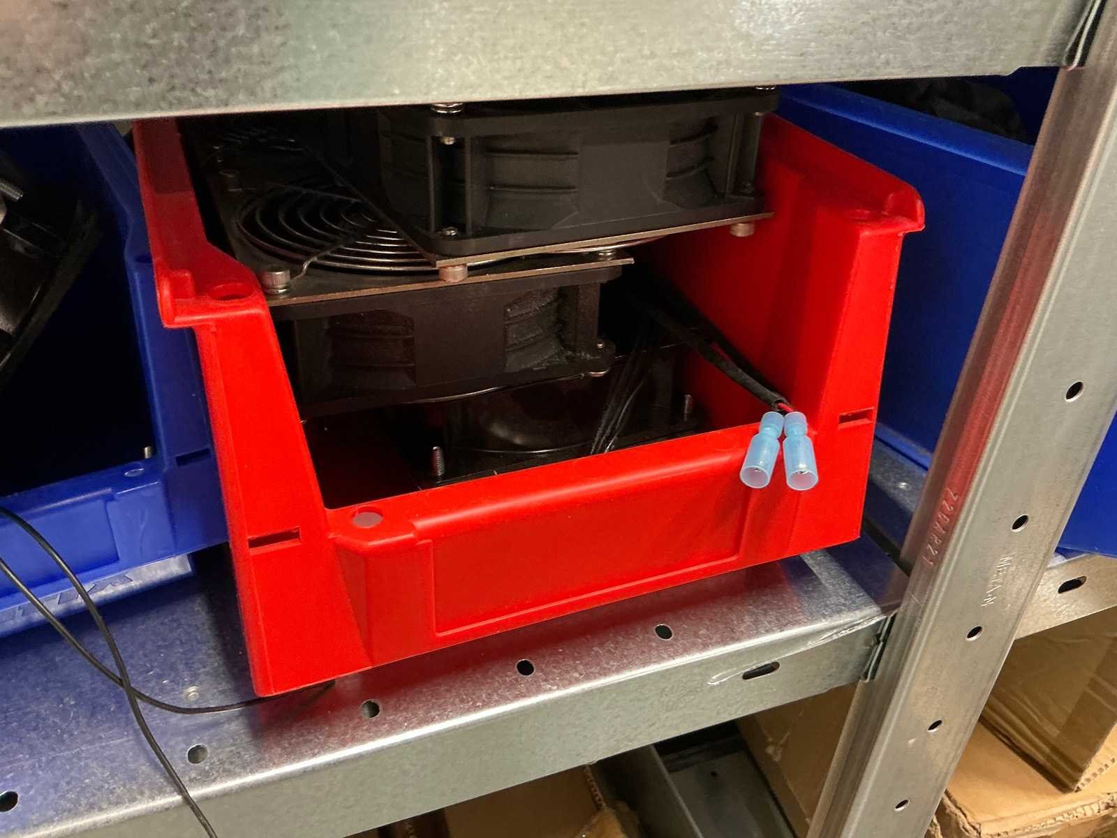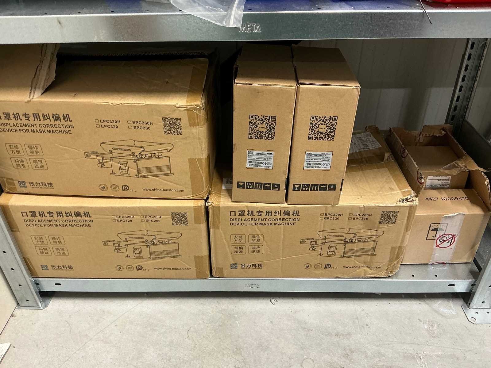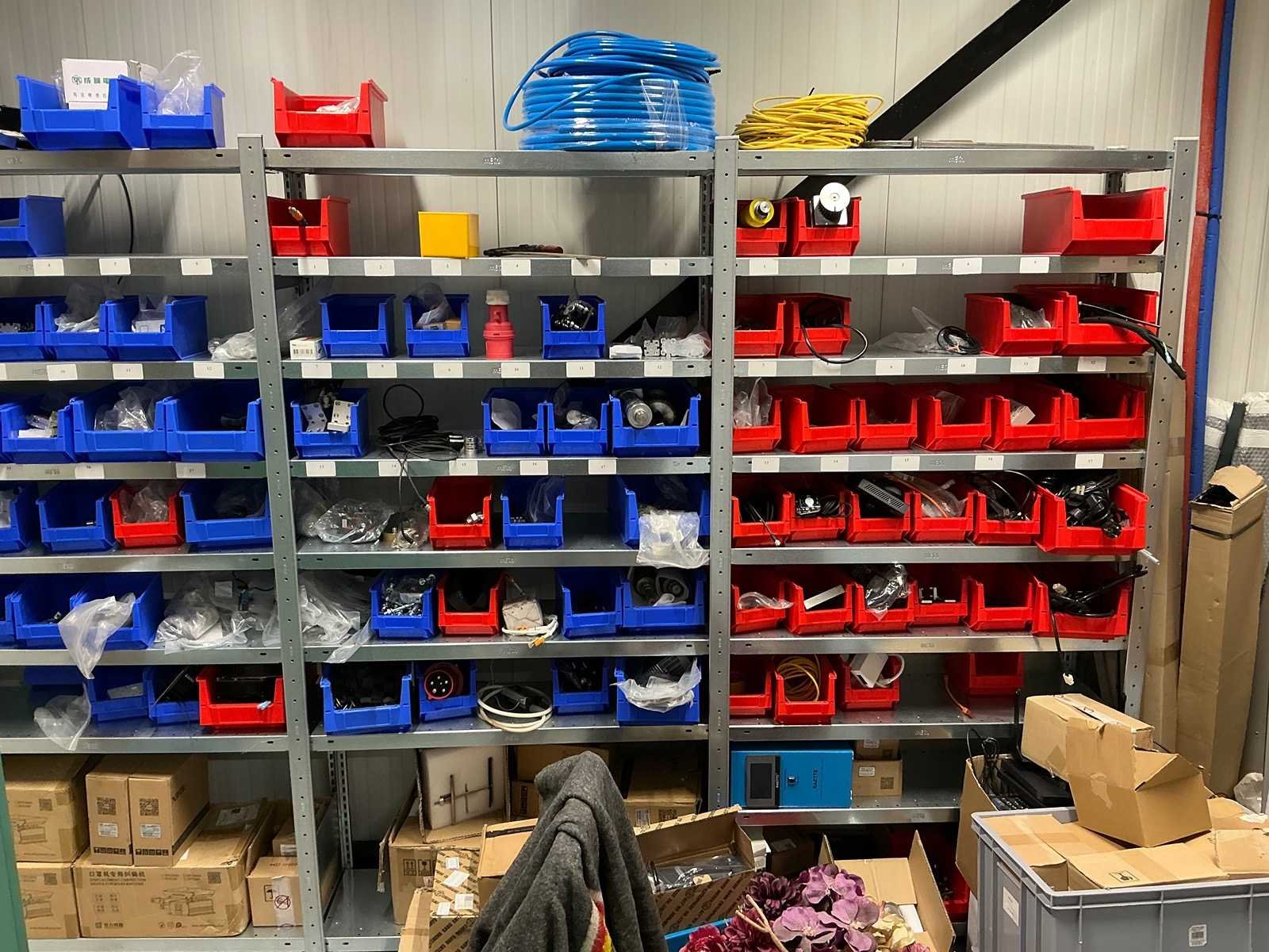 3 secties Meta legbordstelling, 2 stalen kasten met inhoud en 3 delige postvakjeskast met inhoud. Voornamelijk onderdelen voor mondmaskermachines, pneumatische onderdelen, gereedschap etc
