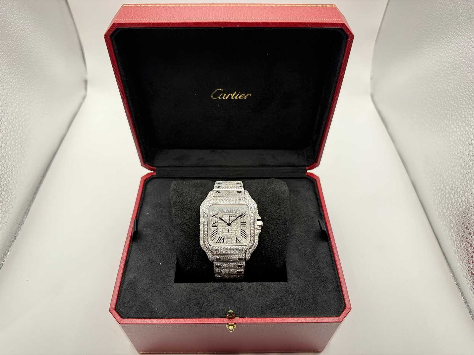 • Conditie: Gloednieuw en ongedragen van 2024 • Diamantzetting: Volledig bezet met echte diamanten, ook wel "iced out" genoemd • Complete Set: Inclusief originele Cartier doos, papieren en Cartier authenticatiepas • Referentienummer: WSSA0018 • Wijzerplaat: Iconische Cartier wijzerplaat met Romeinse cijfers en blauw stalen wijzers • Kast: Grote roestvrijstalen kast, perfect in harmonie met de fonkelende diamantzetting • Armband: Bijpassende roestvrijstalen armband, eveneens bezet met diamanten. Please note: this is a customised watch, meaning it may include components that differ from the original factory specifications. Customisation can vary widely, so we highlight the following possibilities for full transparency: Aftermarket parts The watch may include third-party components (such as bezels, dials, hands, crystals or gem settings) that are not produced by the brand owner. These parts are often added for aesthetic reasons, but are not considered original by the manufacturer. Original parts from other models Some components (e.g. dials or bracelets) may have been sourced from other genuine watches by the same brand. While these parts are authentic, they were not originally fitted to this particular model or reference, which may affect collectability or eligibility for manufacturer service. Non-original parts In some cases, customised watches may include parts that are neither original nor manufactured by the brand. These components can affect the watch’s value. We ask sellers to clearly mention such elements in their object description. We encourage all bidders to carefully review the photos and description before placing a bid. Keep in mind: customised watches may not be eligible for official service or warranty from the brand. All bids should be placed with full awareness of the customisation status described above. Merk: Cartier Model: Santos Bouwjaar: 2024 Referentienummer: WSSA0018 Materiaal kast: Steel / Diamonds Materiaal horlogeband: Steel / Diamonds Materiaal sluiting: Steel / Diamonds Wijzerplaat: Diamonds Kastmaat: 39 mm