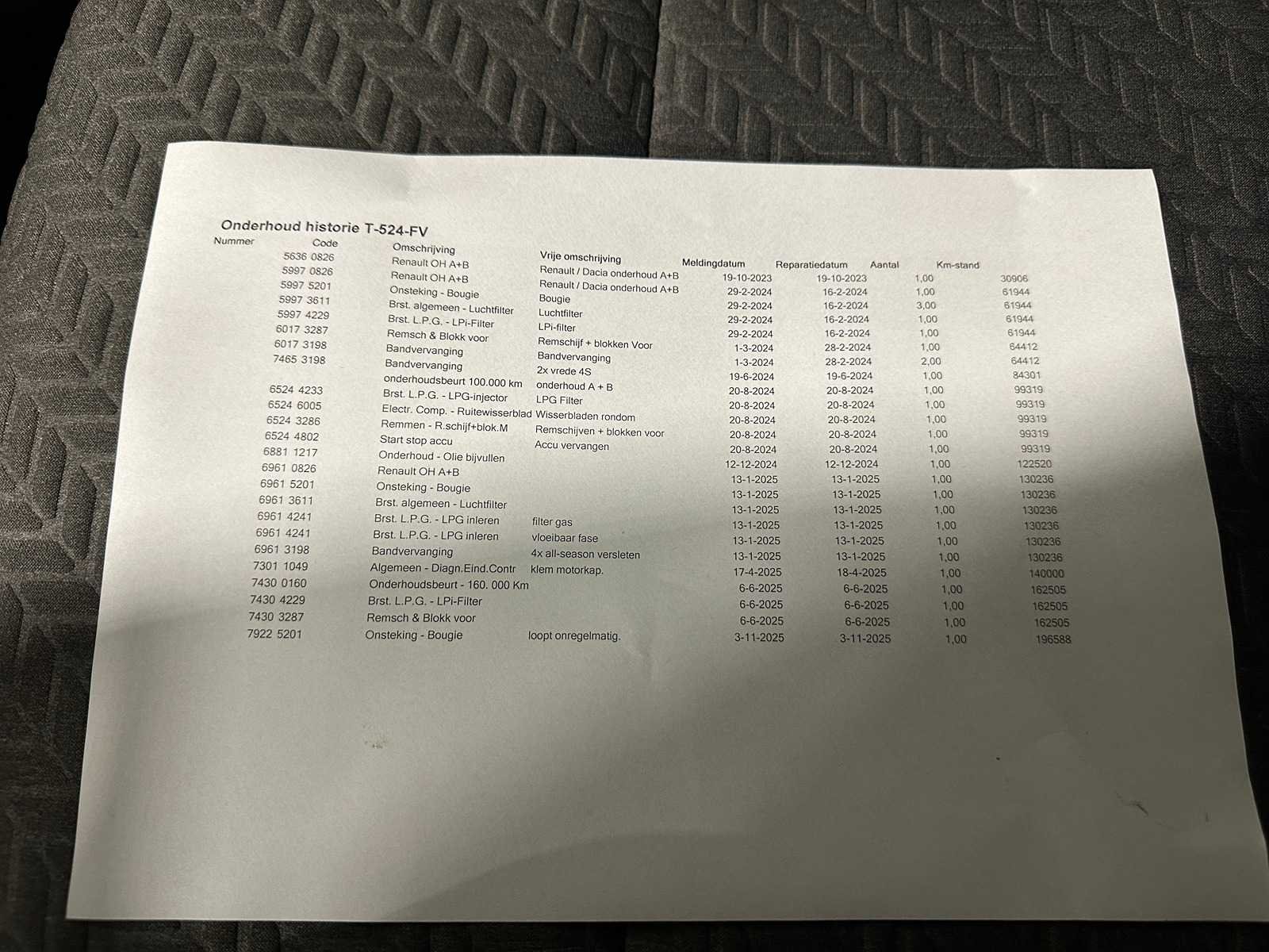 Kenteken: T-524-FV Merk: Renault Model: Clio Type: 1.0 Bouwjaar: 2023 Afgelezen kilometerstand: 196629km Cilinderinhoud: 999cc Vermogen (kW): 67kW Brandstof: Benzine/LPG NAP status: Onlogisch Datum eerste toelating: 2023-06-16 Datum eerste toelating (NL): 2023-06-16 APK vervaldatum: 2026-06-16 Aantal zitplaatsen: 5 Kleur: zwart Transmissie: Handgeschakeld Gasinstallatie: true Emissieklasse: 6 Aantal deuren: 5 Aantal sleutels: 2 Ledig gewicht: 1125kg Bruto BPM (NL): 2494€ Aantal cilinders: 3 Carrosserie: hatchback Onderhoudshistorie: Gedeeltelijk aanwezig Self drive export possible : true