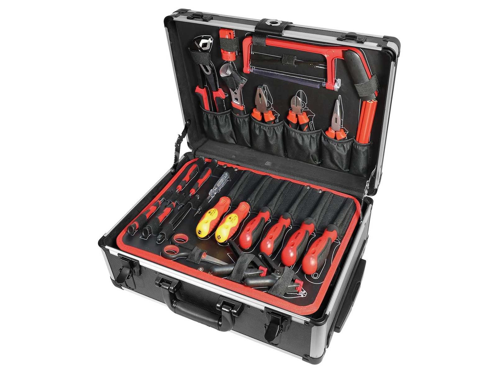 29076 Gereedschaptrolley 211 dlg (10 jaar garantie) Gereedschapstrolley 211 delig, aluminiumkoffer met hoekversteviging met 2 wielen en uitschuifbare telescopische handgreep. Gereedschap onderverdeling in 4 compartimenten. Inhoud 210 delig meest voorkomende handgereedschappen. Bezorgtermijn 7 dagen Merk: Mannesmann Type: M29076 gereedschapstrolley 211 delig