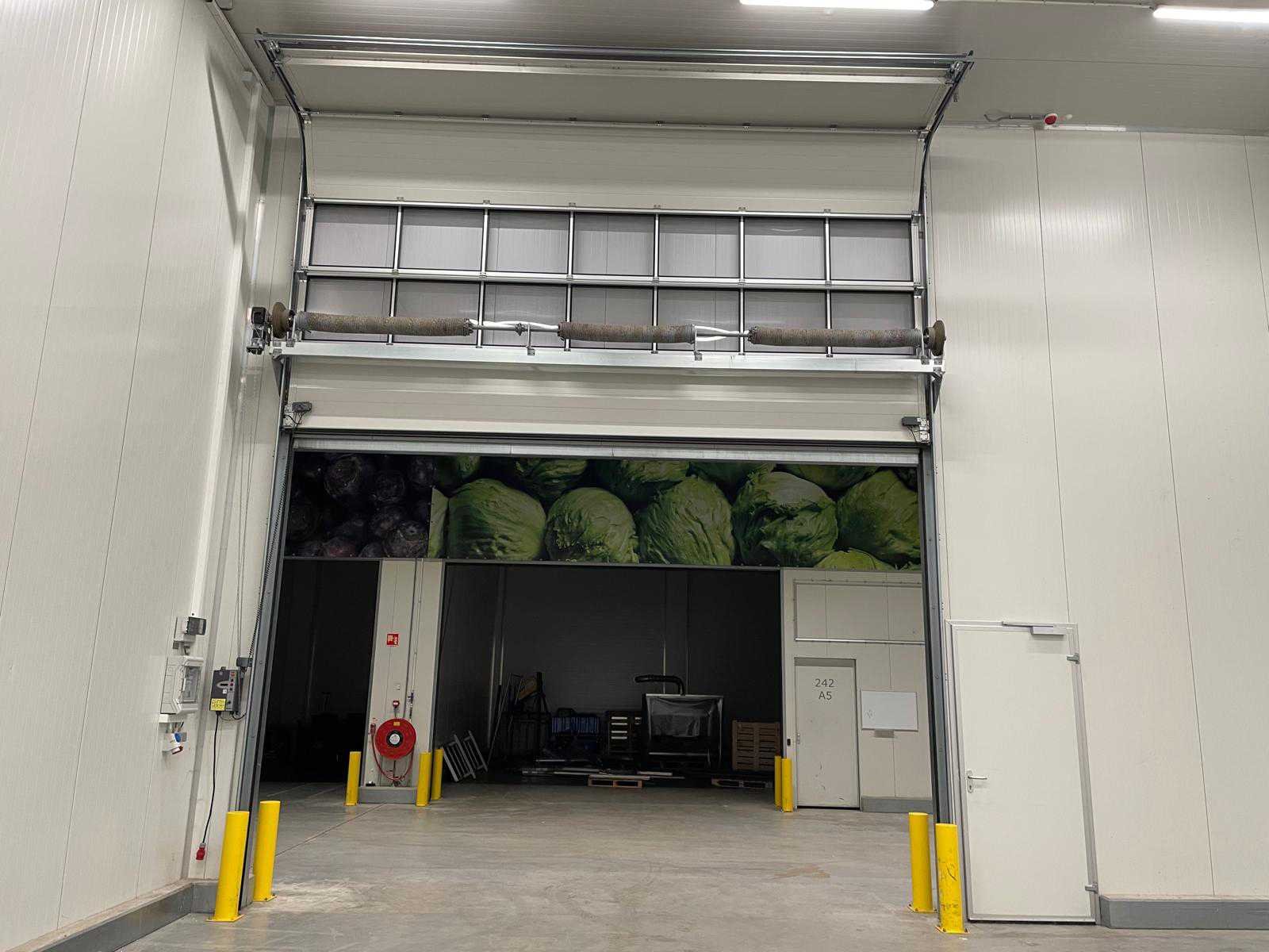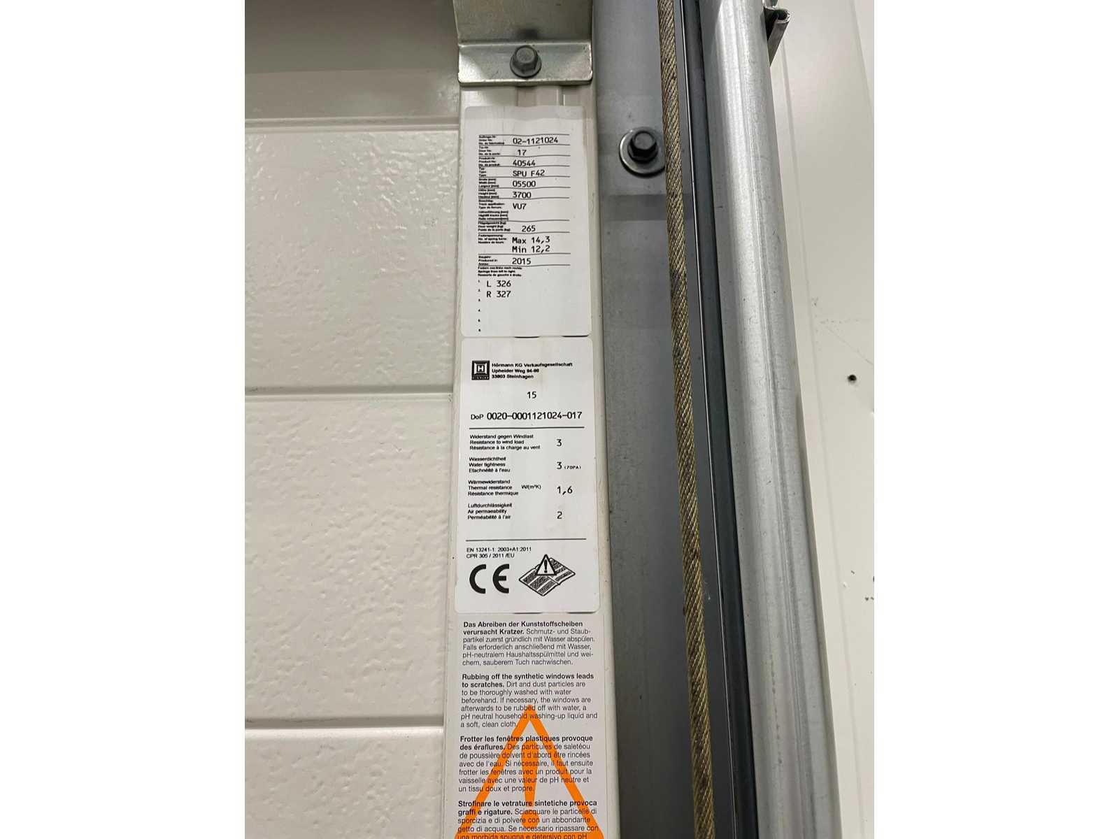 Compleet met aandrijfmotor; veren pakket; railsen; bedieningspaneel; montage materialen; deurpanelen zijn 40 mm dik; wordt gedemonteerd en transport klaar gemaakt; Binnendeur: true Buitendeur: true Beglaasd: true Afmeting h: 3700mm Afmeting b: 5500mm Bouwjaar: 2015