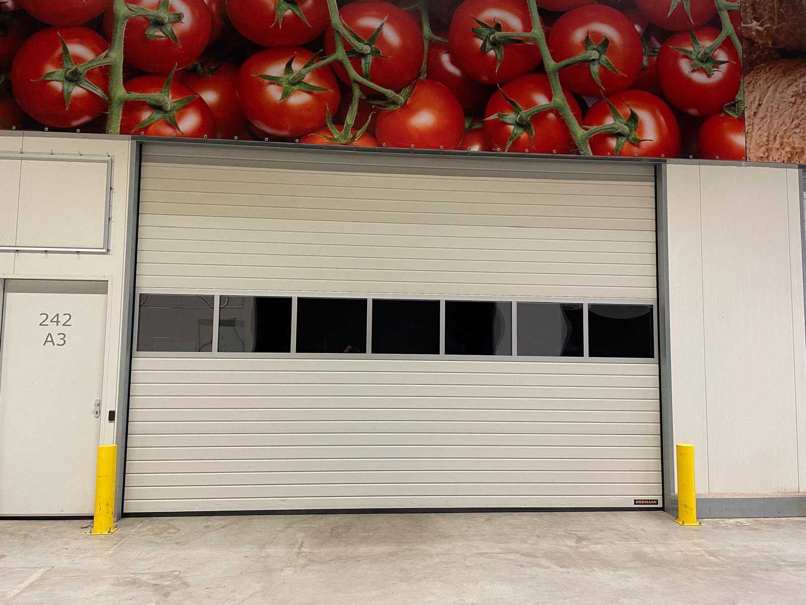 Compleet met aandrijfmotor; veren pakket; railsen; bedieningspaneel; montage materialen; deurpanelen zijn 40 mm dik; wordt gedemonteerd en transport klaar gemaakt; Binnendeur: true Buitendeur: true Beglaasd: true Afmeting h: 3700mm Afmeting b: 5500mm Bouwjaar: 2015