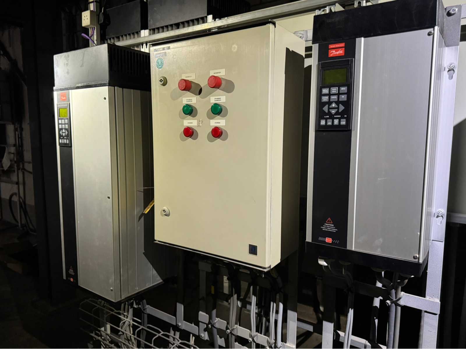 1 regelaar voor 23 KVA; 1 regelaar voor 7,60 KVA; 1 schakelkast met bediening; 1 regelaar is 810 mm hoog; 320 mm breed en 280 mm diep; 1 regelaar is 530 mm hoog; 250 mm breed en 200 mm diep; schakelkast is 600 mm hoog; 400 mm breed en 210 mm diep; wordt gedemonteerd en transport klaar gemaakt door verkoper; Merk: Danfoss